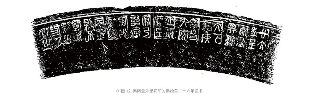 第四,山东等地出土的秦陶量外壁印有秦始皇帝二十六年诏书(图12),其文字由10个阳文印模抑盖而成。