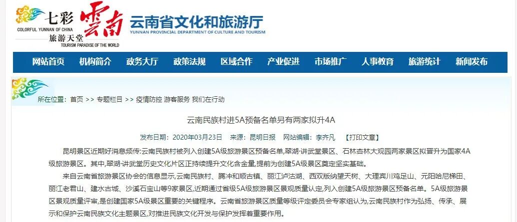 云南景区近期好消息频传! 云南西双版纳望天树等9家景区被列入 创建5A级旅游景区预备名单 翠湖·讲武堂景区、石林杏林大观园两家景区 拟晋升为国家4A级旅游景区 来自云南省旅游景区协会的信息显示,云南民族村、腾冲和顺古镇、丽江泸沽湖、西双版纳望天树、大理宾川鸡足山、元阳哈尼梯田、丽江老君山、建水古城、沙溪石宝山等9家景区,近期通过省级5A级旅游景区景观质量认定,列入创建5A级旅游景区预备名单。 5A级旅游景区景观质量评审,是创建国家5A级景区重要的关键程序。![]()