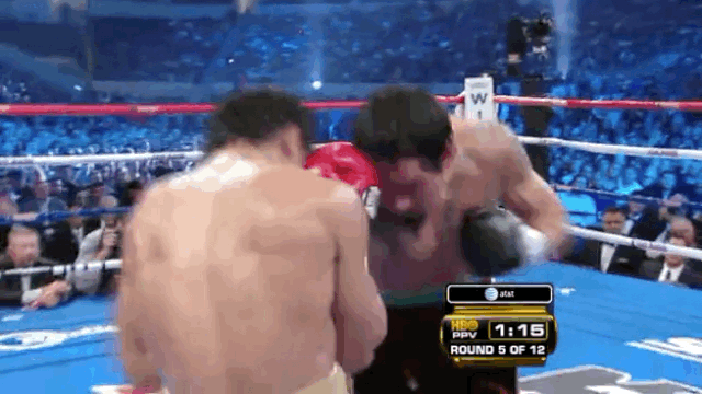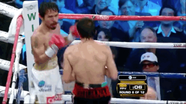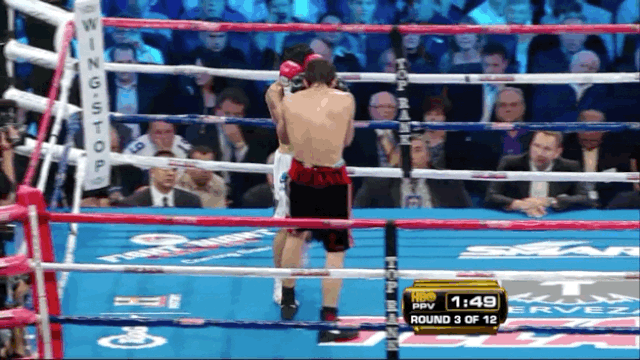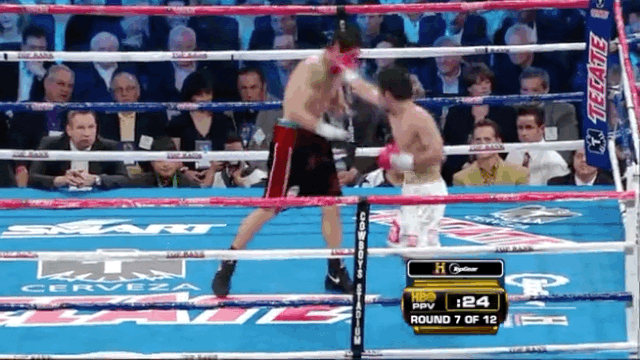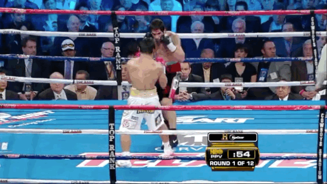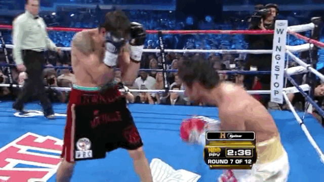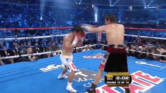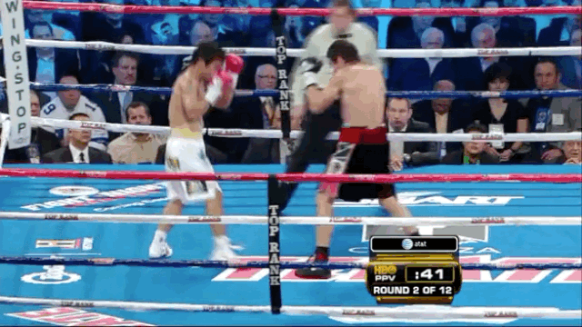 帕奎奥更进一步,他不仅使用常规的前手刺拳,还经常使用垂直刺拳。垂直刺拳的意思是,他的拳头拳眼垂直于地面,而这一细节使得他很容易打破对手的防守姿势。(这很像李小龙截拳道中吸收进来的咏春日字冲拳,实际上帕奎奥也确实是李小龙的死粉,这个另外的故事我们有机会再讲。)