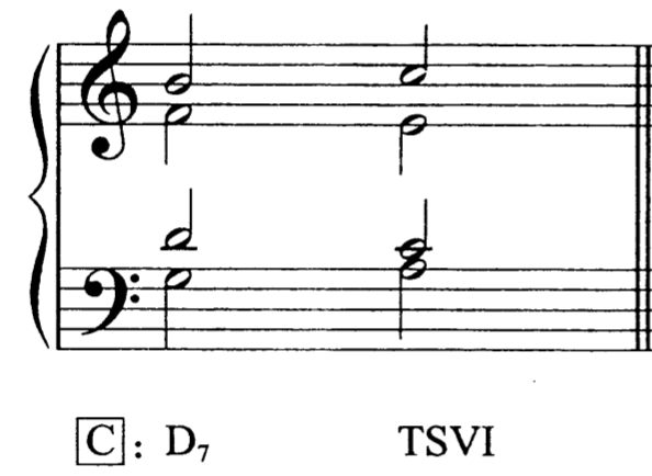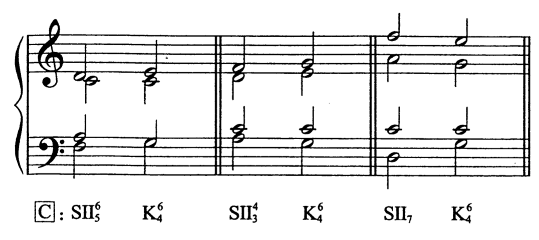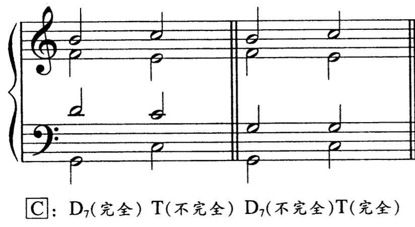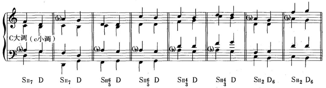类似于六和弦跳进一样,可以根音跳进到主和弦的根音,五音跳进到主和弦的五音,也可以双重跳进