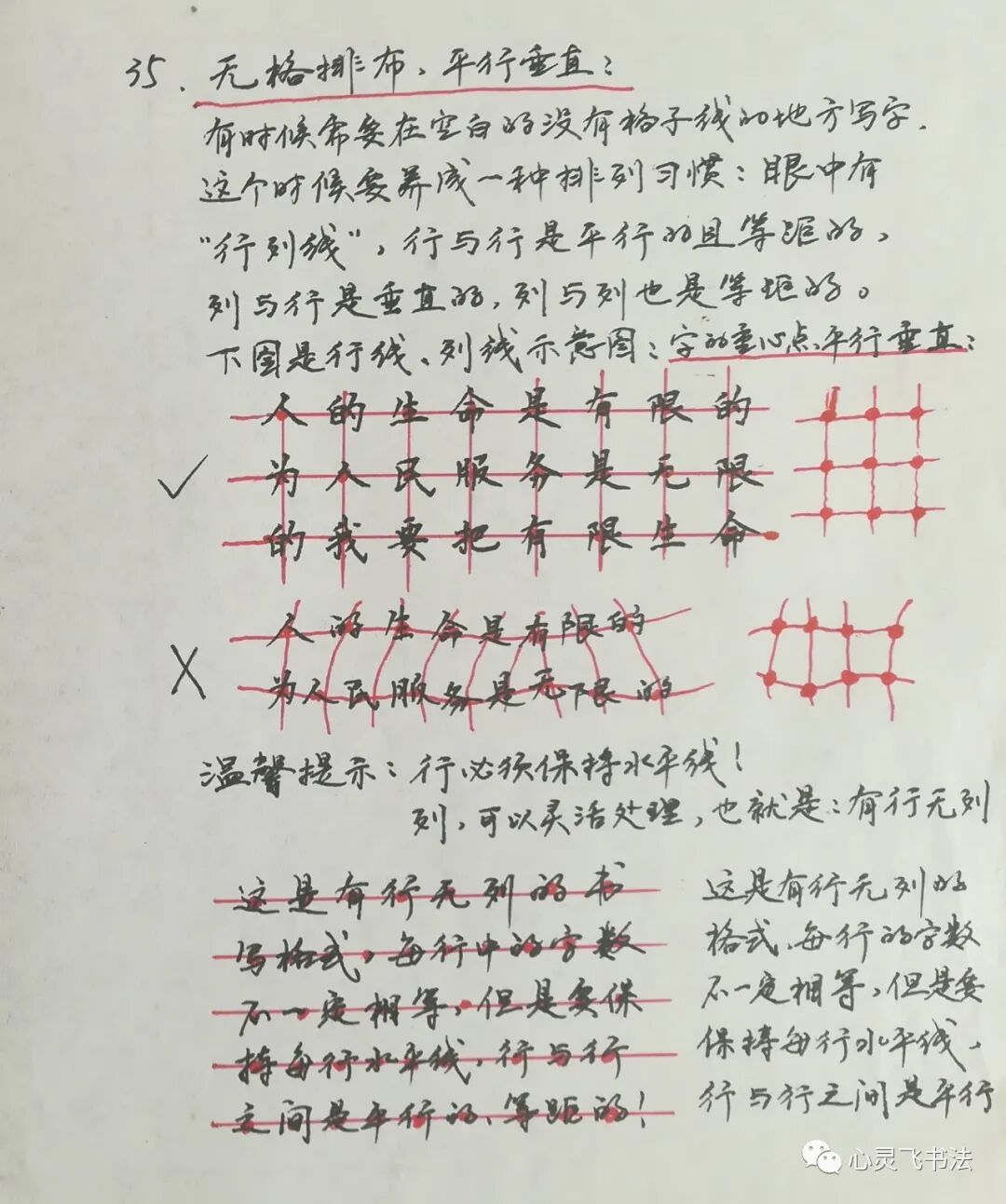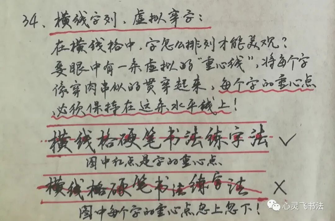 横线格如图所示,字与字之间,要做到字的重心点排在一条看不见的水平线上,这条水平线,是在格子的中间,与上下两条格子线平行。如果重心点排列杂乱,就会出现图中打错号的样子,那样就看起来不美观不整齐。