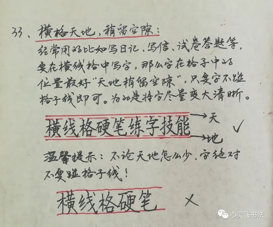 横线格图中所说的这个方法是:横格天地,稍留空隙。意思是,在横线格里写字的时候,要把字的位置安排得当。这种横线格,平时经常使用,比如写日记,做笔记,试卷答题等等。如图所示,字在格子里,要求不碰格子线,也就是,上面留天,下面留地,不管留多少空隙,字是不能碰格子线的,否则就看着不利落,有时候还不易识别。