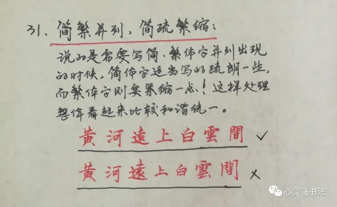 接下来,谈的是当遇到需要写繁体字的时候,繁体字与非繁体字怎么写得和谐。如图所示,这一行字之中,有繁体字,也有简体字,那么,注意,简体字要适当写得舒朗一些,而繁体字则要写得紧缩一点。