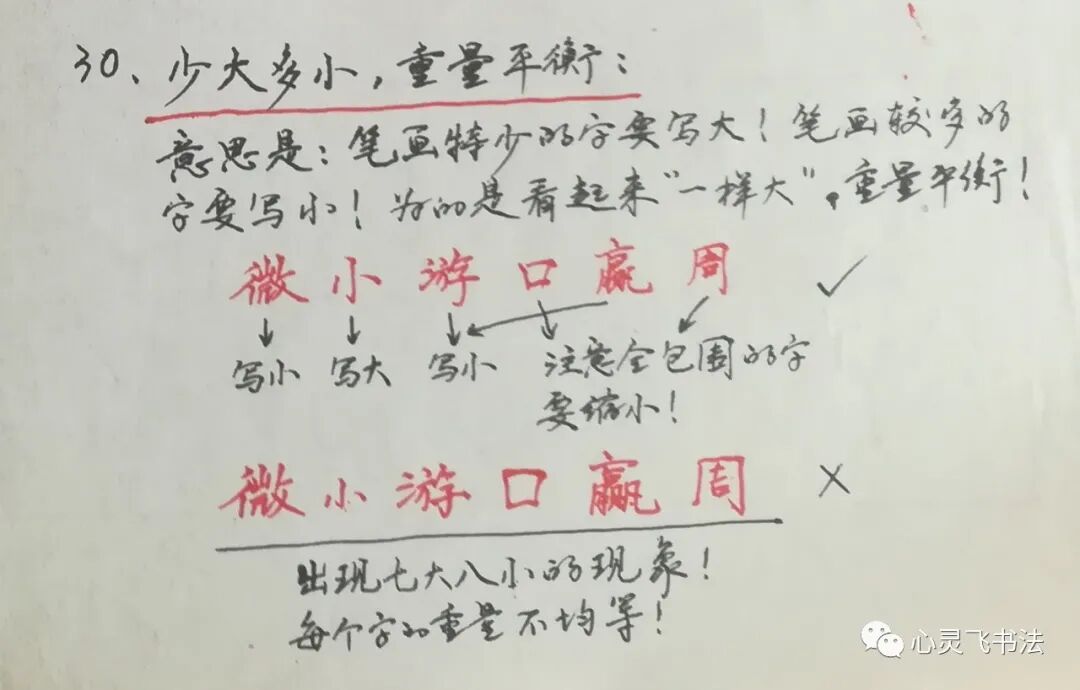 下面要讲的是,笔画多的字与笔画少的字在一起,怎么写得协调统一。正确的写法是,笔画很少的字要写大,笔画很多的字要写小,概括成“少大多小”。如图所示,“小”字,笔画很少,就要写得大,而“微、游、赢”字,笔画很多,就要写小。这样整体看起来才感觉到“一样大”,注意,这里所说的“一样大”是指视觉上的重量感一样大,而不是面积一样大。