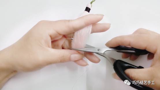 如上图,夹住流苏,注意,夹的时候捋顺流苏再剪。剪到你需要的长度。我整个流苏留的长度是7cm。