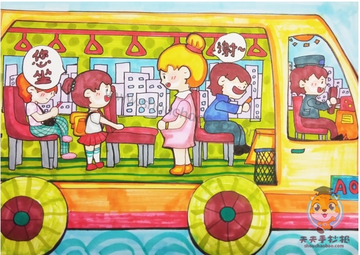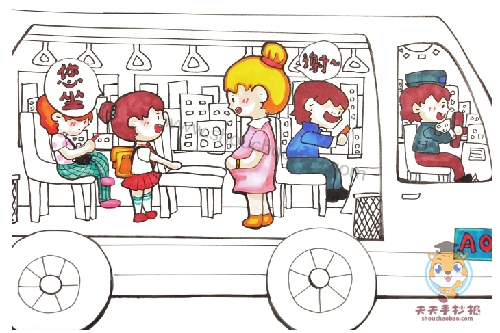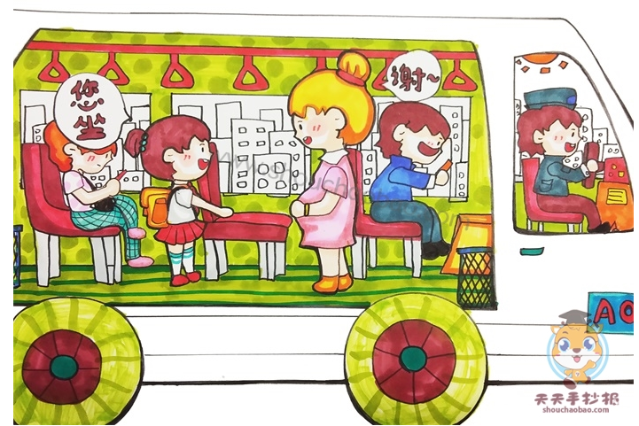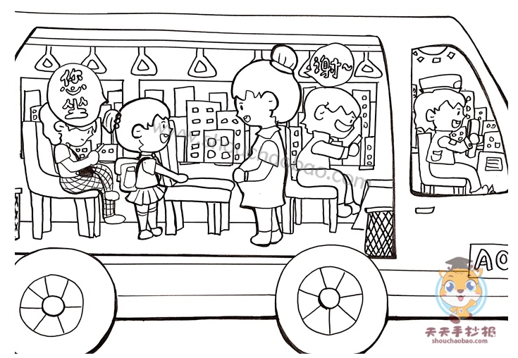 3、在窗户里画上其他乘客和窗户外面的大楼,画上公交椅子和公交拉环,画出开着车的司机师傅,给对话框上写上字。