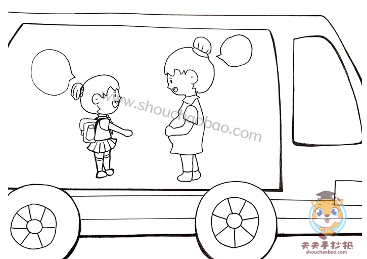 2、在车门里面画出一个孕妇和背着书包系着红领巾站着的小女孩,给他们画上对话框。