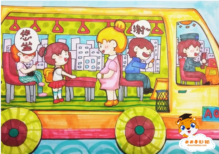 6、给车身涂上颜色,背景涂上蓝色,背景加上图案,文明礼仪儿童画就完成了,是不是既简单又好看呢。
