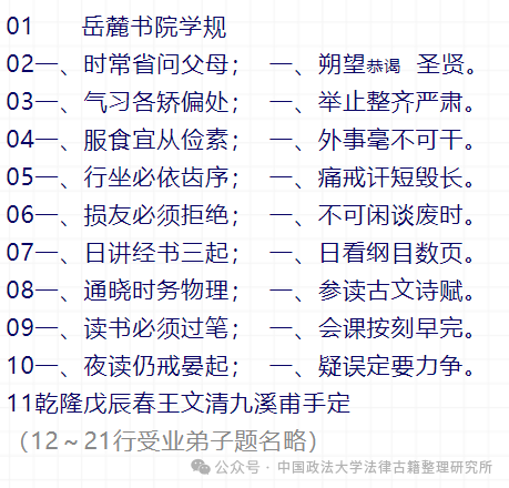 2 0 2 4 《岳麓书院学规》 【时间】乾隆十三年(1748年)春 【地点】 岳麓书院学规 岳麓书院学规湖南长沙岳麓书院 【评述】 碑嵌于墙壁,高58厘米,宽63厘米。碑文21行,其中学规11行,题名10行。学规由岳麓书院山长王文清手定,从为人和治学等方面对书院学生提出了切实可行的18条要求。受业弟子曹盛朝等47人出资勒石。 在日历中考古丨在时光中惊喜 法制文物日历 | 二月二十九日 · 清 ·《福山港立公秤剔弊安商碑》 法制文物日历 | 二月二十八日 · 清 ·《卫氏舍田碑记》 法制文物日历 | 二月二十七日 · 清 ·《永禁损坏圩堤碑》 法制文物日历 | 二月二十六日 · 清 ·《潘氏助田之碑》 法制文物日历 | 二月二十五日 · 清 ·《斋田记》 法制文物日历 | 二月二十四日 · 清 ·《西域寺下院兴隆寺地亩碑记》 法制文物日历 | 二月二十三日 · 清 ·《山陕会馆碑记》 法制文物日历 | 二月二十二日 · 清 ·《水陆会置地碑文记》 法制文物日历 | 二月二十一日 · 清 ·《新置救生红船捡埋枯骨碑记》 法制文物日历 | 二月二十日 · 清 ·《府县两学添置会田修葺学宫碑记》 法制文物日历 | 二月十九日 · 清 ·《万民感恩赫道台禁伐碑记》 法制文物日历 | 二月十八日 · 清 ·《永禁开垦以畜水源碑》 欢迎关注 中国政法大学法律古籍整理研究所 获取更多学术信息
