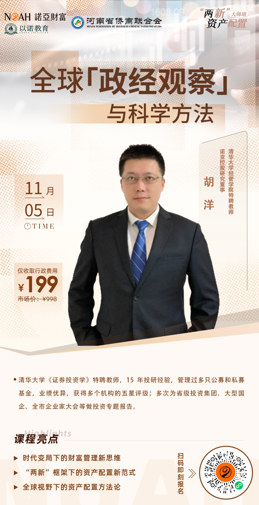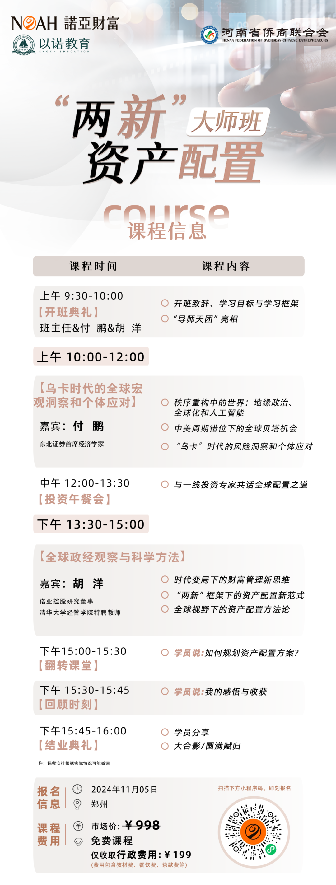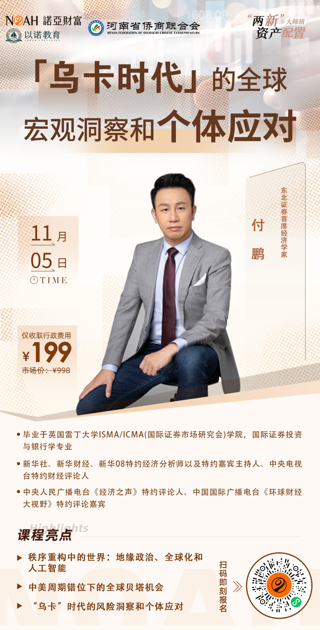 近期,政策层面对股市、房地产、和经济的扶持逐渐升温,刺激的力度远超预期。一系列组合拳出台之后,全方位点燃了投资者的信心。9月24日以来,A股市场多日上涨,在多重利好的刺激下,赚钱效应极好。 △截图自10月18日 房地产政策方面,10月21日消息,5年期以上LPR降至3.6%,今年以来,更是累计下降了60个基点,对新、老房贷都是重大利好。企业和居民贷款利率下降,促进社会融资成本降低,对实体经济也有着巨大的提振作用。 在全球形势变局丛生、中国经济不断修复的背景下,中国股市快速涨跌背后是否有机会?市场向好,信心不足或实际需求不足的问题解决了吗?中国经济未来趋势如何研判?这些投资者最关心的问题,都将在付鹏的专场课程中得到解答。 付鹏是谁?他是拥有百万粉丝且热度持续攀升的经济学家,毕业于英国雷丁大学ISMA/ICMA(国际证券市场研究会)学院,是新华社、新华财经、新华08特约经济分析师以及特约嘉宾主持人、中央电视台特约财经评论人,也是中央人民广播电台《经济之声》特约评论人、中国国际广播电台《环球财经大视野》特约评论嘉宾。 他曾以22分钟封神演讲火爆全网,其“不要寄希望于美国降息,中国经济就会好转”“真正的投资更多发生在除了本国之外的全世界其他一些国家”“老龄化带来的产业增长永远无法抵消出生率下降带来的消费倒退”“消费是一种偏好,不需要刺激,人没钱了自然不会消费”等观点,以敢说真话、接地气的态度,深受广大人民的欢迎。 11月5日,河南省侨商会充分发挥自身独特财富课堂优势和桥梁纽带作用,特别联合诺亚财富策划的“两新”资产配置大师班即将开课,将邀请资深经济学家、东北证券首席经济学家付鹏,讲述《乌卡时代的全球宏观洞察和个体应对》,以其对全球宏观的深刻洞察,对地缘政治、全球化和人工智能等全球热点事件背后的核心因素和逻辑的深度剖析,为会员企业赋能,让广大会员企业对当前经历复杂多变的局势和影响,有清晰和高纬的认知。 认知的升维,才能应对外部环境的变化,新的世界格局下,微观的个体应该如何应对?资产配置又应该秉持怎样的新范式?所谓“授人与鱼,不如授人与渔”,本次课程中,诺亚控股研究董事、清华大学经管学院特聘教师胡洋将通过《全球政经观察与科学方法》以两新资产配置为框架,结合全球政治、经济等,用“两新”、“三有金字塔”以及”四类账户”的配置模型,为学员提供了一个具体的、可复制的、新质保障力和新质生产力的资产配置实战方法论。 收官2024,布局2025,本次大师班专场人数限制50人,正式会员优先抢座通道已开启! 课程时间:2024年11月5日9:30---16:00(9:00签到,9:30准时开始) 课程地点:郑州龙子湖仟那元熙酒店三楼元熙宴会厅(郑州市郑东新区龙子湖智慧岛尚贤街32号A座) 报名方式:课程免费,仅收取行政费用199元(含酒店自助午餐),扫码报名支付。 *温馨提示:因课程由诺亚财富承接定制,非会员系统自动引导入会,入会需要实名认证,报名后可实名拉取数据