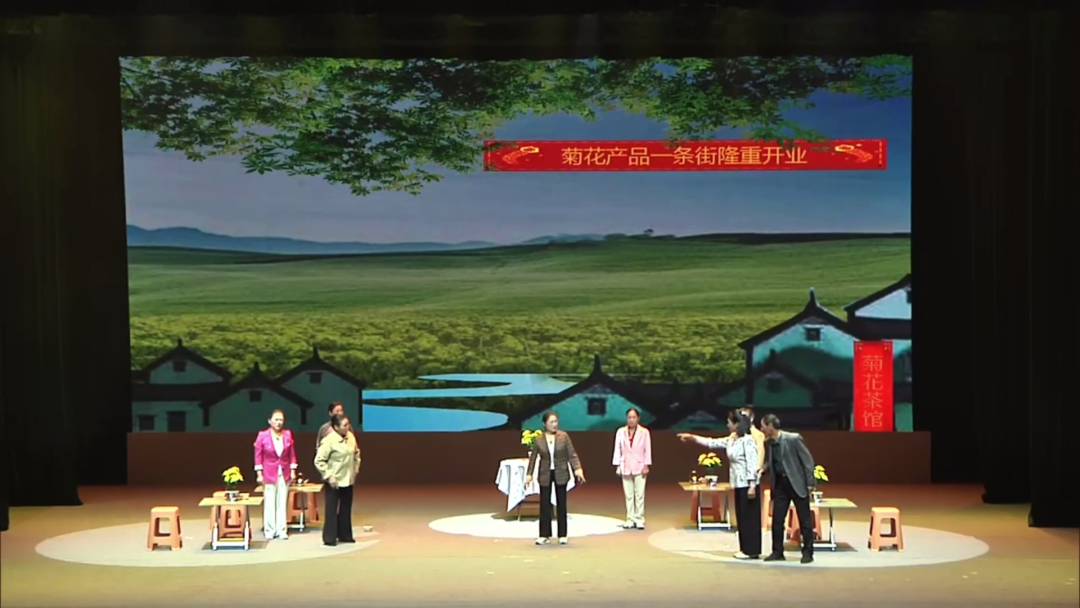 《菊花赋》以中原农村为背景,以菊花产业发展为主线,巧妙地采用现实主义与浪漫主义相结合的艺术风格。在现实主义层面,生动真实地再现了农村生活的点点滴滴;浪漫主义则体现在对菊花文化富有诗意的理想化描绘中。舞台上,生活化的细节与诗意化的场景相得益彰,完美融合了真实与艺术,让观众仿佛置身于那个充满希望与挑战的菊花庄。