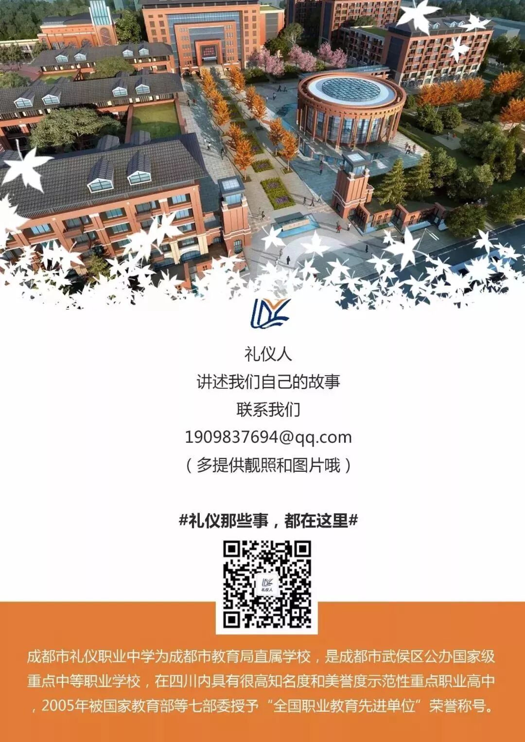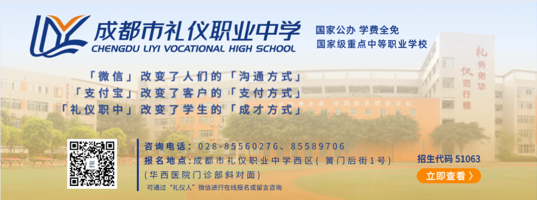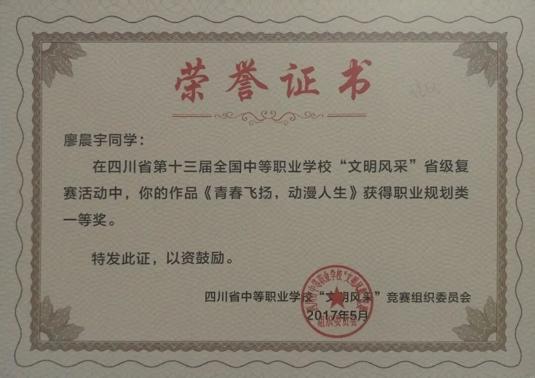 七月, 见证成长的烙印, 承载毕业的硕果。 又是一年毕业季, 又是一年追忆往昔。 在“绿树阴浓夏日长”的七月, 我们回望菁菁校园, 念往昔礼仪学子, 寄语青年人美好明天。 姓名:廖晨宇 班级:2017届计算机大专班 班主任:周蕴兰 2014年,进入成都市礼仪职业中学,学习计算机应用专业。经过两年的学习,开始参加各种专业技能类比赛。尤其擅长动画制作、3DMAX、影视后期处理等。生活中的廖晨宇乐于助人,兴趣广泛。在校期间多次参加四川省和成都市各级各类比赛,获得佳绩。 2017年,升入成都市职业技术学院学子,主修建筑模型电脑设计。 2016年11月,参加武侯区第六届中等职业学校“文明风采”竞赛,动画作品《帮助他人,快乐自己》获微视频类一等奖; 2017年1月,参加第十三届“武侯杯电脑制作比赛”,动画作品《帮助他人,快乐自己》获得一等奖; 2017年1月,参加第十三届“武侯杯电脑制作比赛”,作品《青春不在,我任在》获得一等奖; 2017年8月,参加成都市“第十三届电脑制作比赛”,获得一等奖; 2017年5月,参加四川省第十三届全国中等职业学校“文明风采”大赛,作品《青春飞扬,动漫人生》获得职业规划类一等奖; 2018年3月,参加“2018年成都双遗马拉松”志愿服务,获得志愿者证书。 2018年9月,荣获成都市职业技术学院学年度奖学金; 目前在四川创数智慧科技股份有限公司,主要从事三维模型制作工作。参与项目有:亚青寺数字城市规划项目、淄博城市规划项目、仁寿城市规划项目、徐州地铁模型规划项目 树立终身学习的观念,在实践中,不断探寻和超越自我,在信息技术行业实现人生的价值。 愿少年们终究成为更好的自己 愿你们 心里有火, 眼里有光, 奔涌吧,后浪! 策划:万曦 撰稿:周蕴兰 审核:周蕴兰 报名地址 ![]()