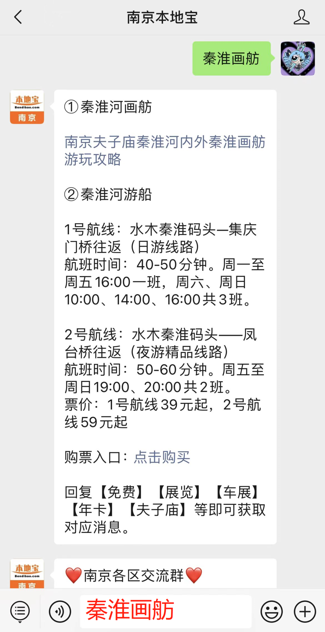 在南京本地宝回复【邮轮】即可获取购票入口。