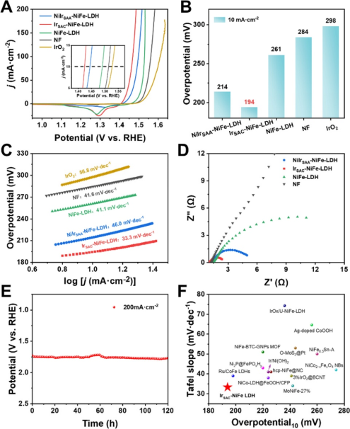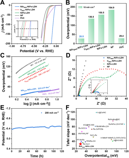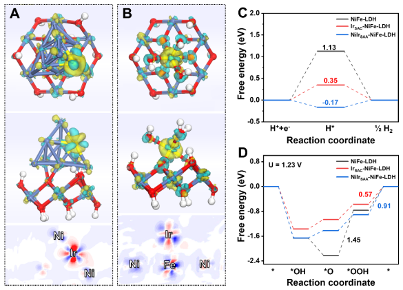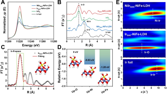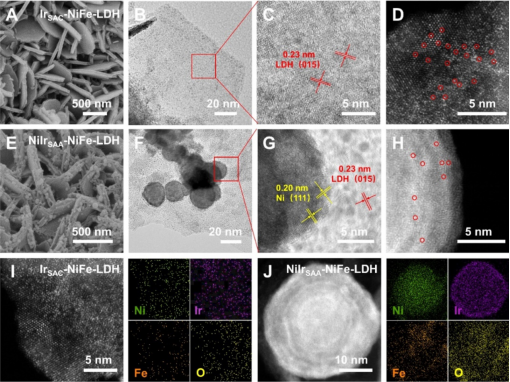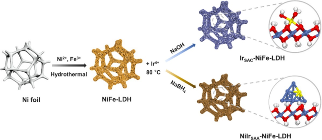 论文DOI:10.1021/acscatal.3c02628 本文成功合成了Ir单原子负载的NiFe-LDH(IrSAC-NiFe-LDH)和NiIr单原子合金负载的NiFe-LDH(NiIrSAA-NiFe-LDH),NiIrSAA-NiFe-LDH和IrSAC-NiFe-LDH分别表现出优异的析氢(HER)性能和析氧(OER)性能。将NiIrSAA-NiFe-LDH(阴极)和IrSAC-NiFe-LDH(阳极)耦合用于电催化整体水分解,在10 mA·cm-2的电流密度下的池电压仅为1.49 V,并具有出色的稳定性,其性能优于商业Pt/C和IrO2组成的电解池(1.60 V)和以往报道的大多数整体水分解催化剂。其制氢成本为1.12 美元/千克H2,低于美国能源部设定的目标(2美元/千克H2)。并通过实验分析和DFT计算详细讨论了NiIrSAA-NiFe-LDH在HER和IrSAC-NiFe-LDH在OER中的构效关系。随着化石燃料的快速消耗和日益严重的环境问题,寻求清洁和可再生能源变得更加重要和迫切。氢能因其高能量密度、可再生性和环境友好性而被认为是缓解能源危机和环境污染最具吸引力的绿色能源。电催化整体水分解是推动太阳能或电能向清洁氢能转变的有效策略。目前,最广泛使用的商业HER和OER催化剂分别是Pt/C和IrO2。然而,稀缺性和较差的稳定性限制了它们的进一步应用。为了实现由美国能源部提出的氢气生产成本低于2美元/千克的目标,应开发同时具有高活性、长耐久性和低成本的催化剂。单原子催化剂由于其高原子利用率、均匀的金属活性位点和可调节的配位环境而受到广泛关注,并被认为是商业Pt/C和IrO2的理想替代品。由于单个原子固有的高表面能,使得它们在反应过程中倾向于聚集。因此,选择合适的载体有利于稳定单原子并协同促进反应进程。层状双氢氧化物(LDH)是稳定单原子的理想载体,其中NiFe-LDH因其在OER过程中的高活性而尤其受到关注。Ir单原子被认为可以通过调节反应中间体的吸附来显著提高OER活性。同时,HER的能垒可以通过单个分散的Ir原子来调节,其合金化可进一步调控Ir对氢中间体的吸附能力。因此,以单原子形式负载Ir以提高整体水分解性能是一种可行的方法。(1)通过球差电镜和同步辐射等表征证明成功合成了Ir单原子负载的NiFe-LDH (IrSAC-NiFe-LDH)和NiIr单原子合金负载的NiFe-LDH (NiIrSAA-NiFe-LDH);(2)NiIrSAA-NiFe-LDH和IrSAC-NiFe-LDH在碱性介质中10 mA·cm-2电流密度下分别实现28.5 mV的超低HER过电位和194 mV的超低OER过电位;(3)NiIrSAA-NiFe-LDH(阴极)和IrSAC-NiFe-LDH(阳极)组成的两电极体系用于电催化整体水分解显示出低的池电压和高的稳定性,并且其制氢成本为1.12 美/千克H2,低于美国能源部设定的目标(2美元/千克H2);