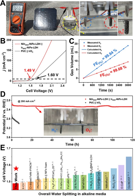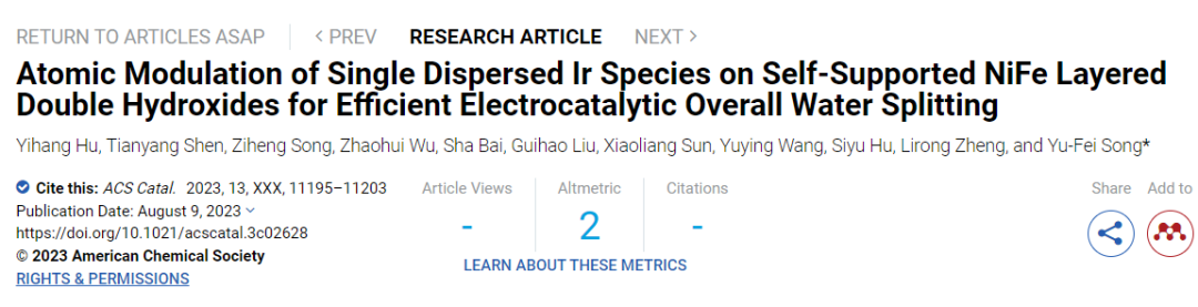 (4)在HER过程中,NiIrSAA-NiFe-LDH优化了氢中间体的吉布斯自由能(ΔGH*),从而降低了HER过电位;在OER过程中,IrSAC-NiFe-LDH降低了O2释放的能垒从而提高了OER性能。如scheme 1 所示,本文通过简单的水热法在泡沫镍(NF)表面原位生长NiFe-LDH。随后通过控制pH水热浸渍得到IrSAC-NiFe-LDH。NiIrSAA-NiFe-LDH则是通过NaBH4还原NiFe-LDH得到。▲Scheme 1. Schematic Diagram of the Synthetic Process of IrSAC-NiFe-LDH and NiIrSAA-NiFe-LDH.对IrSAC-NiFe-LDH和NiIrSAA-NiFe-LDH进行XRD,SEM和HRTEM表征证明NiFe-LDH基底在NF上的成功合成。通过高角度环形暗场扫描透射电镜(HAADF-STEM)和X射线吸收精细结构(XAFS)光谱组合分析证明Ir在NiFe-LDH纳米片上的单分散和Ir在合金颗粒中的单分散。通过EXAFS拟合结果和DFT计算(Figure 2)证明在IrSAC-NiFe-LDH中Ir单原子以Ir-O6的配位形式位于LDH中的Fe3+上方。▲Figure 1. Morphology and structural characterization of IrSAC-NiFe-LDH and NiIrSAA-NiFe-LDH. (A) SEM image, (B, C) HRTEM images, (D) HAADF-STEM image, and (I) corresponding elemental mapping diagram of IrSAC-NiFe-LDH. (E) SEM image, (F, G) HRTEM images, (H) HAADF-STEM image, and (J) corresponding elemental mapping diagram of NiIrSAA-NiFe-LDH.▲Figure 2. Characterization of electronic structure. (A) Ir L3-edge XANES spectra of NiIrSAA-NiFe-LDH, IrSAC-NiFe-LDH, IrO2, and Ir foil. (B) EXAFS spectra at the Ir L3-edge of IrSAC-NiFe-LDH, IrO2, NiIrSAA-NiFe-LDH, and Ir foil. (C) The first shell (Ir–O) fitting of the EXAFS spectrum for IrSAC-NiFe-LDH. (D) Relative energies and configurations of the Ir atom at different sites in IrSAC-NiFe-LDH. (E) The WT-EXAFS of IrSAC-NiFe-LDH, NiIrSAA-NiFe-LDH, and Ir foil.将合成的催化剂用于碱性HER(Figure 3)。在10 mA·cm-2下,NiIrSAA-NiFe LDH表现出最低的过电位,仅为28.5 mV,可与商业Pt/C相媲美(29.4 mV),并优于大多数报道的碱性电解质中的HER电催化剂。对合成的催化剂也进行了碱性OER的性能评估(Figure 4)。在10 mA·cm-2下,IrSAC-NiFe-LDH表现出194 mV的超低过电位和33.3 mV·dec-1的Tafel斜率,性能显著优于商业IrO2(298 mV, 56.8 mV·dec-1)和其他报道的OER电催化剂。▲Figure 3. HER performance of the as-prepared electrocatalysts and references in 1 M KOH. (A) LSV curves. (B) Comparison of overpotential at 10 mA cm–2. (C) Tafel plots. (D) EIS curves. (E) Chronopotentiometric curve of NiIrSAA-NiFe-LDH at 200 mA cm–2. (F) Overpotential comparison of various state-of-the-art HER catalysts at 10 mA cm–2 in 1 M KOH.▲Figure 4. OER performance of the as-prepared electrocatalysts and references in 1 M KOH. (A) LSV curves. (B) Comparison of overpotential at 10 mA cm–2. (C) Tafel plots. (D) EIS curves. (E) Chronopotentiometric curve of IrSAC-NiFe-LDH at 200 mA cm–2. (F) Overpotential comparison of various state-of-the-art OER catalysts at 10 mA cm–2 in 1 M KOH.由NiIrSAA-NiFe LDH优越的HER活性和IrSAC-NiFe-LDH优异的OER性能启发,将NiIrSAA-NiFe LDH作为阴极和IrSAC-NiFe-LDH作为阳极耦合用于整体水分解,10 mA cm–2的电流密度下仅需要1.49V的低电池电压,显著低于商业Pt/C和IrO2组成的电解池(1.60 V)和以往报道的大多数整体水分解催化剂。在200 mA·cm-2的电流密度下保持120 h,具有出色的稳定性。该电解池的制氢成本为1.12 美/千克H2,低于美国能源部设定的目标。▲Figure 5. Performance of overall water splitting. (A) Actual operation diagram of solar-driven electrocatalytic overall water splitting with the NiIrSAA-NiFe-LDH||IrSAC-NiFe-LDH electrolyzer; The partial enlargement showed the phenomena occurring on the two electrodes during the process. (B) LSV polarization curves of the NiIrSAA-NiFe-LDH||IrSAC-NiFe-LDH electrolyzer and the commercial Pt/C||IrO2 electrolyzer for overall water splitting. (C) Comparison of experimental gas production and theoretical gas production. (D) Long-term stability test of the designed electrolyzer and commercial Pt/C||IrO2 electrolyzer at a constant current density of 200 mA cm–2. (E) Performance comparison of the NiIrSAA-NiFe-LDH||IrSAC-NiFe-LDH electrolyzer and other reported electrolyzers at 10 mA cm–2. The references of this figure are given in Table S8.在HER中,NiIrSAA-NiFe LDH的Tafel斜率证明2H* → 2* + H2是决速步。通过DFT计算表明,NiIrSAA-NiFe LDH通过Ir单原子和Ni的强电子相互作用优化了对H中间体的吉布斯自由能。在OER中,IrSAC-NiFe-LDH上的Ir单原子调控了Ni的电子结构,使Ni表现出更明显的缺电子性质,有利于*OOH末端H的脱除,从而降低了反应能垒,促进了OER反应动力学。▲Figure 6. Top and side views of differential charge densities of (A) NiIrSAA-NiFe-LDH and (B) IrSAC-NiFe-LDH. Cyan and yellow isosurfaces indicate electron accumulation and electron depletion, respectively. Gibbs free energy diagrams for (C) the HER at U = 0 and (D) OER at U = 1.23 V on NiIrSAA-NiFe-LDH, IrSAC-NiFe-LDH, and NiFe-LDH.综上所述,该工作成功合成了Ir单原子负载的NiFe-LDH和NiIr单原子合金负载的NiFe-LDH,NiIrSAA-NiFe-LDH具有优异的HER活性,IrSAC-NiFe-LDH具有优异的OER活性,将NiIrSAA-NiFe-LDH(阴极)和IrSAC-NiFe-LDH(阳极)耦合的电解池用于整体水分解,其催化性能优于报道的大多数电催化剂。并通过实验结果和理论计算揭示了NiIrSAA-NiFe-LDH在HER和IrSAC-NiFe-LDH在OER中的构效关系。宋宇飞,北京化工大学化学学院化工资源有效利用国家重点实验室主任、教授、博士生导师,国家杰出青年基金获得者,万人计划-科技创新领军人才。主要研究方向为基于多酸/水滑石类无机功能材料的结构设计与应用研究。至今为止,已在Nature Protocol., Nature Commun., Angew. Chem. Int. Ed., JACS等刊物发表SCI收录学术论文300余篇,授权中国发明专利30余项,主编英文专著1部,参编中文和英文专著共3部。曾荣获中国石