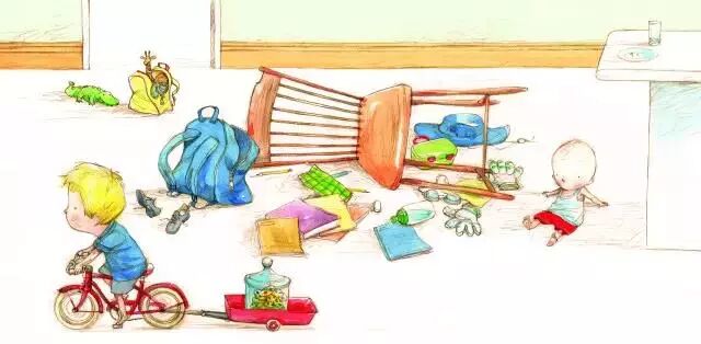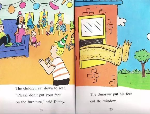 恐龙把尾巴订在自己身上了!The children sat down to rest. "Please don't put your feet on the furniture," said Danny.