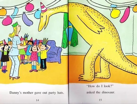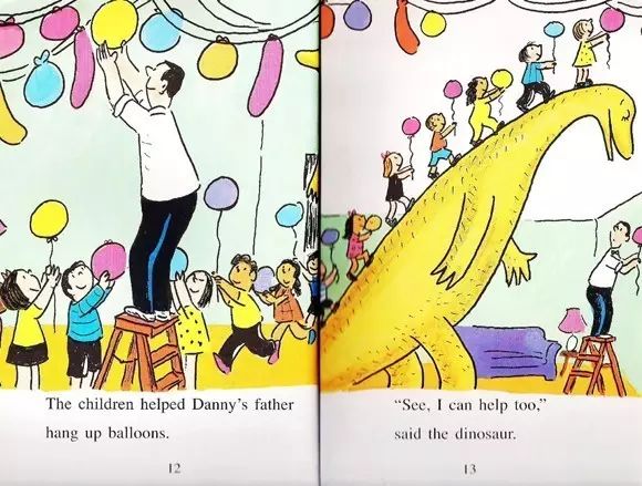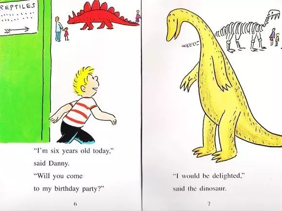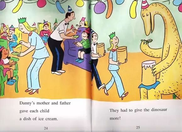 在路上,他们把丹尼的朋友接去生日派对了。“今天我一亿岁零一天了。”恐龙说。