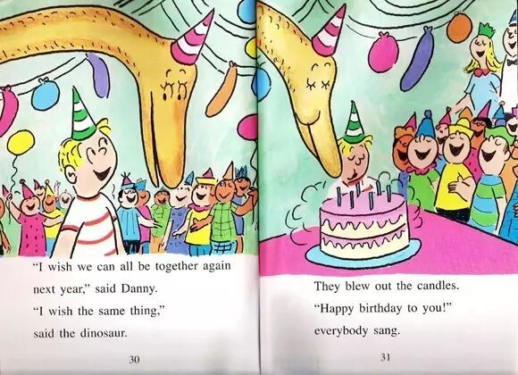 “等等!”丹尼说。“我们要先许愿!” "I wish we can all be together again next year," said Danny. "I wish the same thing," said the dinosuar.
