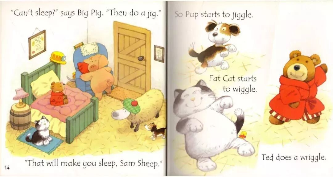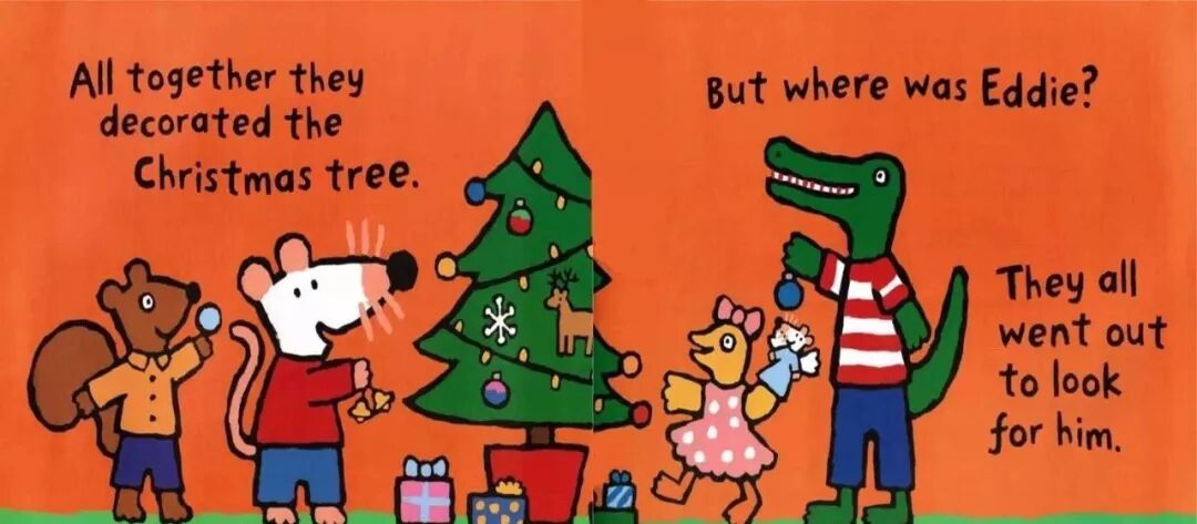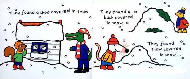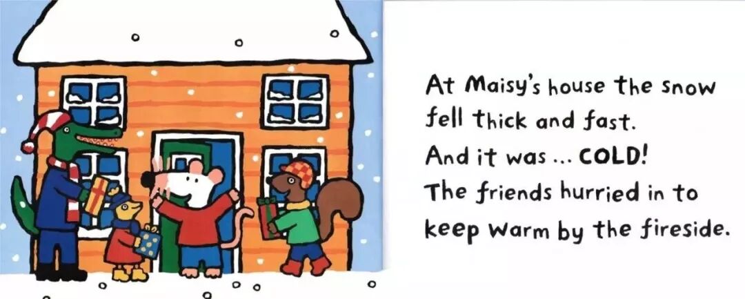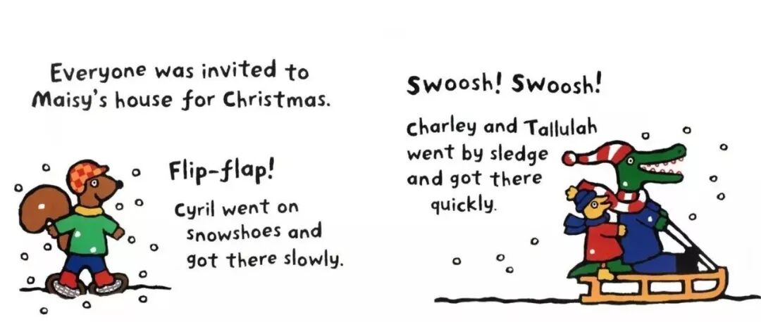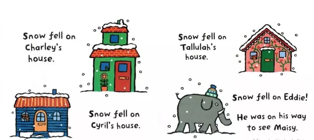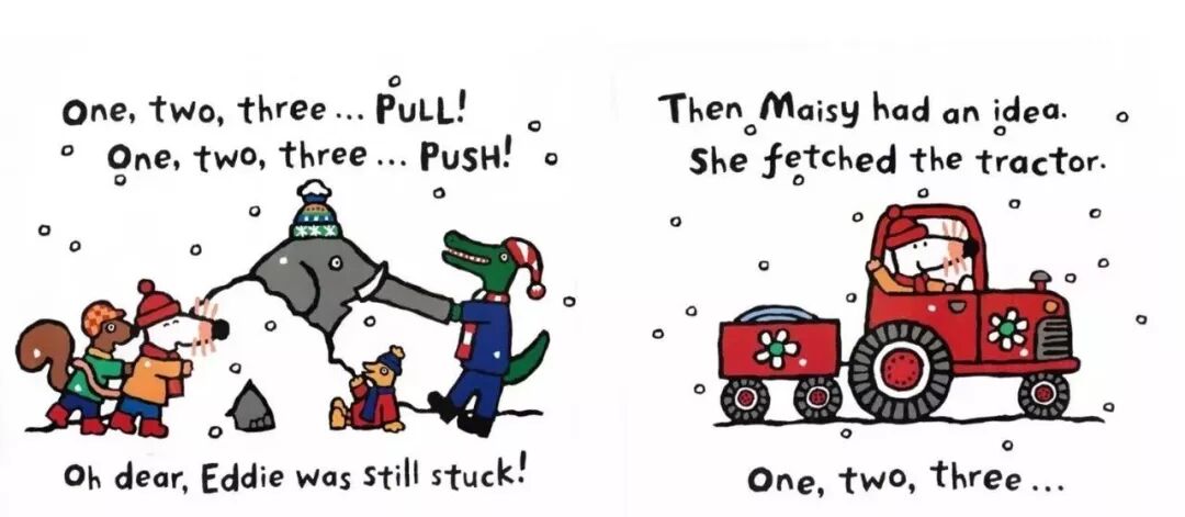 “Fat Cat can sleep for weeks and weeks!”Fat Cat’s on her sleeping mat in the park.“It’s late. It’s dark. Go to sleep!”“Sorry,” barks Pup. “Sam sheep can’t sleep.”“You need to see ted in his red bed.”Ted is asleep in his red bed.Pup bark in the dark night...Ted wakes up.On goes the light.“Sorry,” barks Pup. “Sam sheep can’t sleep.”“Then let’s see Big Pig. Down the street.”“那...我们去问问胖胖猪吧,他住在大街的另一头。”Big Pig grunts, “You woke me up!”Fat Cat yawns. “Don’t blame us.”“Sorry,” barks Pup. “Sam sheep can’t sleep.”“Can’t sleep?” says Big Pig. “That will make you sleep, Sam Sheep.”Fat Cat starts to wiggle.Fat Cat starts to wiggle.And Big Pig starts to giggle.But what about Sam Sheep?Snow fell on Christmas Eve.Snow fell on Maisy's house.Snow fell on Charley's house.Snow fell on Cyril's house.Snow fell on Tallulah's house.He was on his way to the Maisy.Everyone was invited to Maisy's house for Christmas.Flip-flap!Cyril went on snowshoes and got there slowly.Charley and Tallulah went by sledge and got there quickly.这个晚上,所有的人都被邀请到Maisy的家里一起来过圣诞节。Charley和Tallulah是坐雪橇去的,很快就到了~Plod-plop!Eddie walked...and got stuck in the snow!At Maisy's house the snow fell thick and fast.The friends hurried in to keep warm by the fireside.Everyone got ready for Christmas.wrapped presents and put up paper chains.All together they decorated the Christmas tree.They all went out to look for him.They found a shed covered in snow.They found a bush covered in snow.They found snow covered in snow…...and at last they found Eddie.Hooray!But poor Eddie was stuck in the snow!Oh,dear,Eddie was still stuck!Pop!At last,Eddie was free!That evening,everyone gathered around the tree to celebrate.Then the five friends sang Christmas carols together...And Eddie sang the loudest of all!Danny was in a hurry. He had to see his friend the dinosaur.