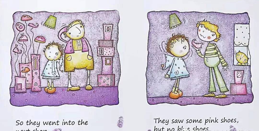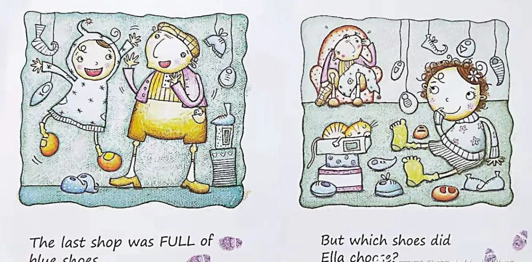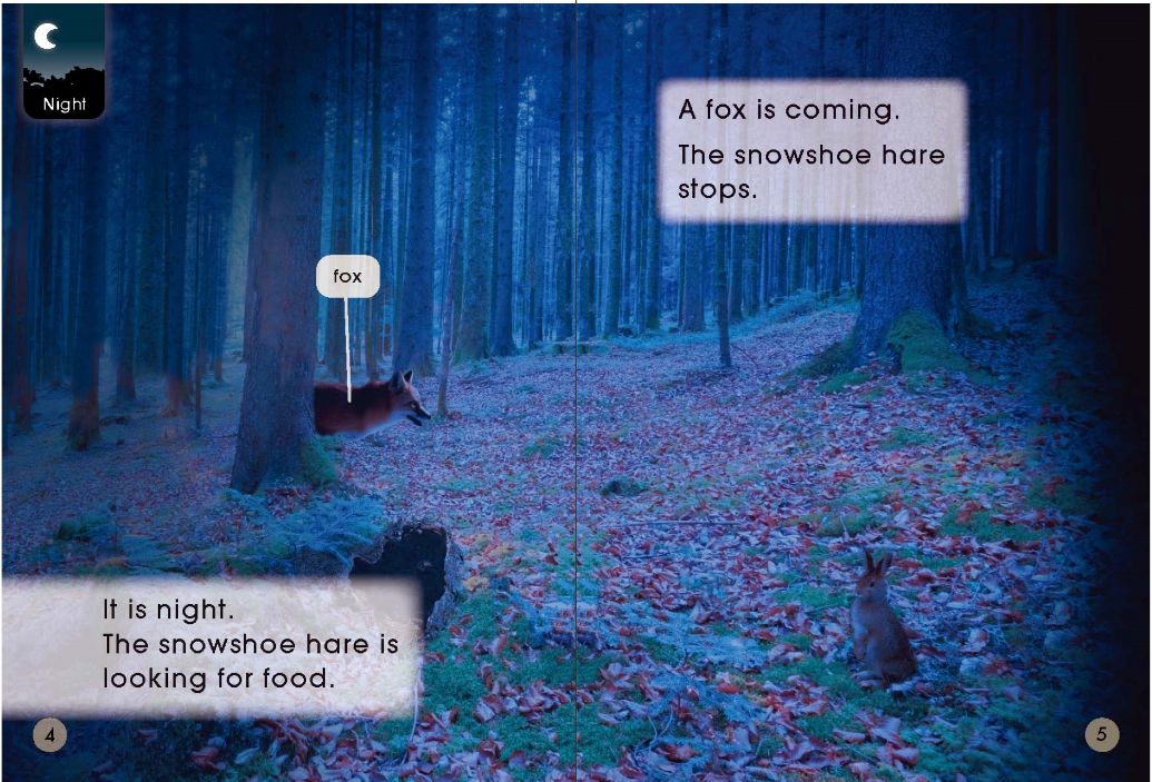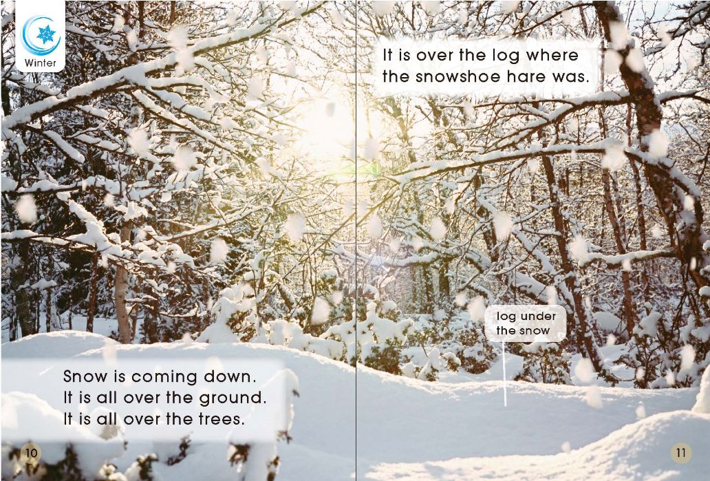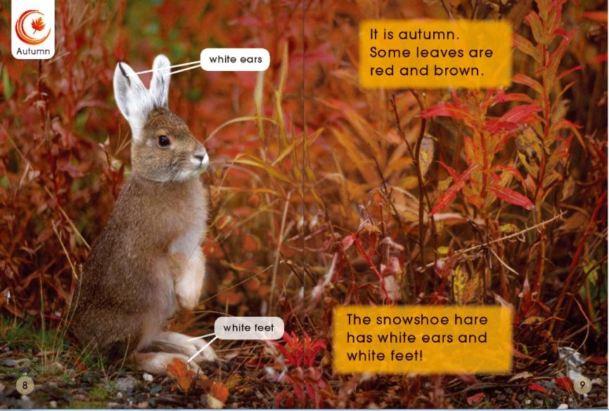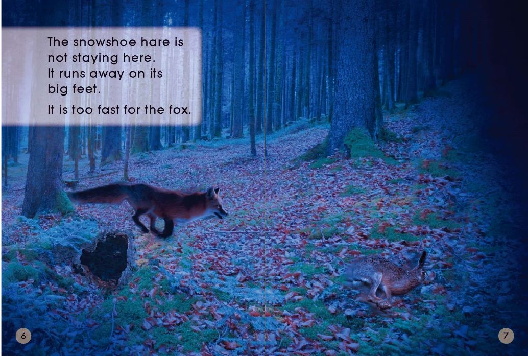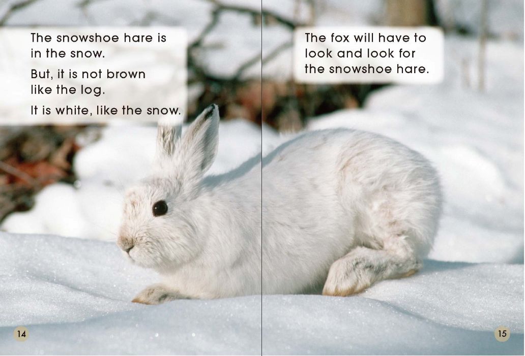Ella put on her blue shoes."My blue shoes are too small," said Ella."We will get you some new blue shoes," said Grandpa.Grandpa and Ella went into a shoe shop.There were some yellow shoes,but there were no blue shoes.So they went into the next shop.They saw some pink shoes,In the next shop there were some red shoes."These are red shoes,"said Ella."But I want blue shoes," said Ella.So they went into the last shop.The last shop was FULL of blue shoes.But which shoes did Ella choose?The snowshoe hare is brown,like the log.In the day the snowshoe hare hides.It can hide inside the log.The smowshoe hare is looking for food.The snowshoe hare is not staying here.It runs away on its big feet.It is too fast for the fox.Some leaves are red and brown.The snowshoe hare has white ears and white feet!It is all over the ground.It is all over the trees.It is over the log where the snowshoe hare was.The snowshoe hare is in the snow.But,it is not brown like the log.It is white,like the snow.The fox will have to look and look for the snowshoe hare.