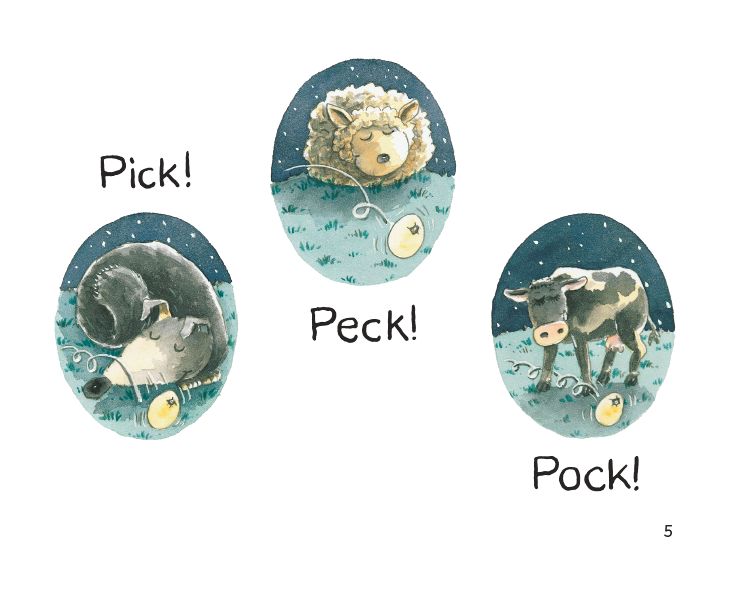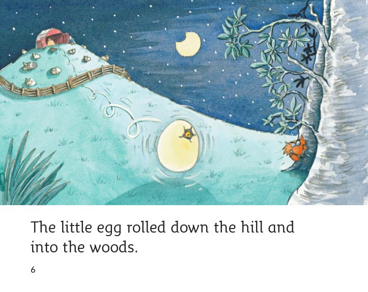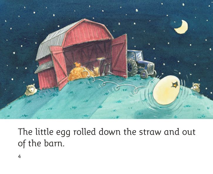A little egg was in the nest.The little egg rolled down the straw and out of the barn.The little egg rolled down the hill and into the woods.