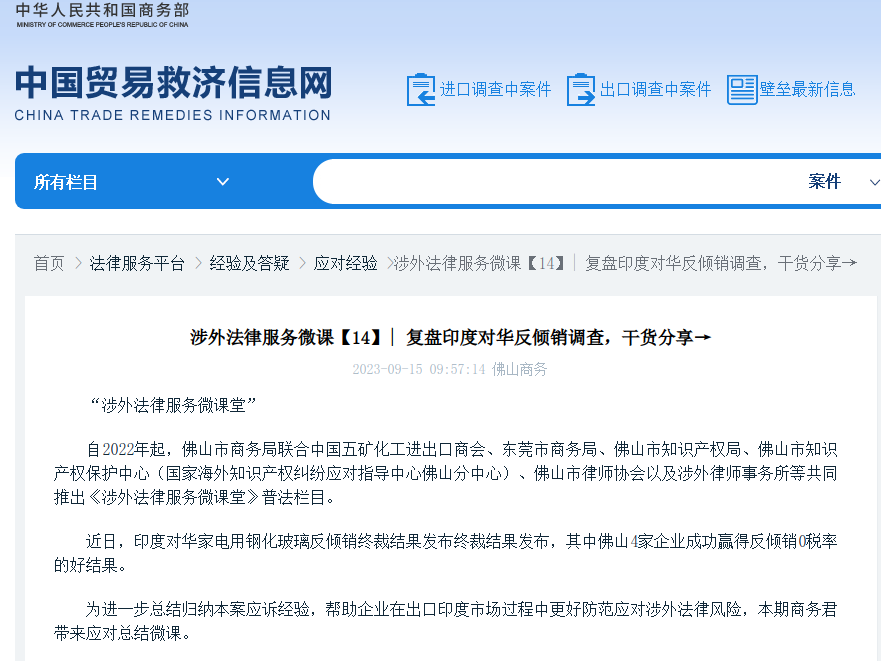 栏目针对当前佛山企业遇到的重大贸易摩擦案件,在商务主管部门通过召开案件应对培训会等基础上,辅之以线上“一案一释”模式发布国别政策解读与摩擦应对方案,跟进发布重点案件相关微课堂,力求贴近企业实际,措施具有可操作性。此外,对部分已终结案件进行总结复盘,帮助企业进一步提升案件应对能力。