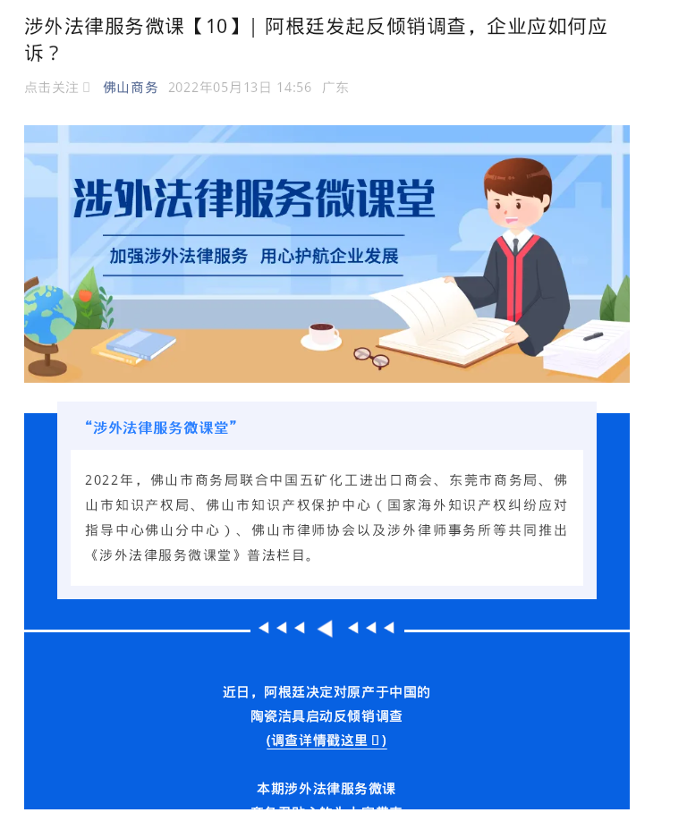 为丰富涉外法律服务宣传载体,搭建涉外法律服务供需交流平台,提升涉外企业国际贸易合规意识,助推贸易高质量发展,佛山市商务局联合多部门于2022年2月在佛山市商务局官方微信公众号上开设《涉外法律服务微课堂》普法专栏。专栏以需求为导向,贴近企业实际,通过视频、图文形式解读重点国别经贸政策和经贸摩擦应对措施,充分发挥“一案一释”作用。以实用为目标,帮助企业应对贸易摩擦时能够“资源找得到、内容学得着、措施用得上”。
