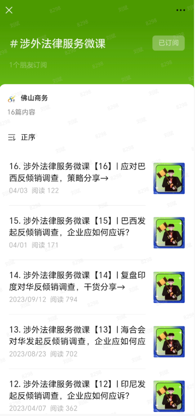 “涉外法律服务微课堂”普法项目面向企业,根据佛山发生的主要涉外经贸摩擦案件为基础,讲解该国经贸政策与应对策略,帮助企业解决实际问题。截至目前,该项目针对涉及我市主要反倾销、反补贴、保障措施调查以及337调查等案件,已累计发布16期应对课程,涉及美国、欧盟、加拿大、韩国、印度、越南等10多个国家对华贸易摩擦案件。同时,配套累计发布贸易摩擦预警信息81条。该项目受到企业广泛关注,并多次被《中国贸易救济信息网》等权威网站、微信公众号转载。