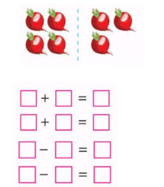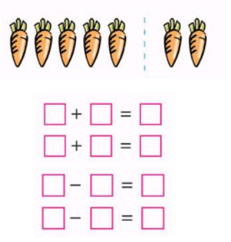 01 一图四式的含义 一图四式怎么写 一般来说,图上有三个信息,而且这三个信息之间,往往是部分、部分和整体的关系。在写算式的时候,我们要把其中一个信息改编成问题,然后写出对应算式。 (1)写加法算式。 观察的角度和顺序不同,但要求的问题相同,都是求整体是多少。写出的算式不同,但结果是相同的。其实就是“加法交换律”在小学阶段第一次运用。 (2)写减法算式。 要求的问题不同,所学的算式也就不同。一个是从整体中去掉左边的部分,求右边的部分。另一个是从整体中去掉右边的部分,求左边的部分。 03 举例一图四式 (1)写加法算式 从左往右看: 左边有5个萝卜,右边有2个萝卜,一共有几个萝卜? 算式是:5+2=7 从右往左看: 右边有2个萝卜,左边有5个萝卜,一共有几个萝卜? 算式是:2+5=7 温馨提醒: 观察的顺序不一样,算式不一样,但结果是一样的。问题是一样的,都是求一共有几个萝卜,都是把两部分合起来,所以都是用加法计算。 说明:两个数交换位置相加,得数一样。 (2)写减法算式: 右边有几个: 一共有7个萝卜,左边有5个,右边有几个? 算式是7-5=2 左边有几个: 一共有7个萝卜,右边有2个,左边有几个? 算式是7-2=5 温馨提醒: 所求的问题是不一样的,所以算式也不一样的。但都是从7个萝卜中,去掉一部分,所以都是用减法计算。 说明:减法是加法的逆运算,所以做减法可以想加法。 温馨提醒: 说一图四式的时候,一定要想清楚从哪个角度观察,准备解决一个什么问题,写出一个怎样的算式。简而言之,就是把其中的一个信息,改编为问题,写算式解决。 认真观看下面的视频,听听数学小讲师的分析和讲解。相信看了视频后,你会有更多的收获! 一图四式专项练习。先说一说,再写一写。 认真完成上述习题,可以和同学、爸爸妈妈交流,也可以在后面留言,或者拍照后回复信息。相信自己,你会越来越棒! ?桃园张老师 长按下方二维码 关注“数学思维树” 感谢关注阅读 欢迎分享转发 你的转发和点赞, 就是对我们最大的支持!