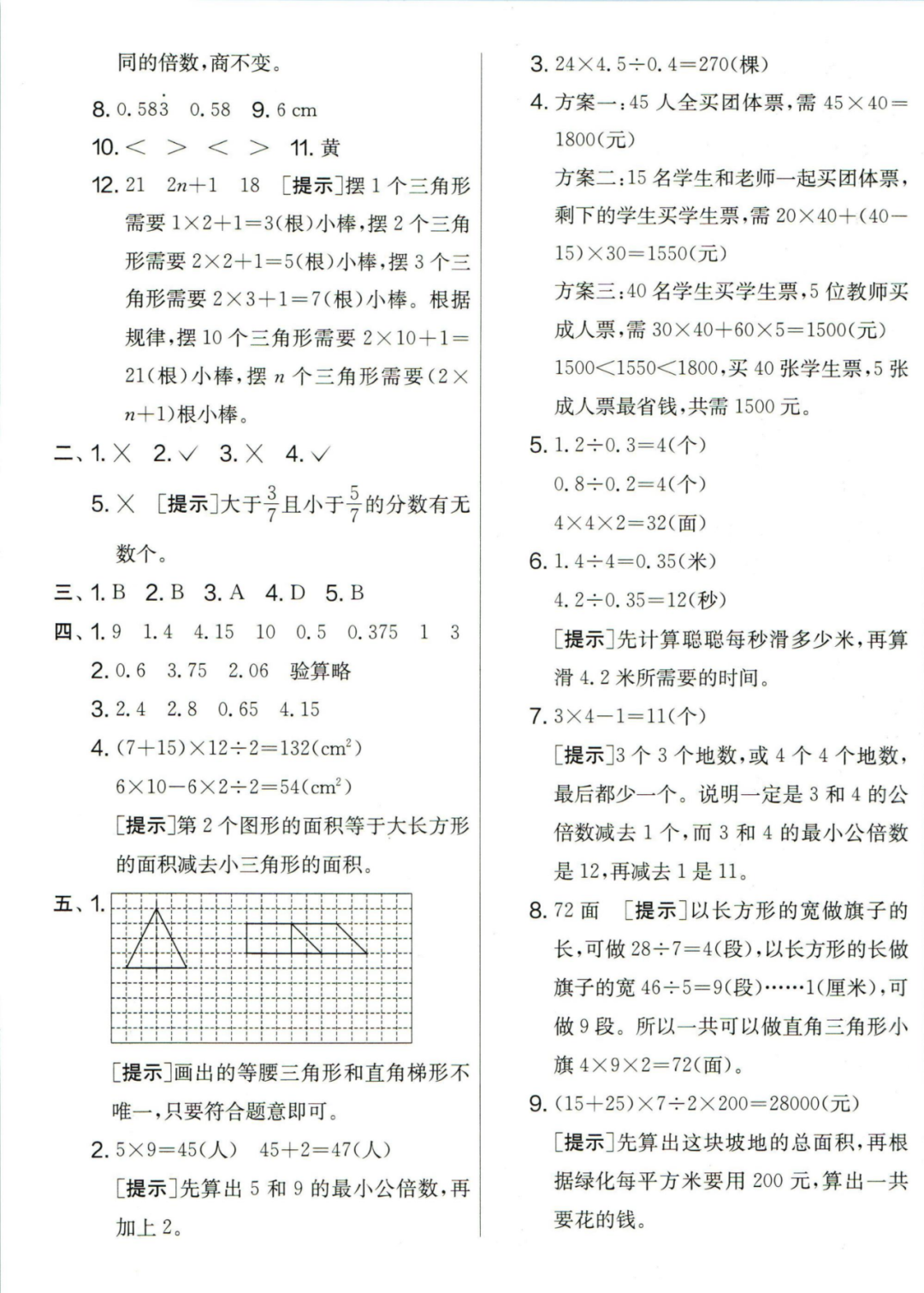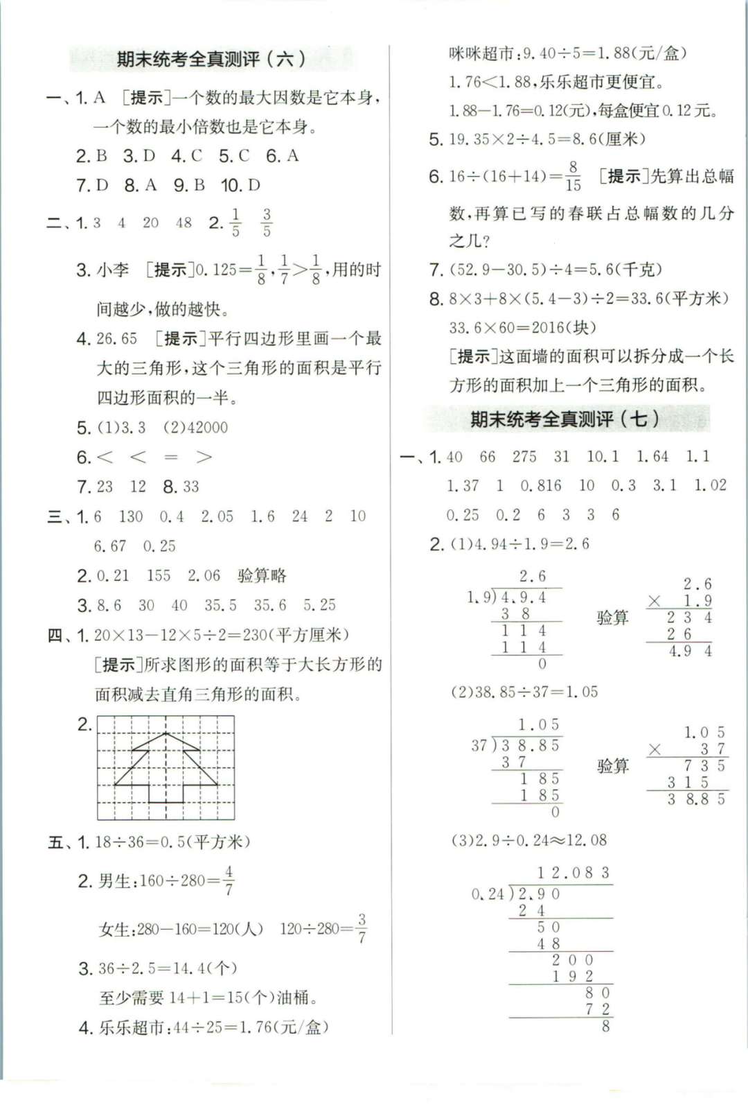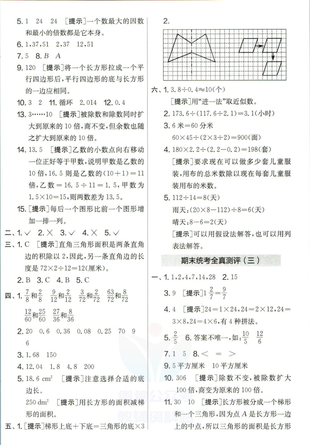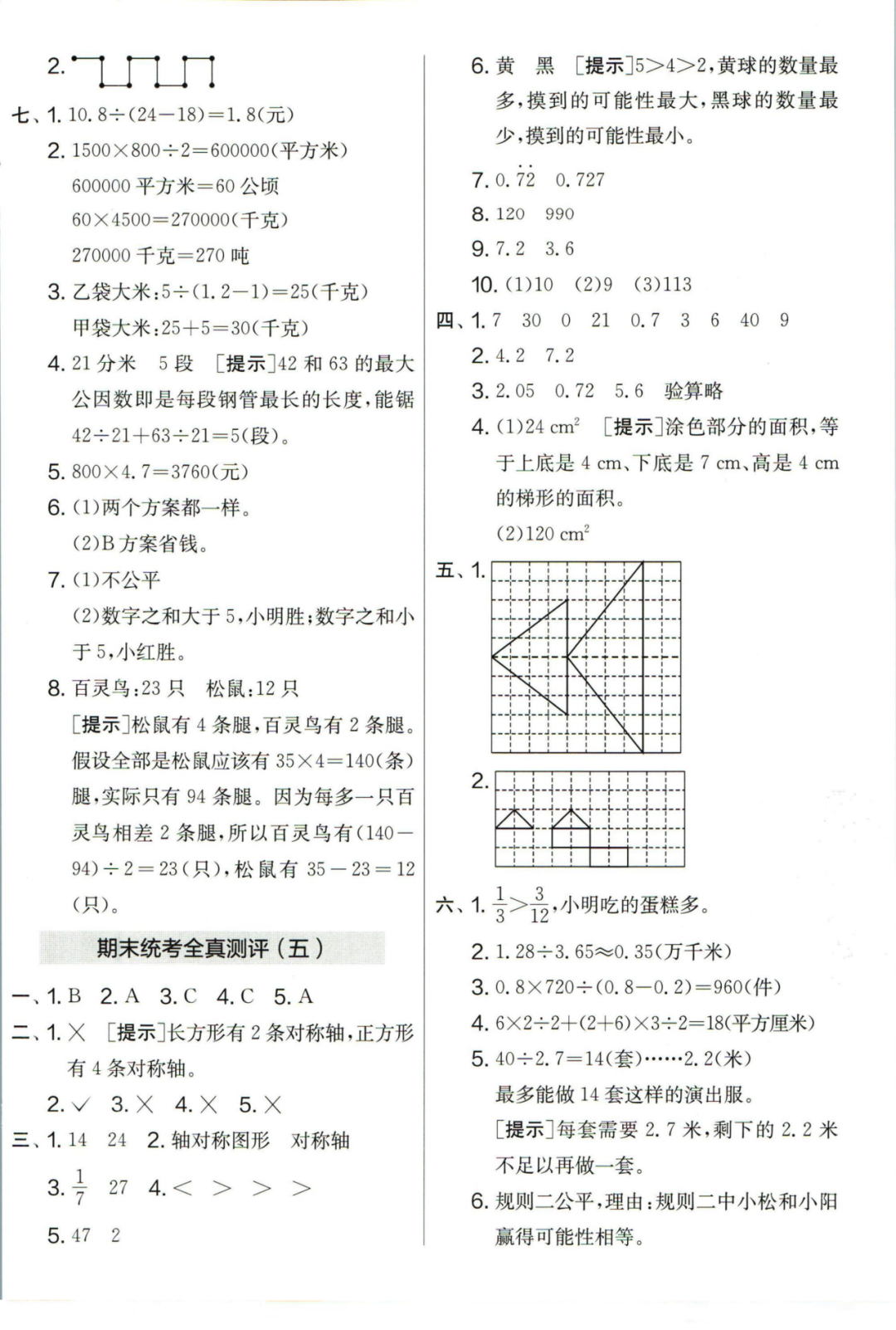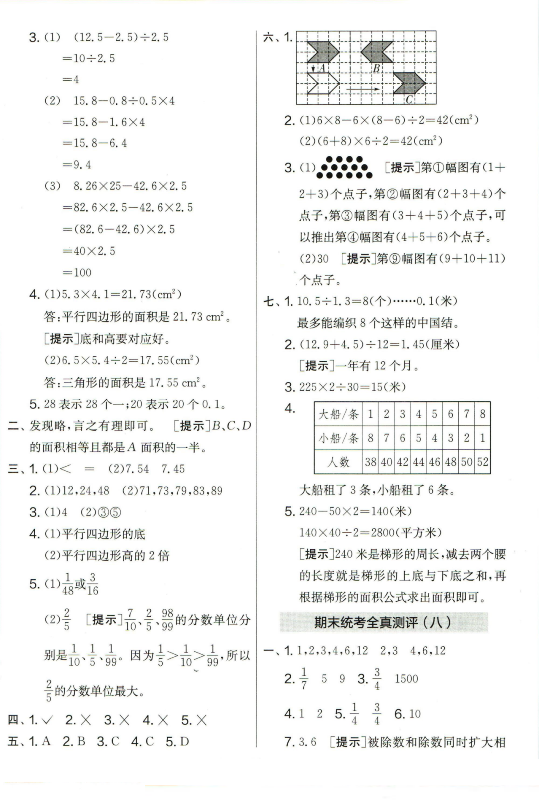 王老师最新整理了小学五年级上册数学期末试卷8套(含答案),附期末必考知识点! 知识点 小数乘法计算法则: 1.先按照整数乘法算出积,再点小数点; 点小数点时,看因数中一共有几位小数,就从积的右起数出几位,点上小数点。 2.一个乘法算式中,一个数(0除外)乘大于1的数,积比原来的数大。如:3×1.2>3一个数(0除外)乘小于1的数,积比原来的数小。如:3×0.8<3 3.积的变化规律:一个因数不变,另一个因数乘或除以几(0除外),积也乘或除以几。 小数除法计算法则: 1.先移动除数的小数点,使它变成整数; 除数的小数点向右移动几位,被除数的小数点也向右移动几位(位数不够的,在被除数的末尾用0补足); 然后按除数是整数的小数除法进行计算。 3.一个除法算式中,当除数小于1时,商比被除数大; 当除数大于1时,商比被除数小。 4.商的变化规律: 被除数与除数同时扩大或者缩小相同的倍数,商不变。 除数不变,被除数乘或除以几(0除外),商也乘或除以几。 被除数不变,除数扩大,商反而缩小;除数缩小,商反而扩大。 5.循环小数一定是无限小数;无限小数不一定是循环小数;有限小数一定不是循环小数。 运算定律: 加法交换律 a+b=b+a 加法结合律 (a+b)+c=a+(b+c) 乘法交换律 a×b=b×a或ab=ba或a·b=b·a 乘法结合律 (a×b)×c=a×(b×c) 或(ab)c=a (bc) 或(a·b )·c=a· (b·c) 乘法分配律 (a+b)×c=a×c+b×c 或(a+b)×c=ac+bc 或(a+b)·c=a·c+b·c 连减 a-b-c 五年级试卷=a-(b+c) 连除 a÷b÷c=a÷(b×c) 正方形的边长用a表示,面积用S表示,周长用C表示,则: 正方形的面积=边长×边长 S= a×a= a2 正方形的周长=边长×4 C= a×4=4 a 长方形的长用a表示,宽用b表示,面积用S表示,周长用C表示,则: 长方形的面积=长×宽 S= a×b = ab 长方形的周长=(长+宽)×2 C=(a+b)×2 路程用s表示,速度用表示v表示,时间用t表示,则: 路程=速度×时间 s=vt 速度=路程÷时间 v=s÷t 时间=路程÷速度 t=s÷v 用a表示商品的单价,x表示数量,c表示总价,则: 总价=单价×数量 c=ax 单价=总价÷数量 a=c÷x 数量=总价÷单价 x=c÷a 用a表示工作效率,用t表示工作时间,用c表示工作总量,则: 工作总量=工作效率×工作时间 c=at 工作效率=工作总量÷工作时间 a=c÷t 工作时间=工作总量÷工作效率 t=c÷a 多边形的面积: 平行四边形的面积=底×高 三角形的面积=底×高÷2 梯形的面积=(上底+下底)×高÷2 植树问题: 两端都不栽 棵树=总长÷间距—1 只栽一端(封闭图形植树) 棵树=总长÷间距 两端都栽 棵树=总长÷间距+1 1、单价、数量和总价 单价×数量=总价 总价÷单价=数量 总价÷数量=单价 2、路程、速度和时间 速度×时间=路程 路程÷速度=时间 路程÷时间=速度 3、工作总量、工作时间和工作效率 工作总量=工作效率×工作时间 工作时间=工作总量÷工作效率 工作效率=工作总量÷工作时间 4、总数和份数 每份数×份数=总数 总数÷每份数=份数 总数÷份数=每份数 5、生活中常用的单位: 质量: 1吨=1000千克;1千克=1000克 长度: 1千米=1000米 1分米=10厘米 1厘米=10毫米 1分米=100毫米 1米=10分米=100厘米=1000毫米 面积: 1平方米= 100平方分米 1平方分米=100平方厘米 1平方千米=100公顷 1公顷=10000平方米 人民币: 1元=10角 1角=10分 1元=100分 期末试卷 01 期末试卷 02 期末试卷 03 期末试卷 04 期末试卷 05 期末试卷 06 期末试卷 07 期末试卷 08 参 考 答 案