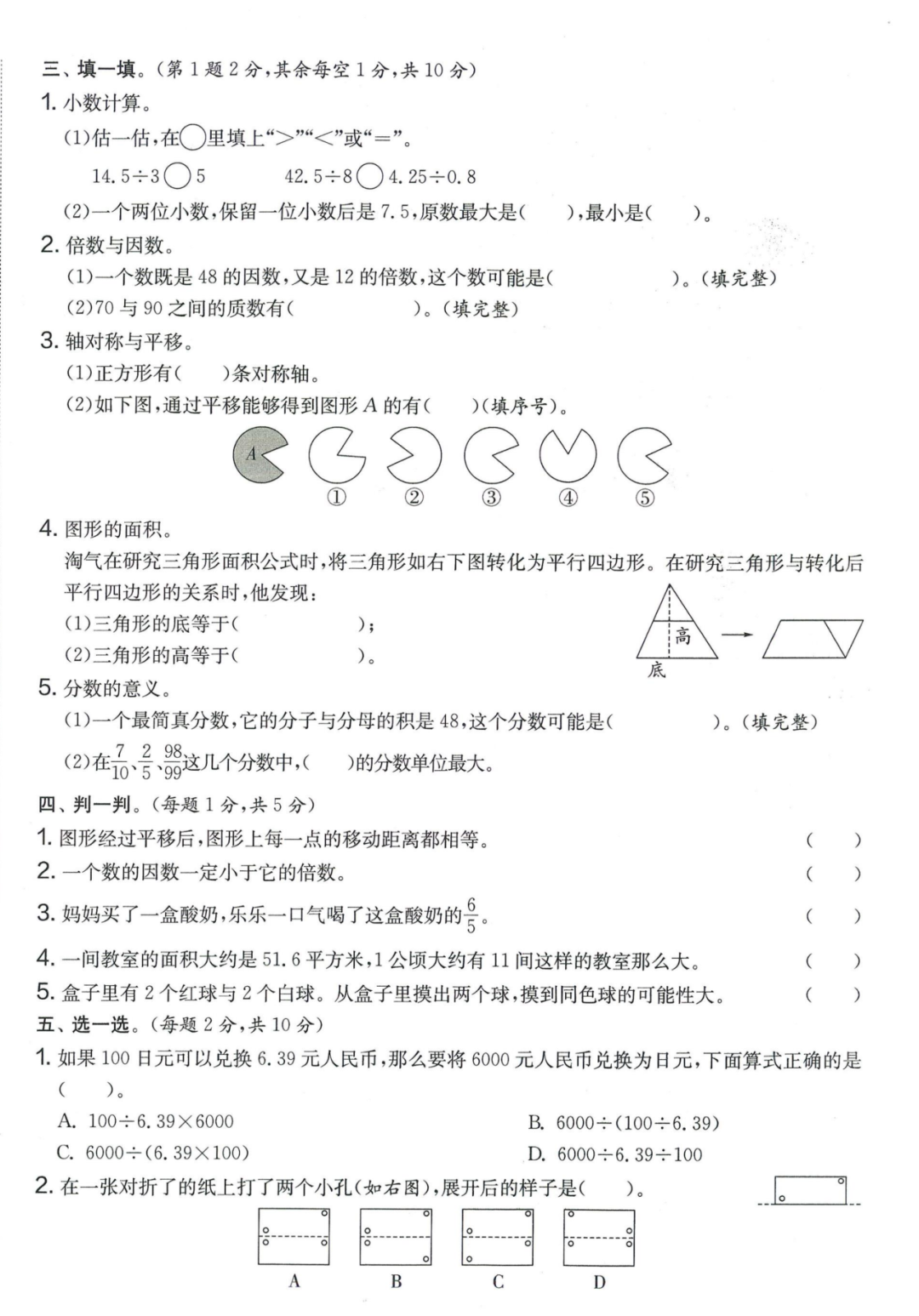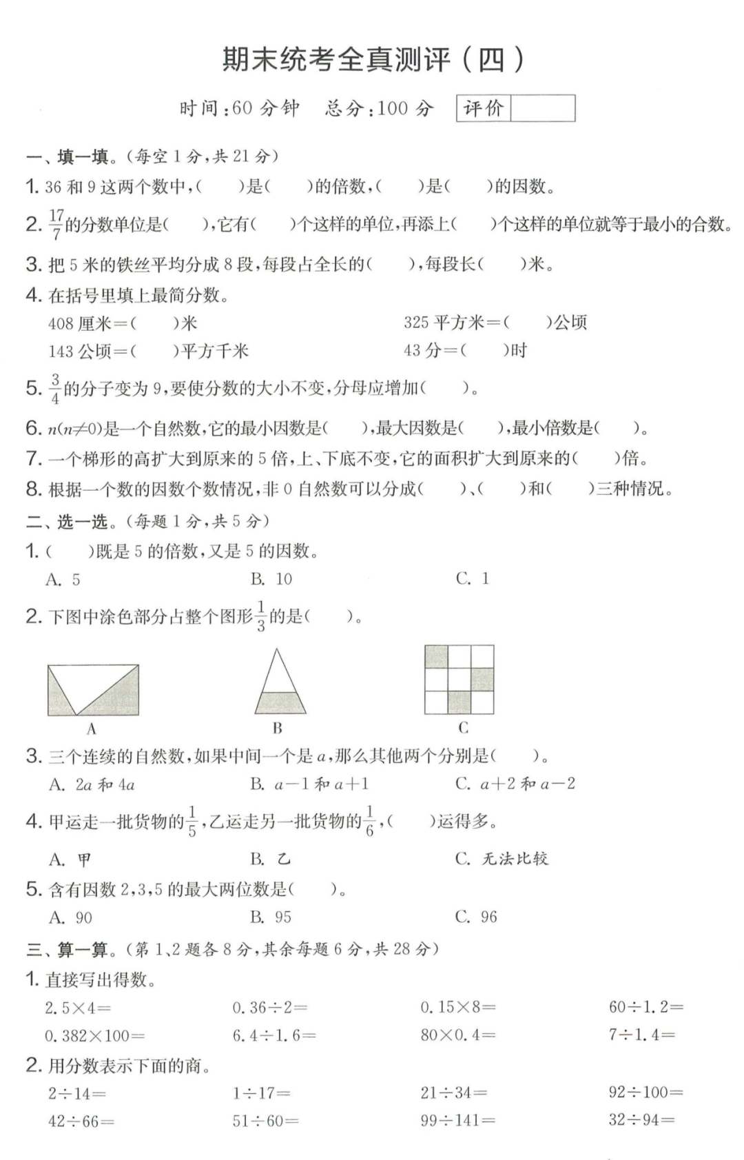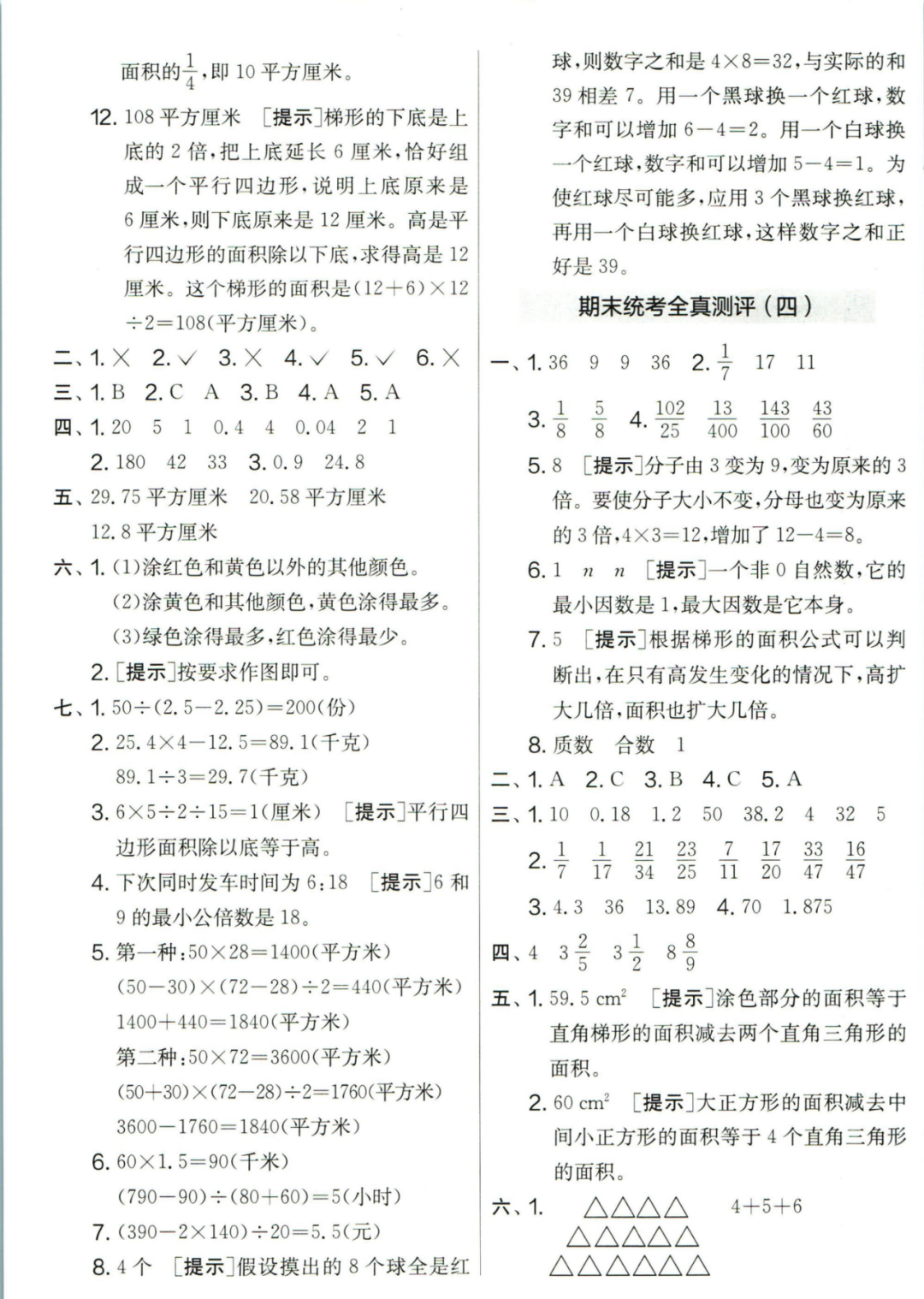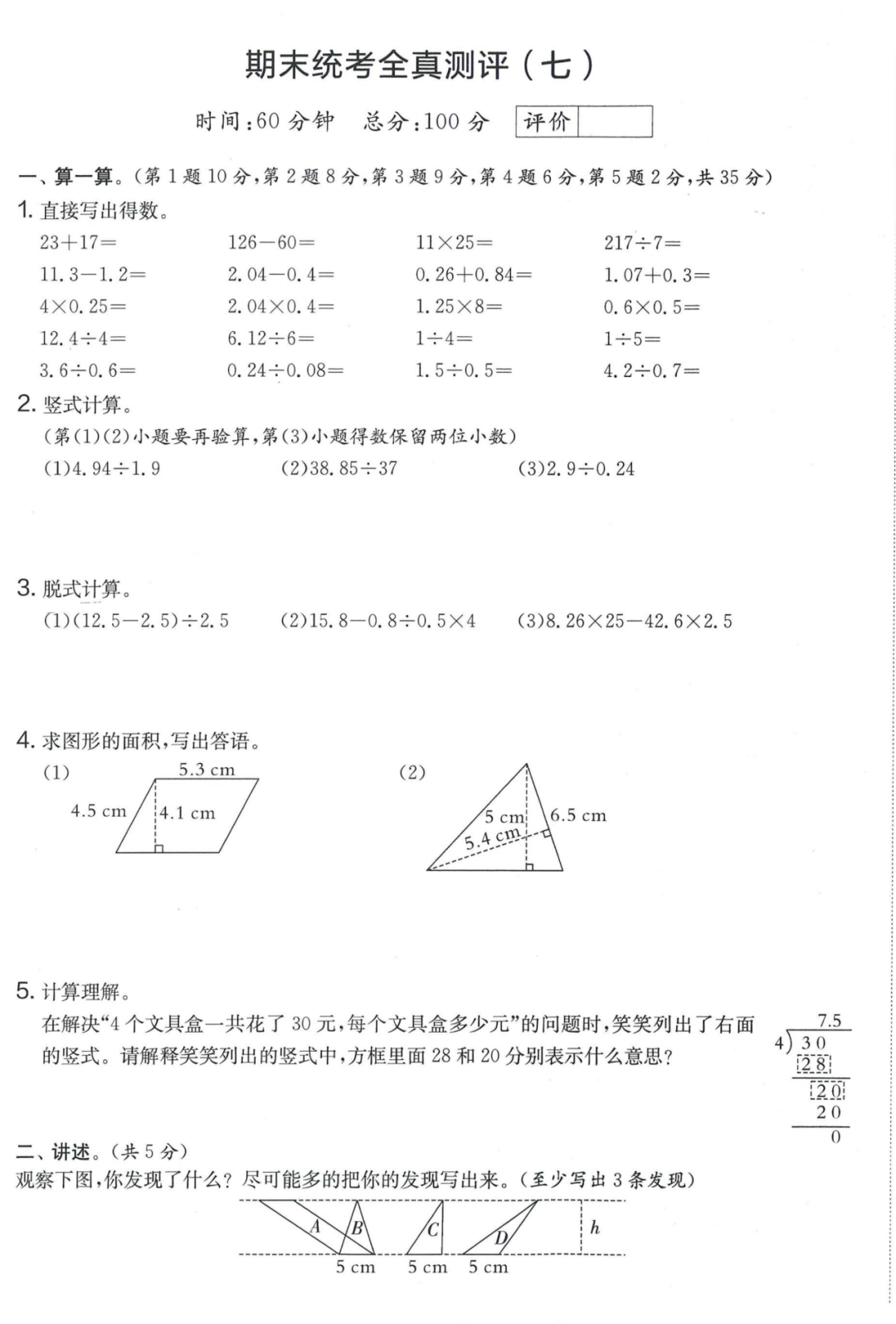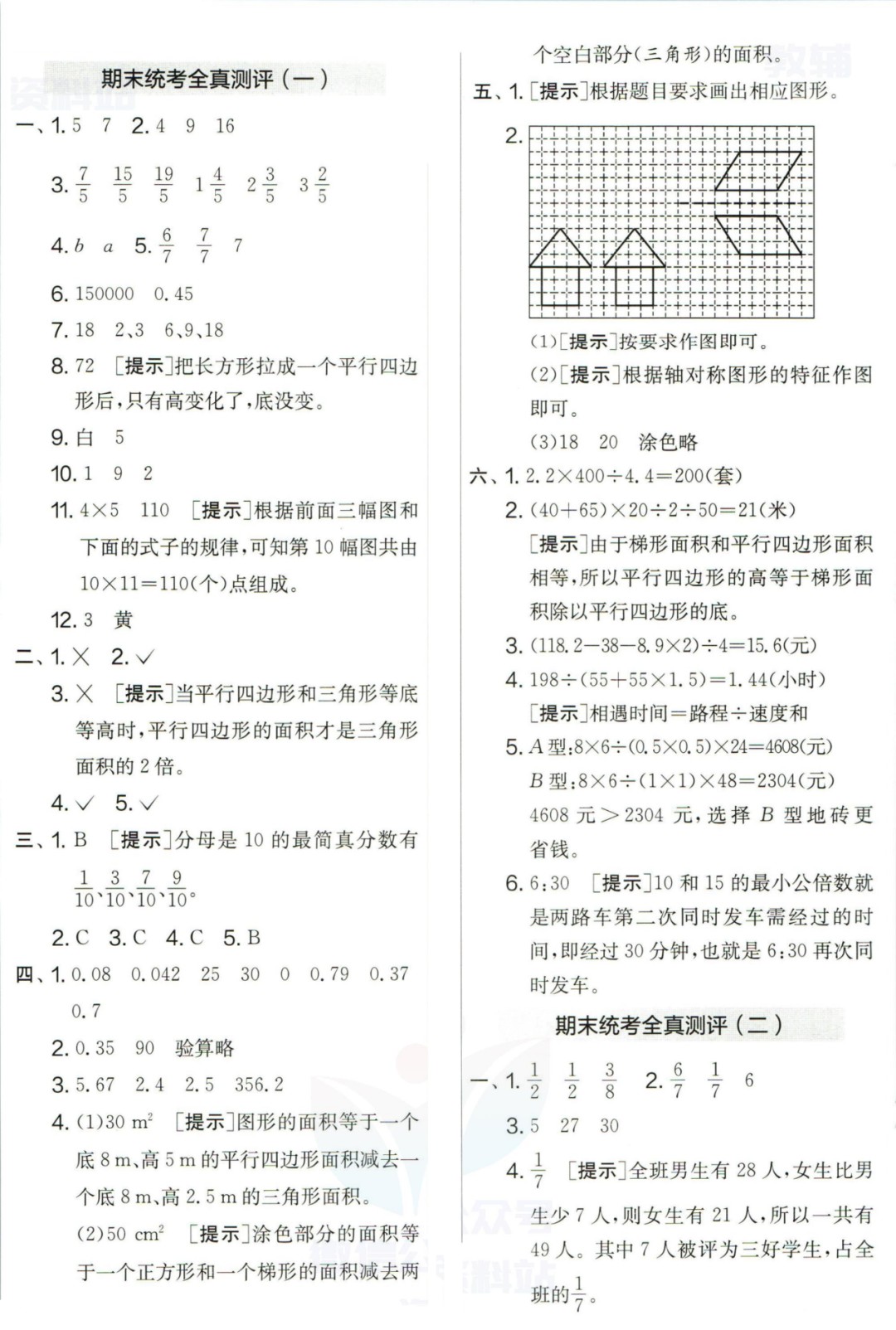 王老师最新整理了小学五年级上册数学期末试卷8套(含答案),附期末必考知识点! 知识点 小数乘法计算法则: 1.先按照整数乘法算出积,再点小数点; 点小数点时,看因数中一共有几位小数,就从积的右起数出几位,点上小数点。 2.一个乘法算式中,一个数(0除外)乘大于1的数,积比原来的数大。如:3×1.2>3一个数(0除外)乘小于1的数,积比原来的数小。如:3×0.8<3 3.积的变化规律:一个因数不变,另一个因数乘或除以几(0除外),积也乘或除以几。 小数除法计算法则: 1.先移动除数的小数点,使它变成整数; 除数的小数点向右移动几位,被除数的小数点也向右移动几位(位数不够的,在被除数的末尾用0补足); 然后按除数是整数的小数除法进行计算。 3.一个除法算式中,当除数小于1时,商比被除数大; 当除数大于1时,商比被除数小。 4.商的变化规律: 被除数与除数同时扩大或者缩小相同的倍数,商不变。 除数不变,被除数乘或除以几(0除外),商也乘或除以几。 被除数不变,除数扩大,商反而缩小;除数缩小,商反而扩大。 5.循环小数一定是无限小数;无限小数不一定是循环小数;有限小数一定不是循环小数。 运算定律: 加法交换律 a+b=b+a 加法结合律 (a+b)+c=a+(b+c) 乘法交换律 a×b=b×a或ab=ba或a·b=b·a 乘法结合律 (a×b)×c=a×(b×c) 或(ab)c=a (bc) 或(a·b )·c=a· (b·c) 乘法分配律 (a+b)×c=a×c+b×c 或(a+b)×c=ac+bc 或(a+b)·c=a·c+b·c 连减 a-b-c 五年级试卷=a-(b+c) 连除 a÷b÷c=a÷(b×c) 正方形的边长用a表示,面积用S表示,周长用C表示,则: 正方形的面积=边长×边长 S= a×a= a2 正方形的周长=边长×4 C= a×4=4 a 长方形的长用a表示,宽用b表示,面积用S表示,周长用C表示,则: 长方形的面积=长×宽 S= a×b = ab 长方形的周长=(长+宽)×2 C=(a+b)×2 路程用s表示,速度用表示v表示,时间用t表示,则: 路程=速度×时间 s=vt 速度=路程÷时间 v=s÷t 时间=路程÷速度 t=s÷v 用a表示商品的单价,x表示数量,c表示总价,则: 总价=单价×数量 c=ax 单价=总价÷数量 a=c÷x 数量=总价÷单价 x=c÷a 用a表示工作效率,用t表示工作时间,用c表示工作总量,则: 工作总量=工作效率×工作时间 c=at 工作效率=工作总量÷工作时间 a=c÷t 工作时间=工作总量÷工作效率 t=c÷a 多边形的面积: 平行四边形的面积=底×高 三角形的面积=底×高÷2 梯形的面积=(上底+下底)×高÷2 植树问题: 两端都不栽 棵树=总长÷间距—1 只栽一端(封闭图形植树) 棵树=总长÷间距 两端都栽 棵树=总长÷间距+1 1、单价、数量和总价 单价×数量=总价 总价÷单价=数量 总价÷数量=单价 2、路程、速度和时间 速度×时间=路程 路程÷速度=时间 路程÷时间=速度 3、工作总量、工作时间和工作效率 工作总量=工作效率×工作时间 工作时间=工作总量÷工作效率 工作效率=工作总量÷工作时间 4、总数和份数 每份数×份数=总数 总数÷每份数=份数 总数÷份数=每份数 5、生活中常用的单位: 质量: 1吨=1000千克;1千克=1000克 长度: 1千米=1000米 1分米=10厘米 1厘米=10毫米 1分米=100毫米 1米=10分米=100厘米=1000毫米 面积: 1平方米= 100平方分米 1平方分米=100平方厘米 1平方千米=100公顷 1公顷=10000平方米 人民币: 1元=10角 1角=10分 1元=100分 期末试卷 01 期末试卷 02 期末试卷 03 期末试卷 04 期末试卷 05 期末试卷 06 期末试卷 07 期末试卷 08 参 考 答 案