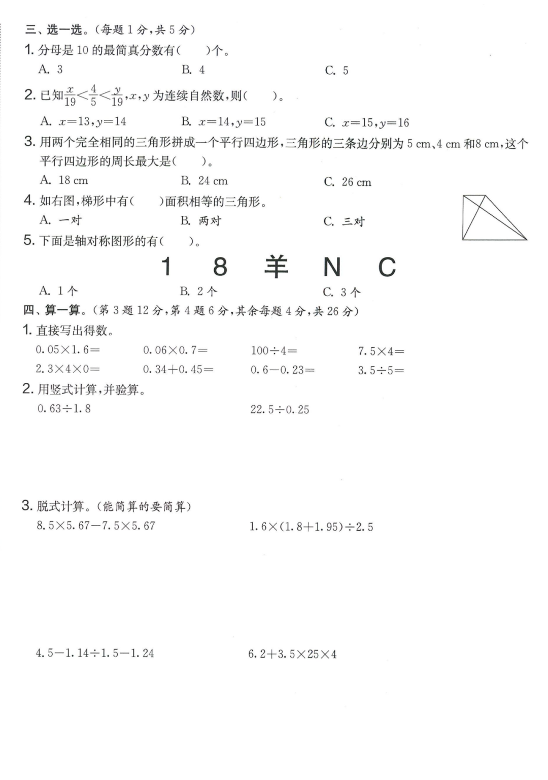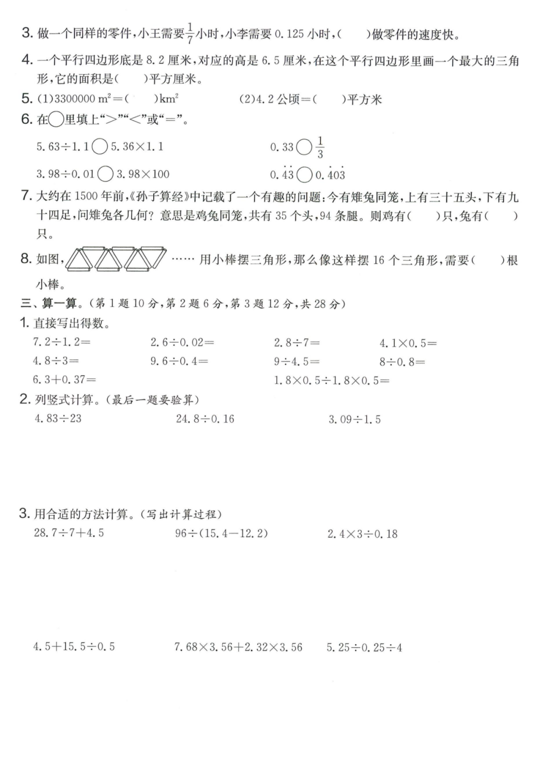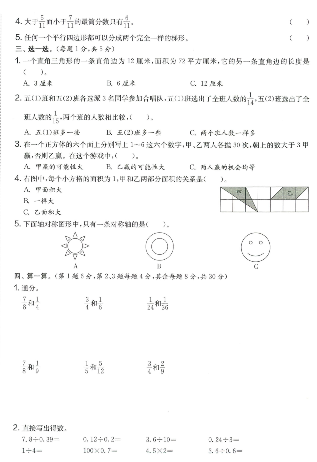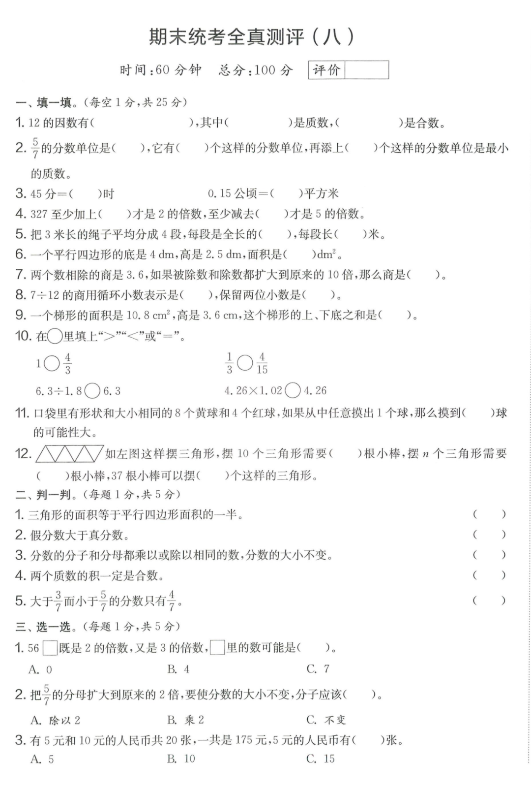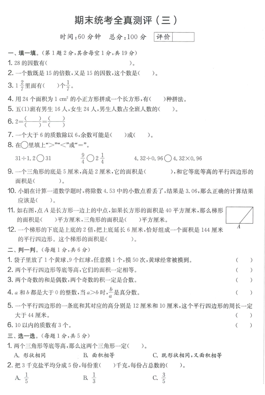 王老师最新整理了小学五年级上册数学期末试卷8套(含答案),附期末必考知识点! 知识点 小数乘法计算法则: 1.先按照整数乘法算出积,再点小数点; 点小数点时,看因数中一共有几位小数,就从积的右起数出几位,点上小数点。 2.一个乘法算式中,一个数(0除外)乘大于1的数,积比原来的数大。如:3×1.2>3一个数(0除外)乘小于1的数,积比原来的数小。如:3×0.8<3 3.积的变化规律:一个因数不变,另一个因数乘或除以几(0除外),积也乘或除以几。 小数除法计算法则: 1.先移动除数的小数点,使它变成整数; 除数的小数点向右移动几位,被除数的小数点也向右移动几位(位数不够的,在被除数的末尾用0补足); 然后按除数是整数的小数除法进行计算。 3.一个除法算式中,当除数小于1时,商比被除数大; 当除数大于1时,商比被除数小。 4.商的变化规律: 被除数与除数同时扩大或者缩小相同的倍数,商不变。 除数不变,被除数乘或除以几(0除外),商也乘或除以几。 被除数不变,除数扩大,商反而缩小;除数缩小,商反而扩大。 5.循环小数一定是无限小数;无限小数不一定是循环小数;有限小数一定不是循环小数。 运算定律: 加法交换律 a+b=b+a 加法结合律 (a+b)+c=a+(b+c) 乘法交换律 a×b=b×a或ab=ba或a·b=b·a 乘法结合律 (a×b)×c=a×(b×c) 或(ab)c=a (bc) 或(a·b )·c=a· (b·c) 乘法分配律 (a+b)×c=a×c+b×c 或(a+b)×c=ac+bc 或(a+b)·c=a·c+b·c 连减 a-b-c 五年级试卷=a-(b+c) 连除 a÷b÷c=a÷(b×c) 正方形的边长用a表示,面积用S表示,周长用C表示,则: 正方形的面积=边长×边长 S= a×a= a2 正方形的周长=边长×4 C= a×4=4 a 长方形的长用a表示,宽用b表示,面积用S表示,周长用C表示,则: 长方形的面积=长×宽 S= a×b = ab 长方形的周长=(长+宽)×2 C=(a+b)×2 路程用s表示,速度用表示v表示,时间用t表示,则: 路程=速度×时间 s=vt 速度=路程÷时间 v=s÷t 时间=路程÷速度 t=s÷v 用a表示商品的单价,x表示数量,c表示总价,则: 总价=单价×数量 c=ax 单价=总价÷数量 a=c÷x 数量=总价÷单价 x=c÷a 用a表示工作效率,用t表示工作时间,用c表示工作总量,则: 工作总量=工作效率×工作时间 c=at 工作效率=工作总量÷工作时间 a=c÷t 工作时间=工作总量÷工作效率 t=c÷a 多边形的面积: 平行四边形的面积=底×高 三角形的面积=底×高÷2 梯形的面积=(上底+下底)×高÷2 植树问题: 两端都不栽 棵树=总长÷间距—1 只栽一端(封闭图形植树) 棵树=总长÷间距 两端都栽 棵树=总长÷间距+1 1、单价、数量和总价 单价×数量=总价 总价÷单价=数量 总价÷数量=单价 2、路程、速度和时间 速度×时间=路程 路程÷速度=时间 路程÷时间=速度 3、工作总量、工作时间和工作效率 工作总量=工作效率×工作时间 工作时间=工作总量÷工作效率 工作效率=工作总量÷工作时间 4、总数和份数 每份数×份数=总数 总数÷每份数=份数 总数÷份数=每份数 5、生活中常用的单位: 质量: 1吨=1000千克;1千克=1000克 长度: 1千米=1000米 1分米=10厘米 1厘米=10毫米 1分米=100毫米 1米=10分米=100厘米=1000毫米 面积: 1平方米= 100平方分米 1平方分米=100平方厘米 1平方千米=100公顷 1公顷=10000平方米 人民币: 1元=10角 1角=10分 1元=100分 期末试卷 01 期末试卷 02 期末试卷 03 期末试卷 04 期末试卷 05 期末试卷 06 期末试卷 07 期末试卷 08 参 考 答 案