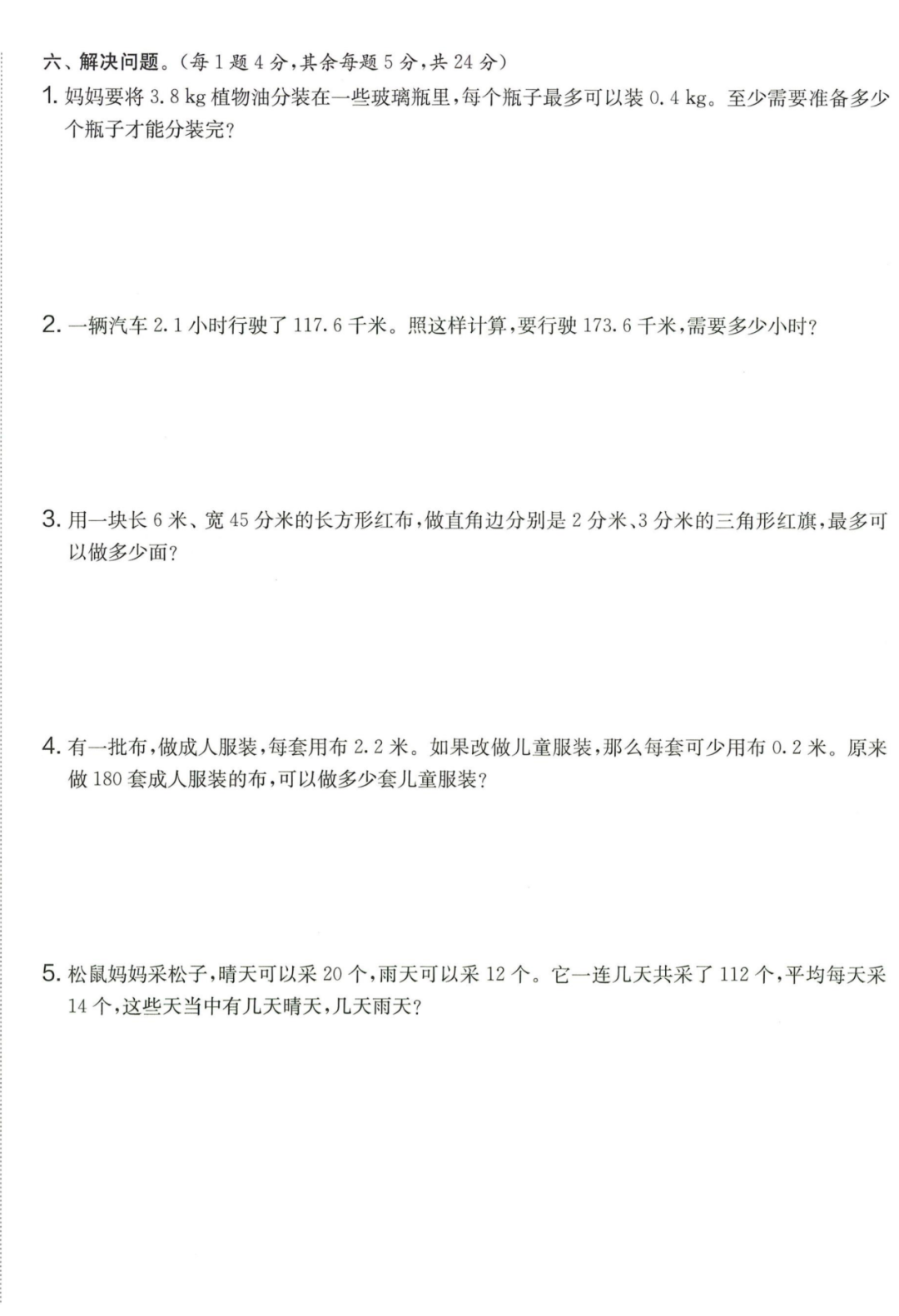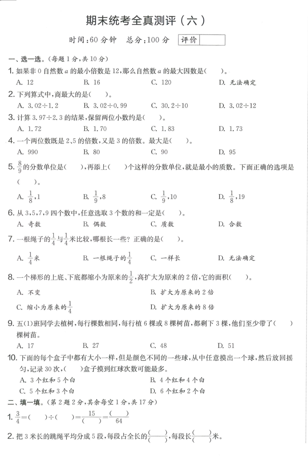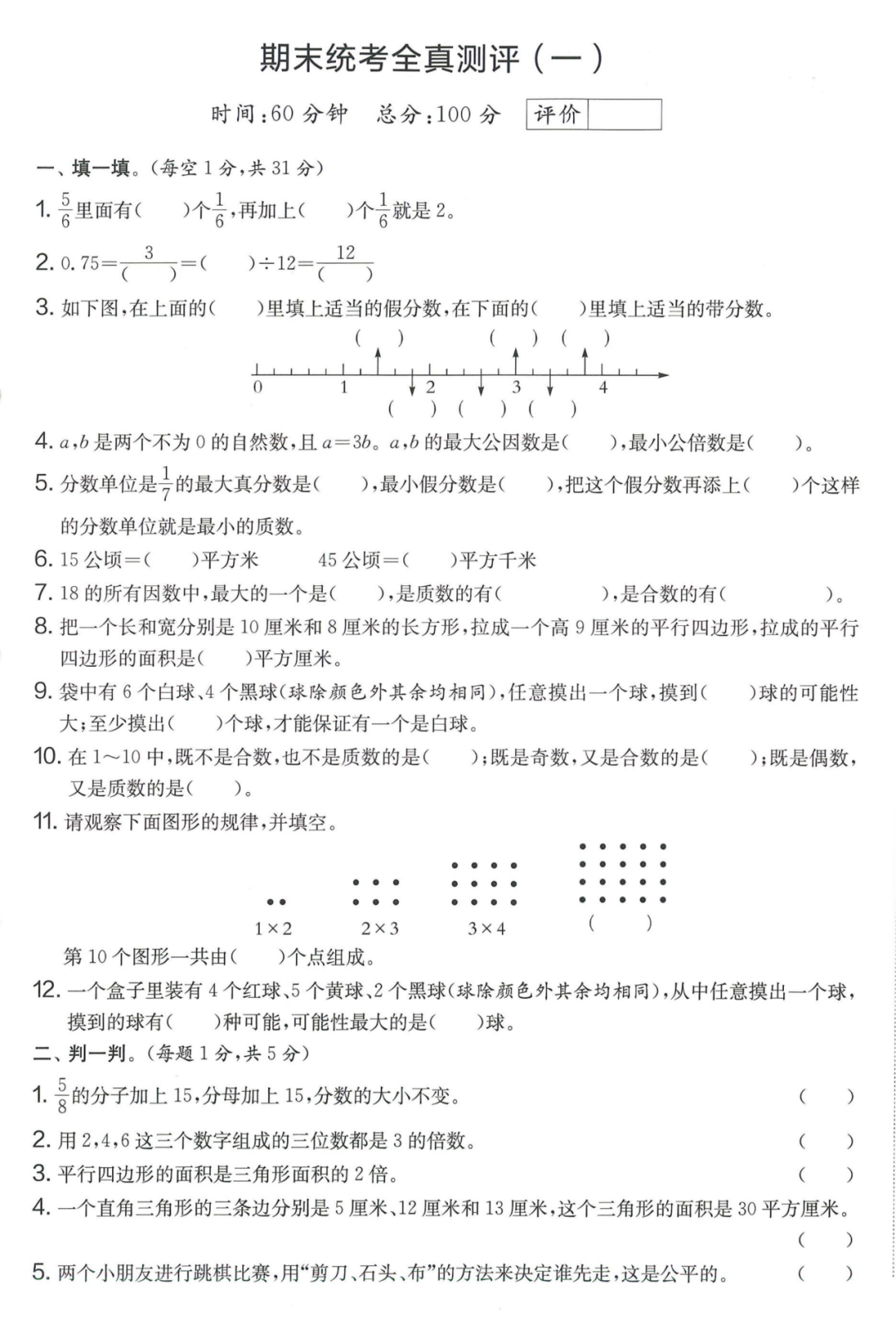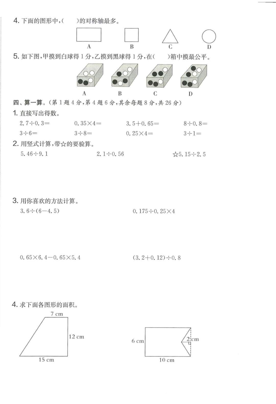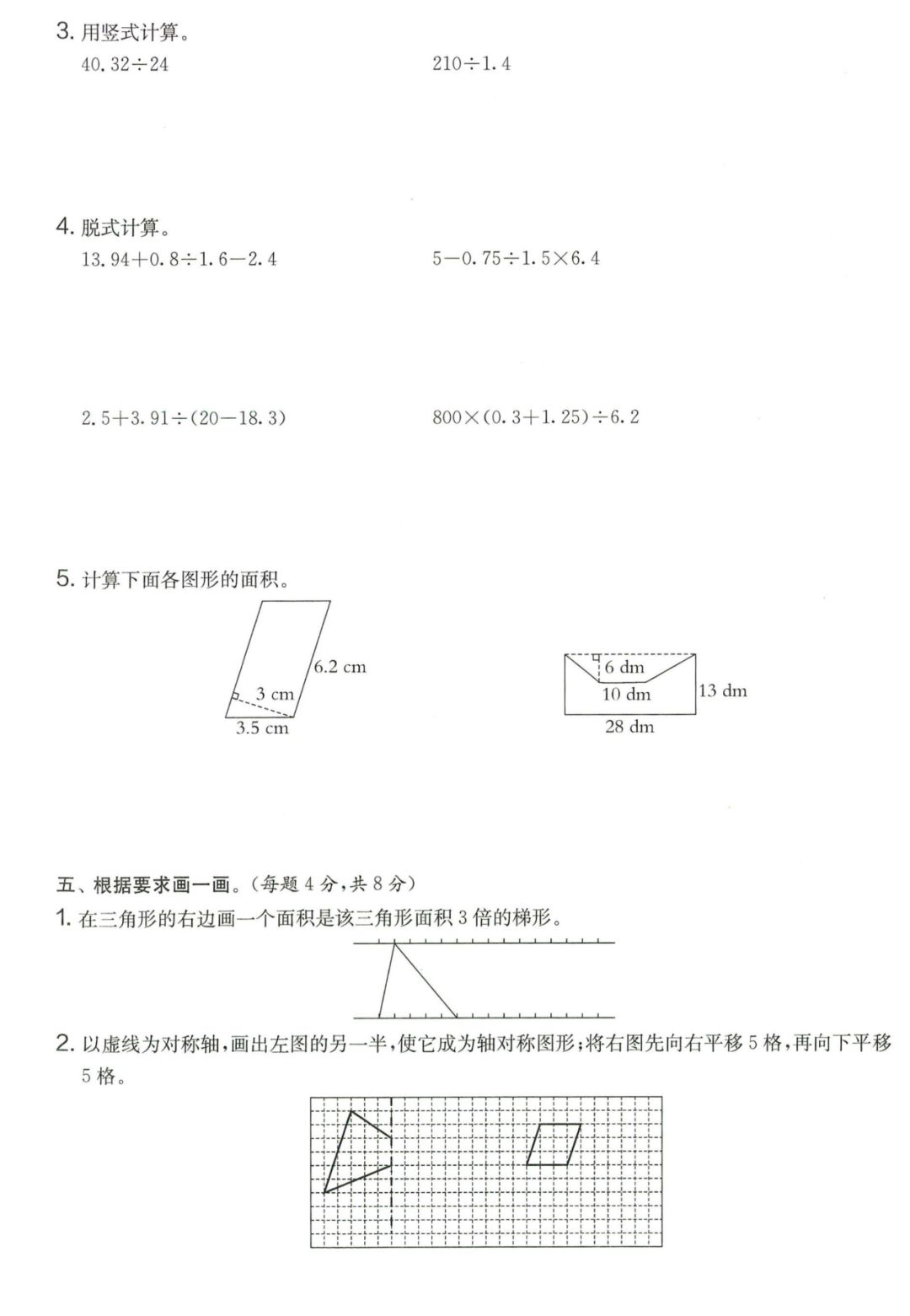 王老师最新整理了小学五年级上册数学期末试卷8套(含答案),附期末必考知识点! 知识点 小数乘法计算法则: 1.先按照整数乘法算出积,再点小数点; 点小数点时,看因数中一共有几位小数,就从积的右起数出几位,点上小数点。 2.一个乘法算式中,一个数(0除外)乘大于1的数,积比原来的数大。如:3×1.2>3一个数(0除外)乘小于1的数,积比原来的数小。如:3×0.8<3 3.积的变化规律:一个因数不变,另一个因数乘或除以几(0除外),积也乘或除以几。 小数除法计算法则: 1.先移动除数的小数点,使它变成整数; 除数的小数点向右移动几位,被除数的小数点也向右移动几位(位数不够的,在被除数的末尾用0补足); 然后按除数是整数的小数除法进行计算。 3.一个除法算式中,当除数小于1时,商比被除数大; 当除数大于1时,商比被除数小。 4.商的变化规律: 被除数与除数同时扩大或者缩小相同的倍数,商不变。 除数不变,被除数乘或除以几(0除外),商也乘或除以几。 被除数不变,除数扩大,商反而缩小;除数缩小,商反而扩大。 5.循环小数一定是无限小数;无限小数不一定是循环小数;有限小数一定不是循环小数。 运算定律: 加法交换律 a+b=b+a 加法结合律 (a+b)+c=a+(b+c) 乘法交换律 a×b=b×a或ab=ba或a·b=b·a 乘法结合律 (a×b)×c=a×(b×c) 或(ab)c=a (bc) 或(a·b )·c=a· (b·c) 乘法分配律 (a+b)×c=a×c+b×c 或(a+b)×c=ac+bc 或(a+b)·c=a·c+b·c 连减 a-b-c 五年级试卷=a-(b+c) 连除 a÷b÷c=a÷(b×c) 正方形的边长用a表示,面积用S表示,周长用C表示,则: 正方形的面积=边长×边长 S= a×a= a2 正方形的周长=边长×4 C= a×4=4 a 长方形的长用a表示,宽用b表示,面积用S表示,周长用C表示,则: 长方形的面积=长×宽 S= a×b = ab 长方形的周长=(长+宽)×2 C=(a+b)×2 路程用s表示,速度用表示v表示,时间用t表示,则: 路程=速度×时间 s=vt 速度=路程÷时间 v=s÷t 时间=路程÷速度 t=s÷v 用a表示商品的单价,x表示数量,c表示总价,则: 总价=单价×数量 c=ax 单价=总价÷数量 a=c÷x 数量=总价÷单价 x=c÷a 用a表示工作效率,用t表示工作时间,用c表示工作总量,则: 工作总量=工作效率×工作时间 c=at 工作效率=工作总量÷工作时间 a=c÷t 工作时间=工作总量÷工作效率 t=c÷a 多边形的面积: 平行四边形的面积=底×高 三角形的面积=底×高÷2 梯形的面积=(上底+下底)×高÷2 植树问题: 两端都不栽 棵树=总长÷间距—1 只栽一端(封闭图形植树) 棵树=总长÷间距 两端都栽 棵树=总长÷间距+1 1、单价、数量和总价 单价×数量=总价 总价÷单价=数量 总价÷数量=单价 2、路程、速度和时间 速度×时间=路程 路程÷速度=时间 路程÷时间=速度 3、工作总量、工作时间和工作效率 工作总量=工作效率×工作时间 工作时间=工作总量÷工作效率 工作效率=工作总量÷工作时间 4、总数和份数 每份数×份数=总数 总数÷每份数=份数 总数÷份数=每份数 5、生活中常用的单位: 质量: 1吨=1000千克;1千克=1000克 长度: 1千米=1000米 1分米=10厘米 1厘米=10毫米 1分米=100毫米 1米=10分米=100厘米=1000毫米 面积: 1平方米= 100平方分米 1平方分米=100平方厘米 1平方千米=100公顷 1公顷=10000平方米 人民币: 1元=10角 1角=10分 1元=100分 期末试卷 01 期末试卷 02 期末试卷 03 期末试卷 04 期末试卷 05 期末试卷 06 期末试卷 07 期末试卷 08 参 考 答 案