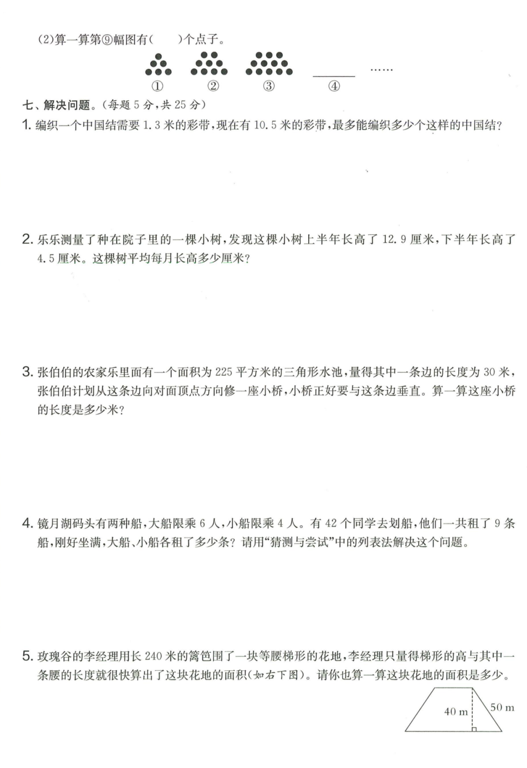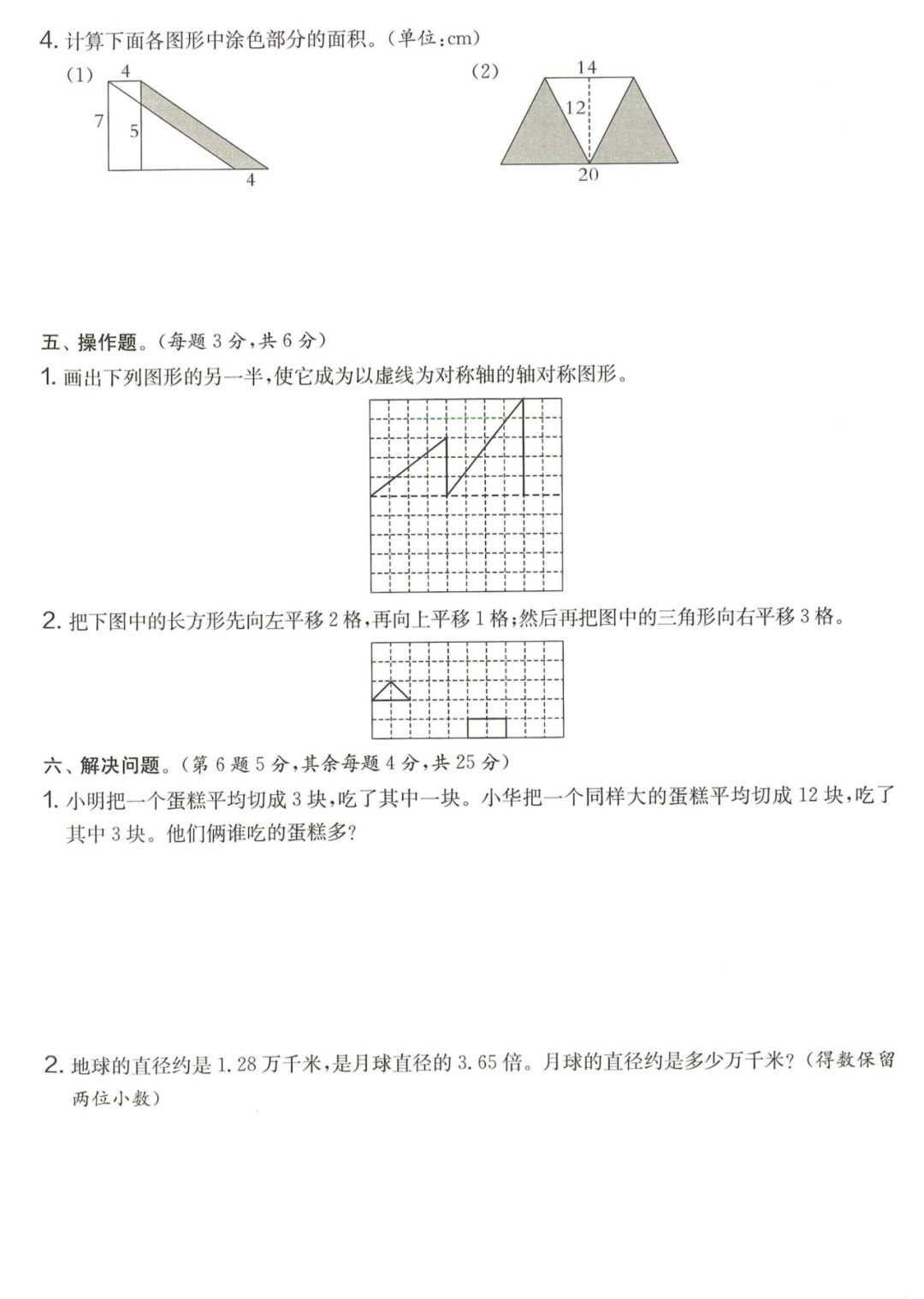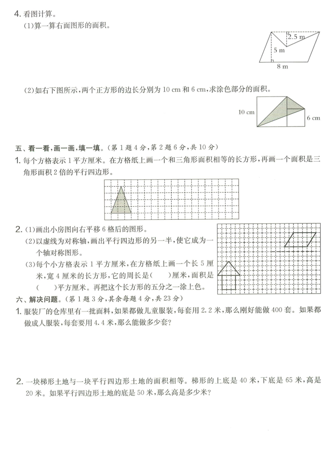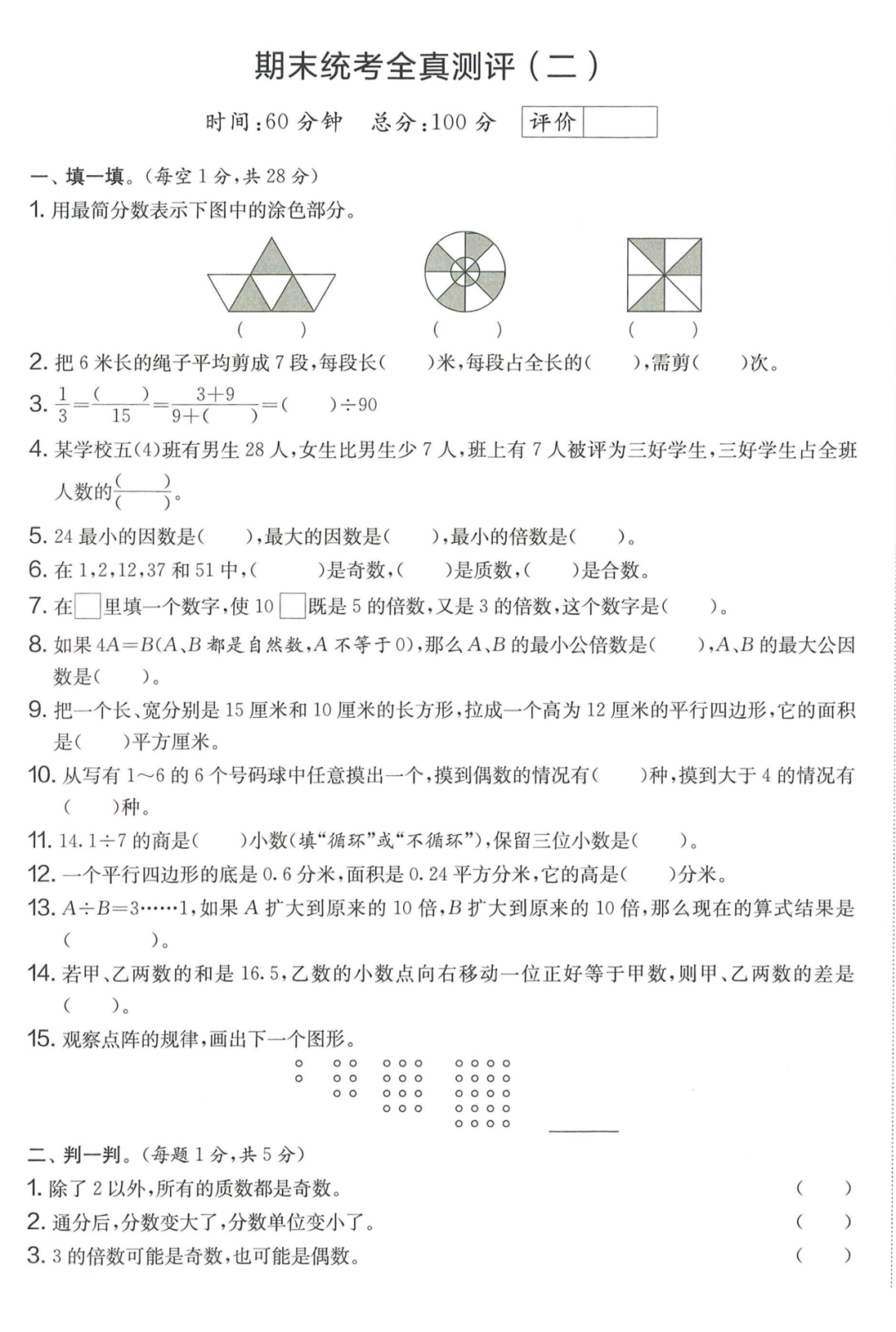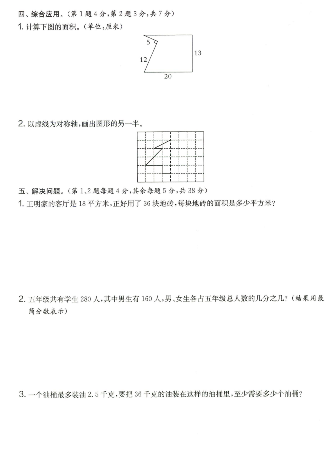 王老师最新整理了小学五年级上册数学期末试卷8套(含答案),附期末必考知识点! 知识点 小数乘法计算法则: 1.先按照整数乘法算出积,再点小数点; 点小数点时,看因数中一共有几位小数,就从积的右起数出几位,点上小数点。 2.一个乘法算式中,一个数(0除外)乘大于1的数,积比原来的数大。如:3×1.2>3一个数(0除外)乘小于1的数,积比原来的数小。如:3×0.8<3 3.积的变化规律:一个因数不变,另一个因数乘或除以几(0除外),积也乘或除以几。 小数除法计算法则: 1.先移动除数的小数点,使它变成整数; 除数的小数点向右移动几位,被除数的小数点也向右移动几位(位数不够的,在被除数的末尾用0补足); 然后按除数是整数的小数除法进行计算。 3.一个除法算式中,当除数小于1时,商比被除数大; 当除数大于1时,商比被除数小。 4.商的变化规律: 被除数与除数同时扩大或者缩小相同的倍数,商不变。 除数不变,被除数乘或除以几(0除外),商也乘或除以几。 被除数不变,除数扩大,商反而缩小;除数缩小,商反而扩大。 5.循环小数一定是无限小数;无限小数不一定是循环小数;有限小数一定不是循环小数。 运算定律: 加法交换律 a+b=b+a 加法结合律 (a+b)+c=a+(b+c) 乘法交换律 a×b=b×a或ab=ba或a·b=b·a 乘法结合律 (a×b)×c=a×(b×c) 或(ab)c=a (bc) 或(a·b )·c=a· (b·c) 乘法分配律 (a+b)×c=a×c+b×c 或(a+b)×c=ac+bc 或(a+b)·c=a·c+b·c 连减 a-b-c 五年级试卷=a-(b+c) 连除 a÷b÷c=a÷(b×c) 正方形的边长用a表示,面积用S表示,周长用C表示,则: 正方形的面积=边长×边长 S= a×a= a2 正方形的周长=边长×4 C= a×4=4 a 长方形的长用a表示,宽用b表示,面积用S表示,周长用C表示,则: 长方形的面积=长×宽 S= a×b = ab 长方形的周长=(长+宽)×2 C=(a+b)×2 路程用s表示,速度用表示v表示,时间用t表示,则: 路程=速度×时间 s=vt 速度=路程÷时间 v=s÷t 时间=路程÷速度 t=s÷v 用a表示商品的单价,x表示数量,c表示总价,则: 总价=单价×数量 c=ax 单价=总价÷数量 a=c÷x 数量=总价÷单价 x=c÷a 用a表示工作效率,用t表示工作时间,用c表示工作总量,则: 工作总量=工作效率×工作时间 c=at 工作效率=工作总量÷工作时间 a=c÷t 工作时间=工作总量÷工作效率 t=c÷a 多边形的面积: 平行四边形的面积=底×高 三角形的面积=底×高÷2 梯形的面积=(上底+下底)×高÷2 植树问题: 两端都不栽 棵树=总长÷间距—1 只栽一端(封闭图形植树) 棵树=总长÷间距 两端都栽 棵树=总长÷间距+1 1、单价、数量和总价 单价×数量=总价 总价÷单价=数量 总价÷数量=单价 2、路程、速度和时间 速度×时间=路程 路程÷速度=时间 路程÷时间=速度 3、工作总量、工作时间和工作效率 工作总量=工作效率×工作时间 工作时间=工作总量÷工作效率 工作效率=工作总量÷工作时间 4、总数和份数 每份数×份数=总数 总数÷每份数=份数 总数÷份数=每份数 5、生活中常用的单位: 质量: 1吨=1000千克;1千克=1000克 长度: 1千米=1000米 1分米=10厘米 1厘米=10毫米 1分米=100毫米 1米=10分米=100厘米=1000毫米 面积: 1平方米= 100平方分米 1平方分米=100平方厘米 1平方千米=100公顷 1公顷=10000平方米 人民币: 1元=10角 1角=10分 1元=100分 期末试卷 01 期末试卷 02 期末试卷 03 期末试卷 04 期末试卷 05 期末试卷 06 期末试卷 07 期末试卷 08 参 考 答 案