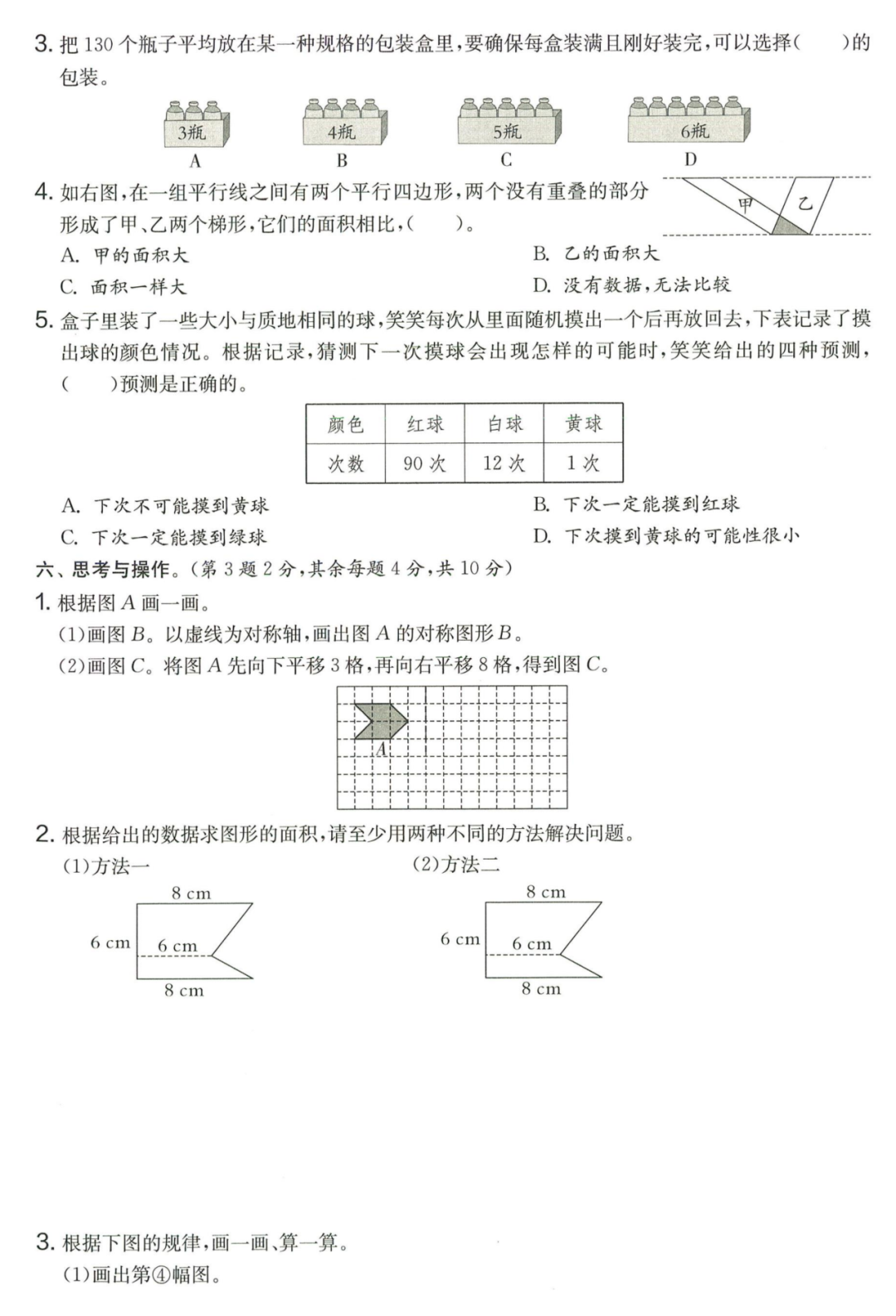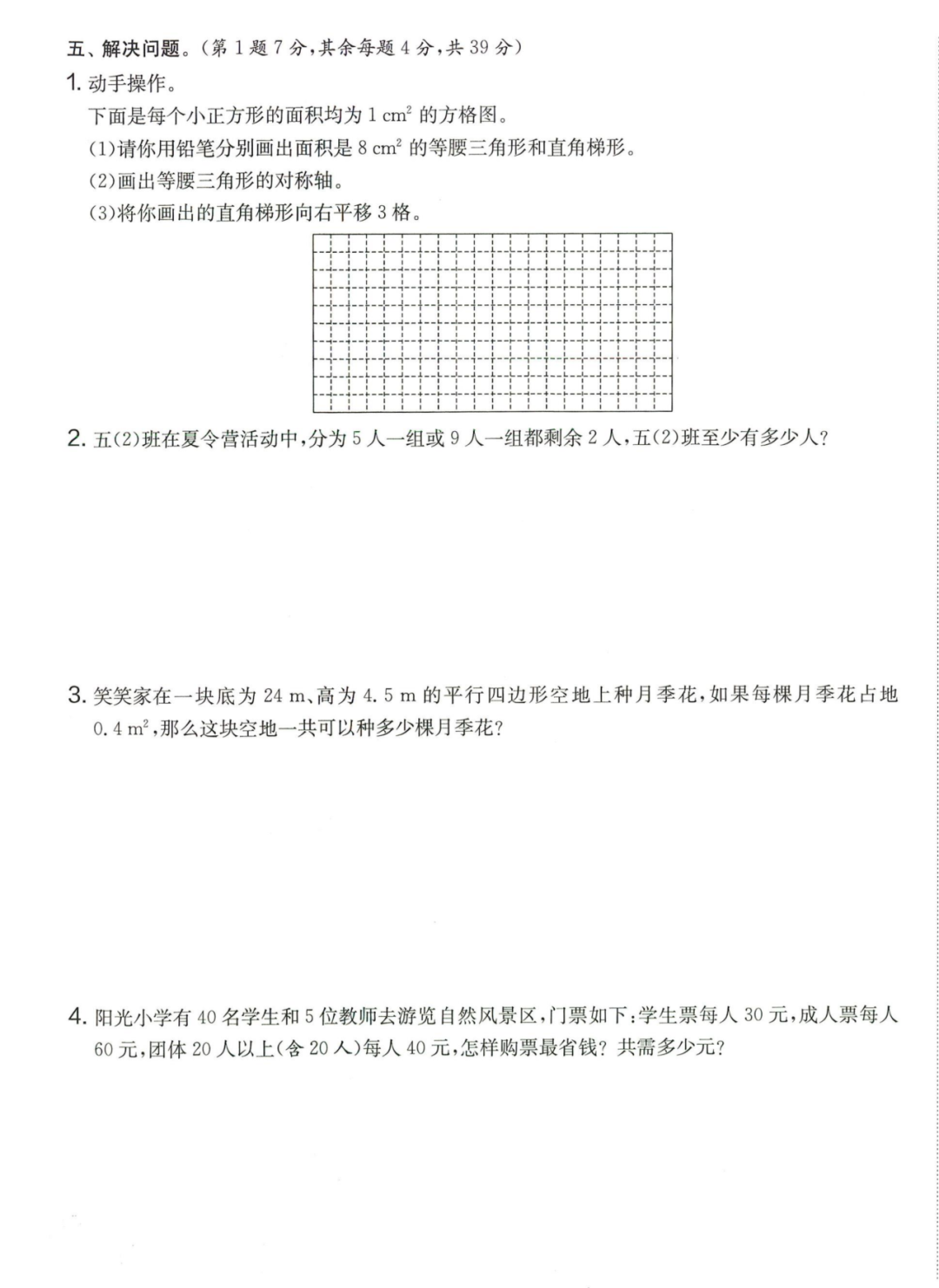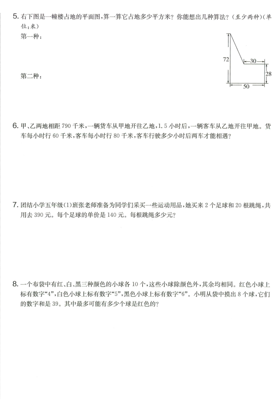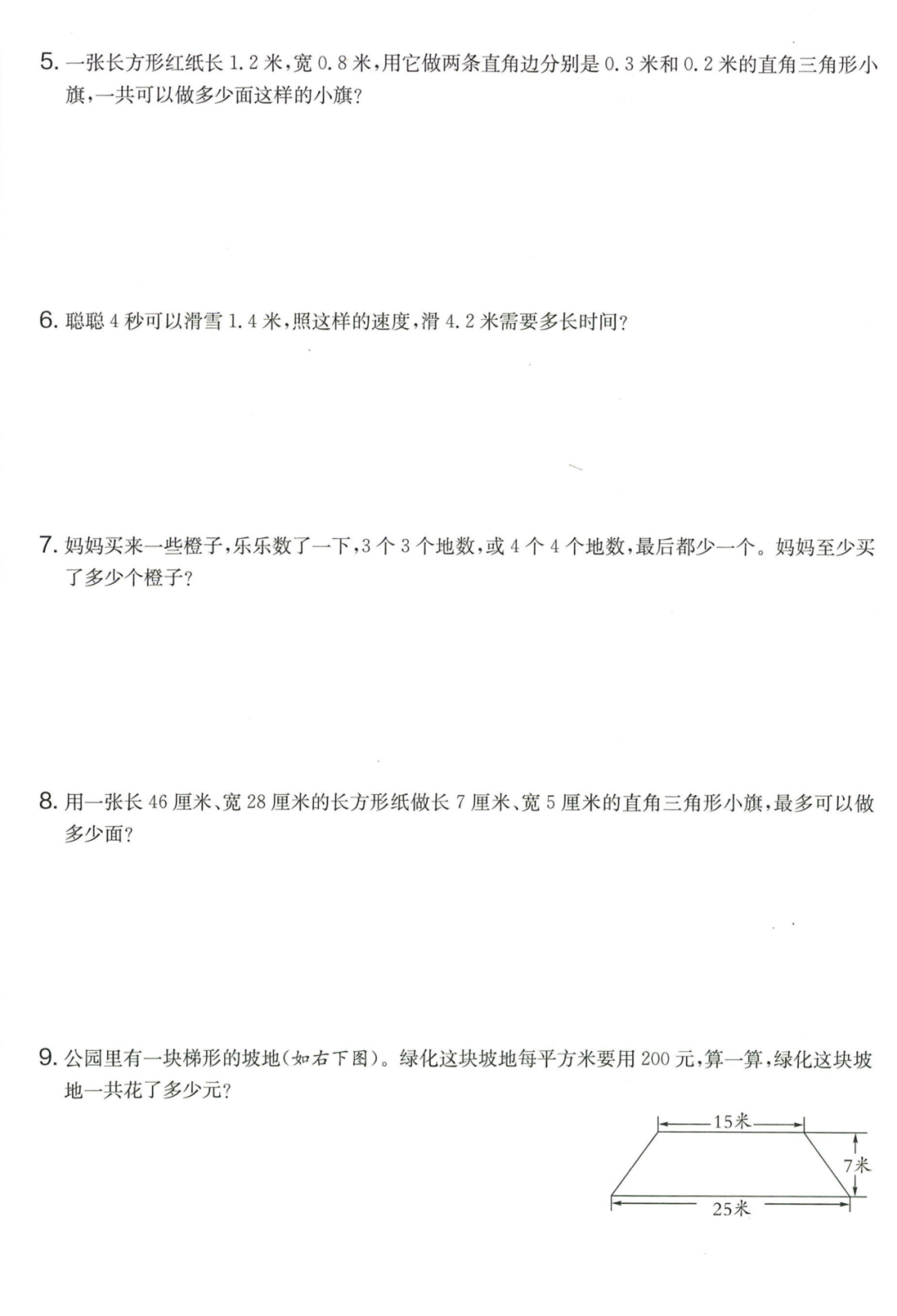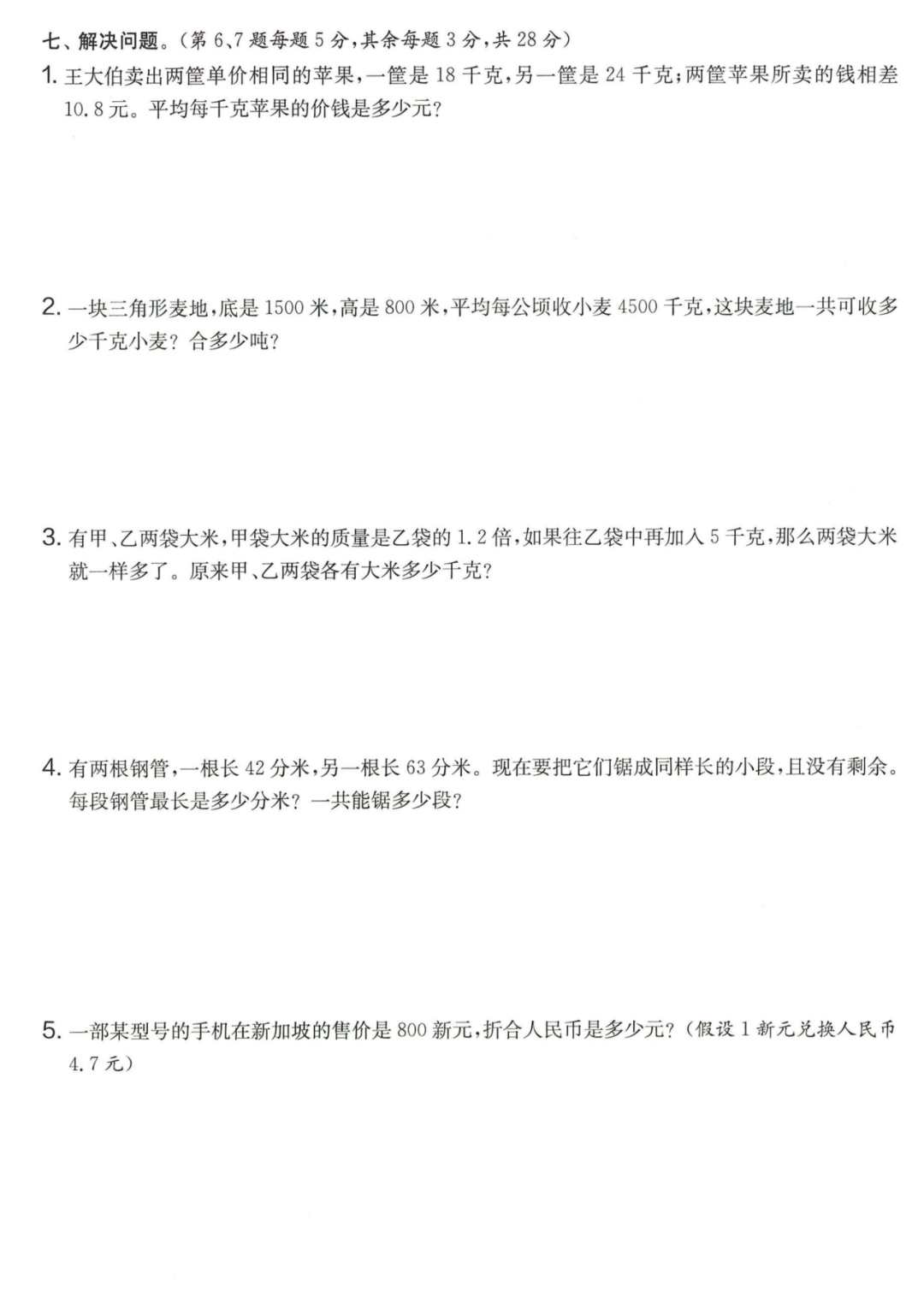 王老师最新整理了小学五年级上册数学期末试卷8套(含答案),附期末必考知识点! 知识点 小数乘法计算法则: 1.先按照整数乘法算出积,再点小数点; 点小数点时,看因数中一共有几位小数,就从积的右起数出几位,点上小数点。 2.一个乘法算式中,一个数(0除外)乘大于1的数,积比原来的数大。如:3×1.2>3一个数(0除外)乘小于1的数,积比原来的数小。如:3×0.8<3 3.积的变化规律:一个因数不变,另一个因数乘或除以几(0除外),积也乘或除以几。 小数除法计算法则: 1.先移动除数的小数点,使它变成整数; 除数的小数点向右移动几位,被除数的小数点也向右移动几位(位数不够的,在被除数的末尾用0补足); 然后按除数是整数的小数除法进行计算。 3.一个除法算式中,当除数小于1时,商比被除数大; 当除数大于1时,商比被除数小。 4.商的变化规律: 被除数与除数同时扩大或者缩小相同的倍数,商不变。 除数不变,被除数乘或除以几(0除外),商也乘或除以几。 被除数不变,除数扩大,商反而缩小;除数缩小,商反而扩大。 5.循环小数一定是无限小数;无限小数不一定是循环小数;有限小数一定不是循环小数。 运算定律: 加法交换律 a+b=b+a 加法结合律 (a+b)+c=a+(b+c) 乘法交换律 a×b=b×a或ab=ba或a·b=b·a 乘法结合律 (a×b)×c=a×(b×c) 或(ab)c=a (bc) 或(a·b )·c=a· (b·c) 乘法分配律 (a+b)×c=a×c+b×c 或(a+b)×c=ac+bc 或(a+b)·c=a·c+b·c 连减 a-b-c 五年级试卷=a-(b+c) 连除 a÷b÷c=a÷(b×c) 正方形的边长用a表示,面积用S表示,周长用C表示,则: 正方形的面积=边长×边长 S= a×a= a2 正方形的周长=边长×4 C= a×4=4 a 长方形的长用a表示,宽用b表示,面积用S表示,周长用C表示,则: 长方形的面积=长×宽 S= a×b = ab 长方形的周长=(长+宽)×2 C=(a+b)×2 路程用s表示,速度用表示v表示,时间用t表示,则: 路程=速度×时间 s=vt 速度=路程÷时间 v=s÷t 时间=路程÷速度 t=s÷v 用a表示商品的单价,x表示数量,c表示总价,则: 总价=单价×数量 c=ax 单价=总价÷数量 a=c÷x 数量=总价÷单价 x=c÷a 用a表示工作效率,用t表示工作时间,用c表示工作总量,则: 工作总量=工作效率×工作时间 c=at 工作效率=工作总量÷工作时间 a=c÷t 工作时间=工作总量÷工作效率 t=c÷a 多边形的面积: 平行四边形的面积=底×高 三角形的面积=底×高÷2 梯形的面积=(上底+下底)×高÷2 植树问题: 两端都不栽 棵树=总长÷间距—1 只栽一端(封闭图形植树) 棵树=总长÷间距 两端都栽 棵树=总长÷间距+1 1、单价、数量和总价 单价×数量=总价 总价÷单价=数量 总价÷数量=单价 2、路程、速度和时间 速度×时间=路程 路程÷速度=时间 路程÷时间=速度 3、工作总量、工作时间和工作效率 工作总量=工作效率×工作时间 工作时间=工作总量÷工作效率 工作效率=工作总量÷工作时间 4、总数和份数 每份数×份数=总数 总数÷每份数=份数 总数÷份数=每份数 5、生活中常用的单位: 质量: 1吨=1000千克;1千克=1000克 长度: 1千米=1000米 1分米=10厘米 1厘米=10毫米 1分米=100毫米 1米=10分米=100厘米=1000毫米 面积: 1平方米= 100平方分米 1平方分米=100平方厘米 1平方千米=100公顷 1公顷=10000平方米 人民币: 1元=10角 1角=10分 1元=100分 期末试卷 01 期末试卷 02 期末试卷 03 期末试卷 04 期末试卷 05 期末试卷 06 期末试卷 07 期末试卷 08 参 考 答 案