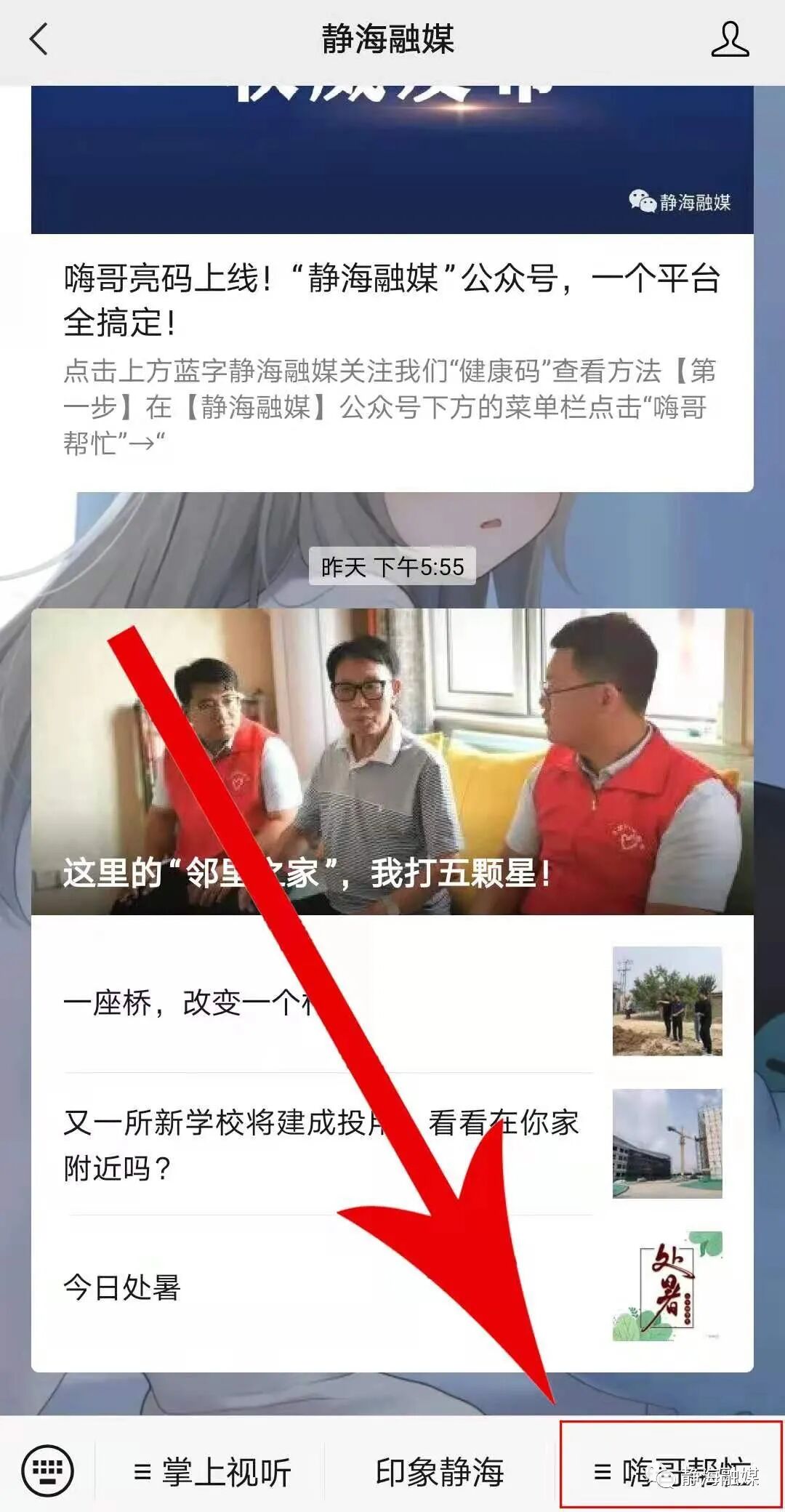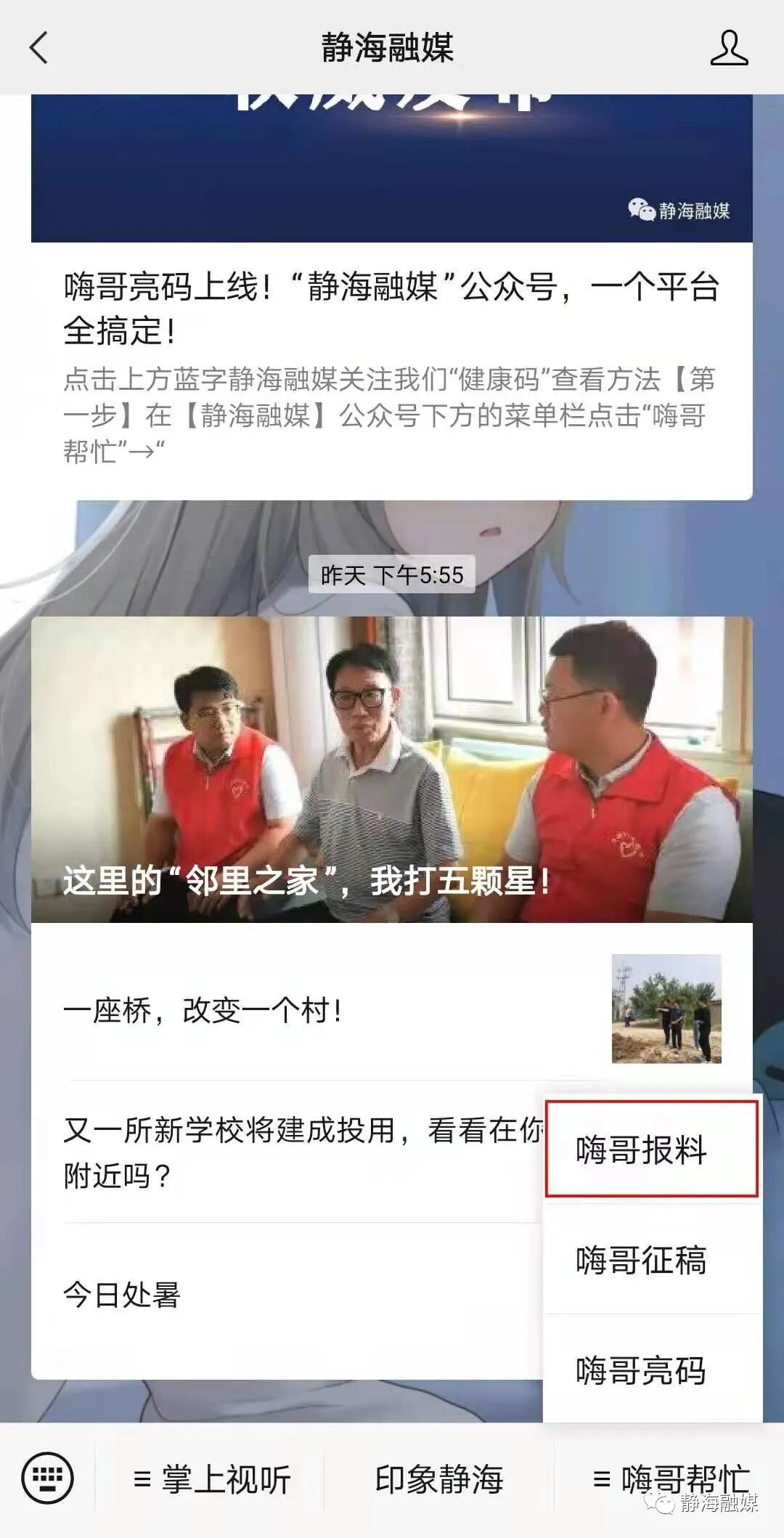 新鲜事儿? 高兴事儿? 你想让更多的人了解吗? 你想把心里话 讲给更多的人听吗? 欢迎到嗨哥这里报料! 烦心事儿? 揪心事儿? 也请讲给嗨哥听 嗨哥尽力帮你想办法! 静海融媒即日起公开征集新闻线索,倘若非要加个期限的话,我希望是一万年…… 即日起~~~~~ 方法很简单 在【静海融媒】公众号下方的菜单栏点击“嗨哥帮忙”→“嗨哥报料” 在“嗨哥报料”下留言 或 给报料邮箱 jhqmcf@163.com 发送邮件 你的报料 嗨哥 会第一时间筛选 与你联系核实 跟进采访报道 你可以持续关注 静海融媒 了解权威资讯和发展动态 END 制作:范蕾 责任编辑:郭媛媛 监制:宋琨 往期回顾 嗨哥亮码上线!“静海融媒”公众号,一个平台全搞定! 牢记初心使命 争取更大光荣丨2000只土鹅!在苹果园里撒欢儿! 这堂防性侵的“公益课”,爸妈和孩子们一定要补上! 静云app 点它,分享点赞在看都在这里~![]()