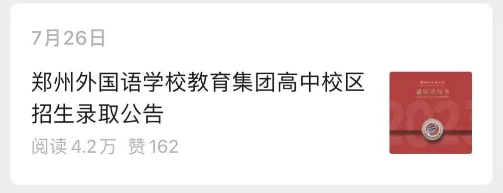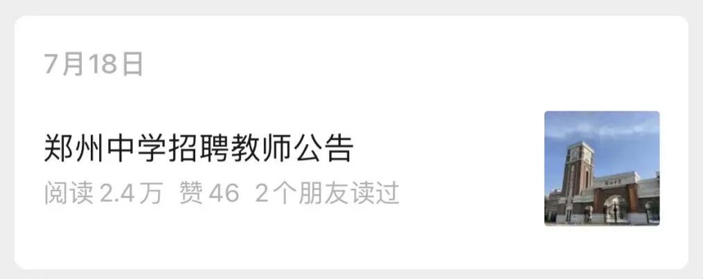 除了招生录取的相关内容外,招聘公告也是本月高中、中职院校的主要内容选题,郑州中学、郑州外国语学校均在本月发布了相关推文。本月热文榜排名第三的文章是郑州中学的推文《郑州中学教师招聘公告》,获得了23076的阅读量。该文言简意赅地公布了学校的招聘要求,为优秀人才更好地了解学校的招聘标准提供了渠道,发挥了信息服务功能,取得了良好的传播效果。
