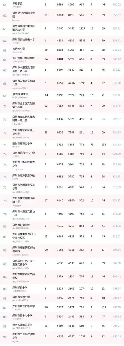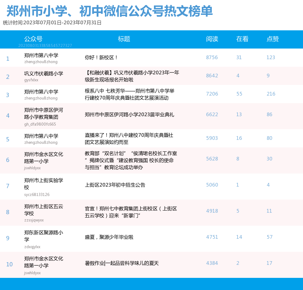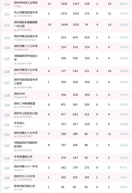除郑州市上街区五云学校之外,本月另有一些学校表现优异,成功跻身7月Top10榜单,包括郑州龙门实验学校、郑州市金水区文化路第一小学、郑州市中原区伊河路小学教育集团、管外人,都有显著进步,成绩值得肯定。其中,上月在小学、初中微信公众号榜单中排名第14位的郑州龙门实验学校本月进步明显,跃居榜单第三位,各项数据均有较大幅度增长,可喜可贺。