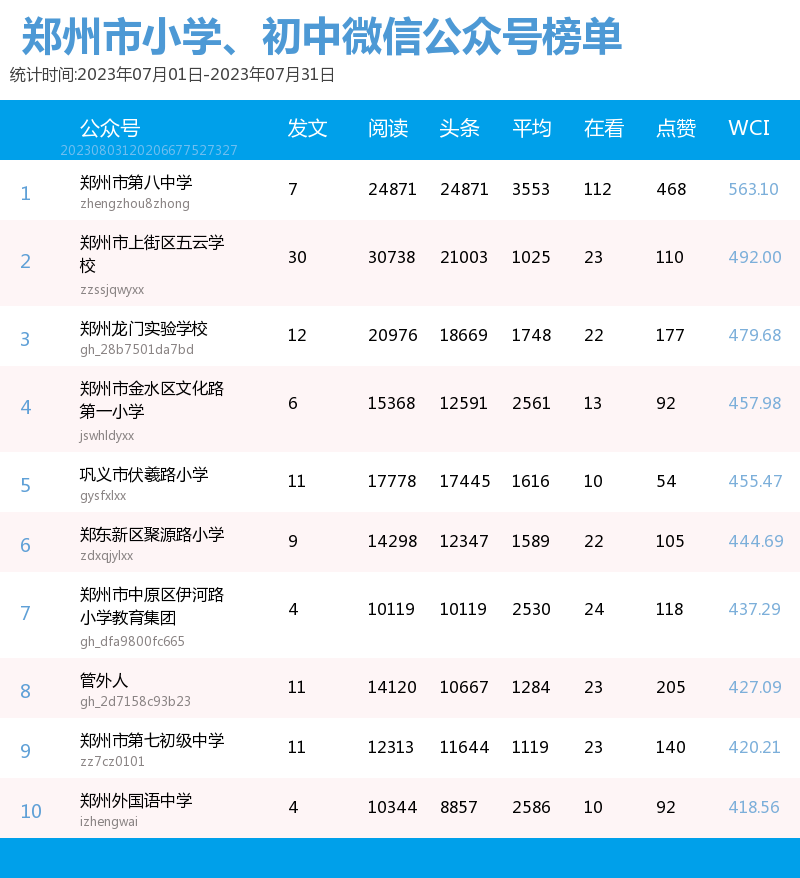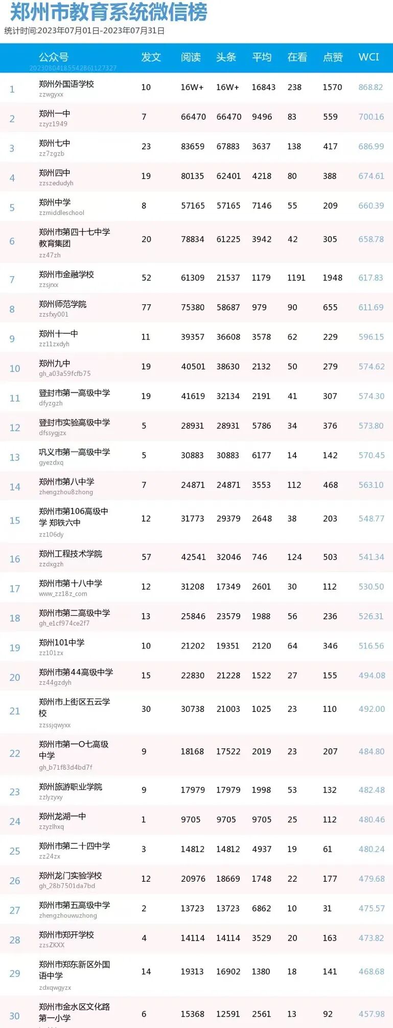 7月份,郑州市教育系统微信传播力各项数据与上月相比均有有明显下降。正值暑假期间,各校微信公众号更新频率放缓,其中文章发布次数为912次,文章总数为1470篇,较上月大幅减少,因而阅读总数、在看总数以及平均WCI值也有所降低,分别为182W+、3895、320.76。微信公众号是各校传递教育教学信息、回应社会关切、营造良好形象的重要渠道,望各校账号短暂沉淀之后,面向未来,合理规划,提升账号活跃度,争取各项数据止跌回升。