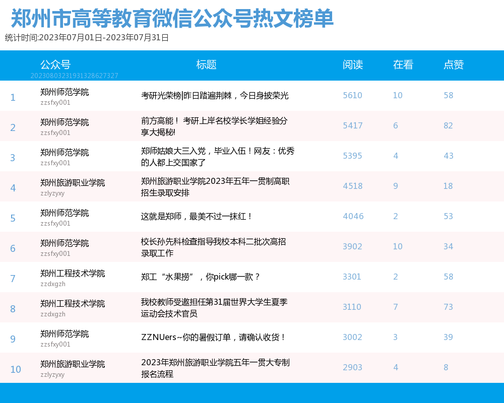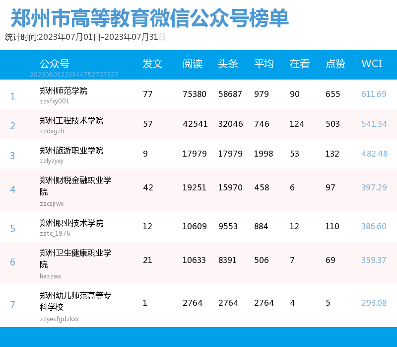 本月郑州市高等教育类7个微信公众号共发布文章121次,文章总数为219,阅读总数为179157,在看数为296,与上月相比均有大幅下降,因而带动本月WCI指数有所下降,由上月的521.18降至本月的438.84。7月正值暑假,各校教育教学活动减少,固然是导致微信公众号传播力下降的客观因素,但各账号运营主体仍需从主观上寻找原因,高度重视新媒体平台及时传递信息、服务师生、塑造学校品牌形象的综合功能,从而策划、产出更多优质内容,提升传播力、影响力。