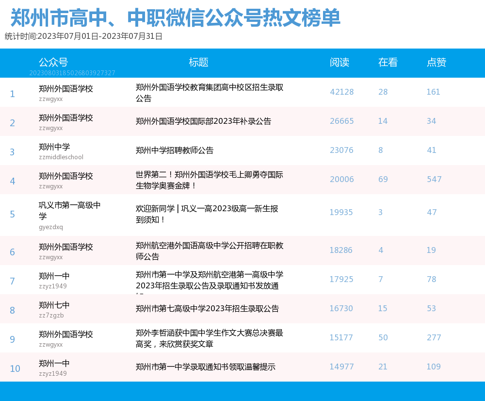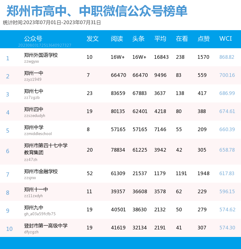 7月,郑州外国语学校凭借16W+的阅读量和868.82的WCI指数,继续领跑其他学校账号,蝉联郑州市高中&中职类微信公众号榜单第一名。但与上月相比,该微信公众号的发文数量与阅读总量等各项数据均有所下滑,再看数、点赞数低于榜单第七名的郑州市金融学校,望该账号能持之以恒,再接再厉,尤其是重视提升互动效果,提高账号活跃度,取得长久的进步和发展。