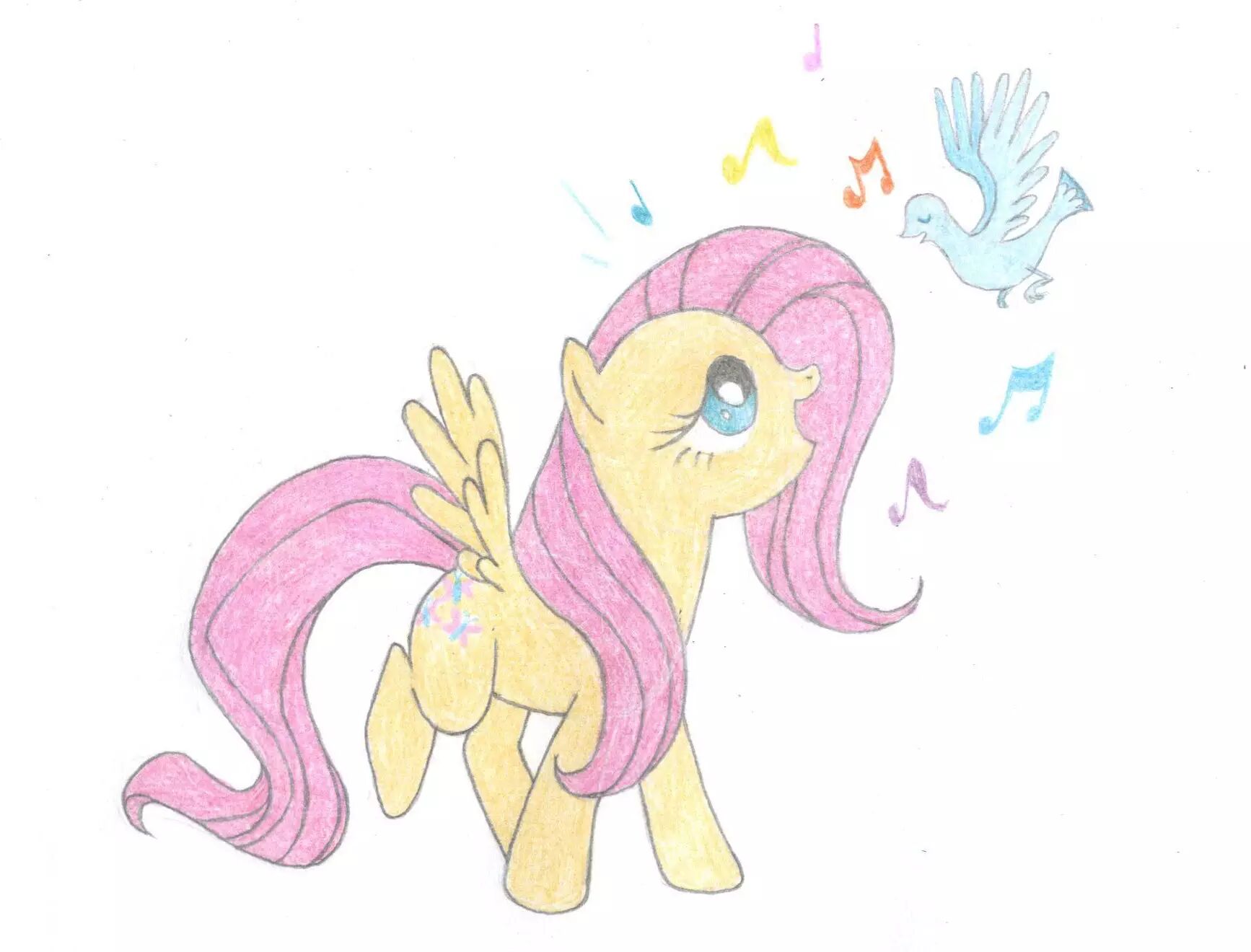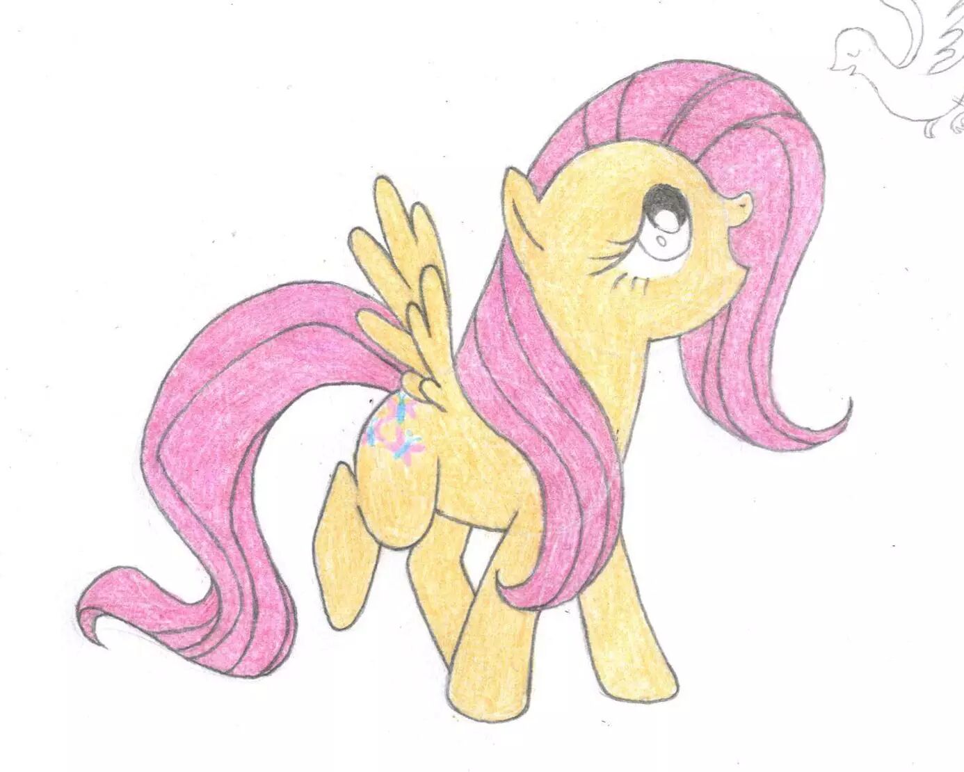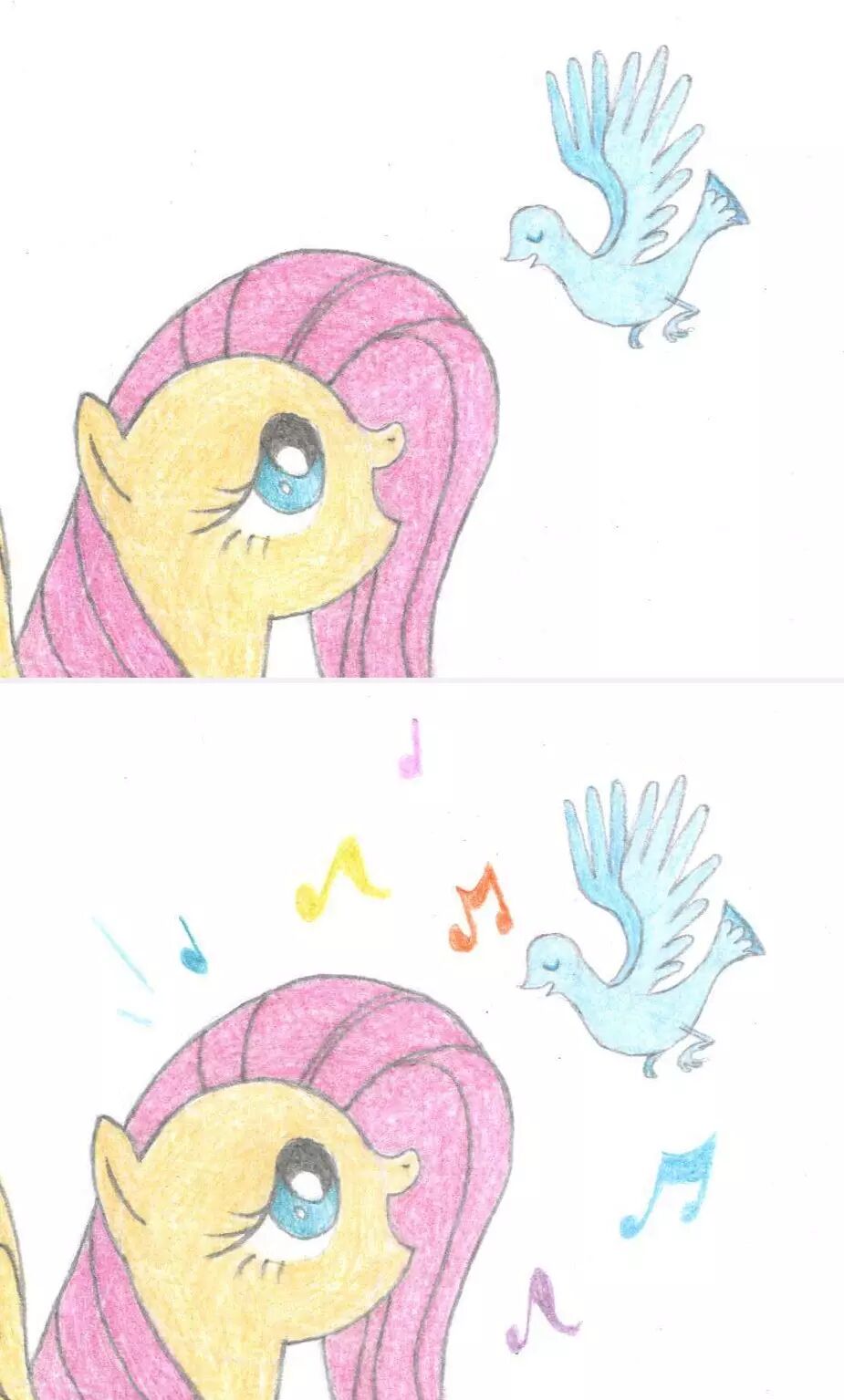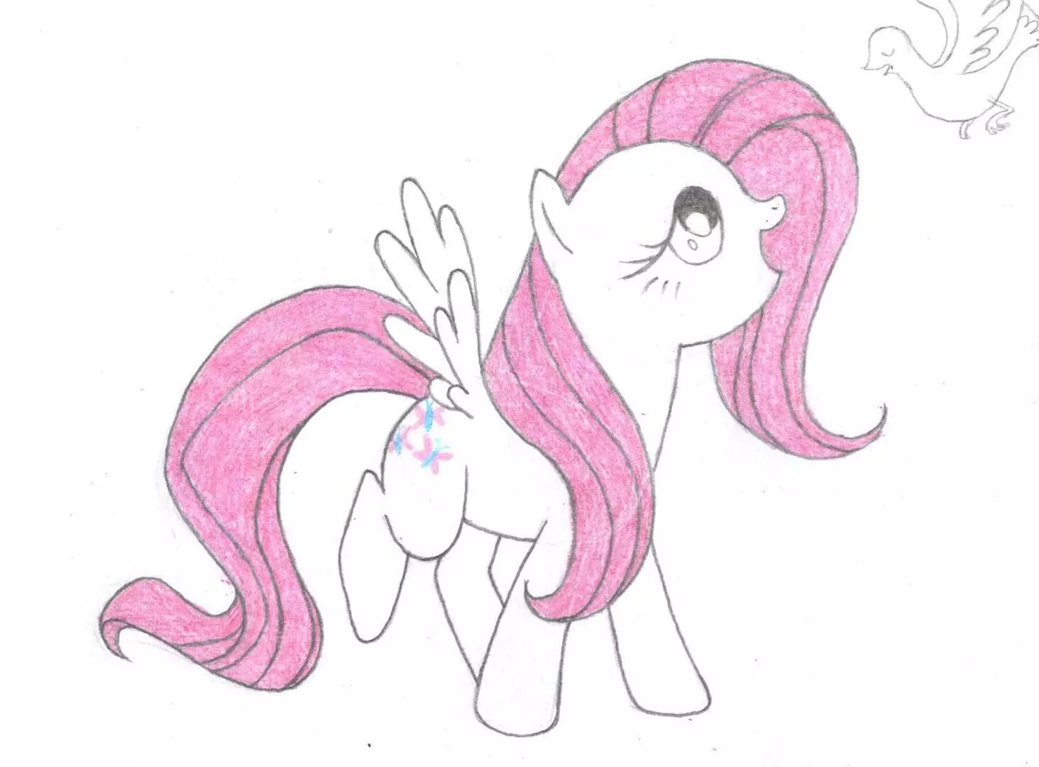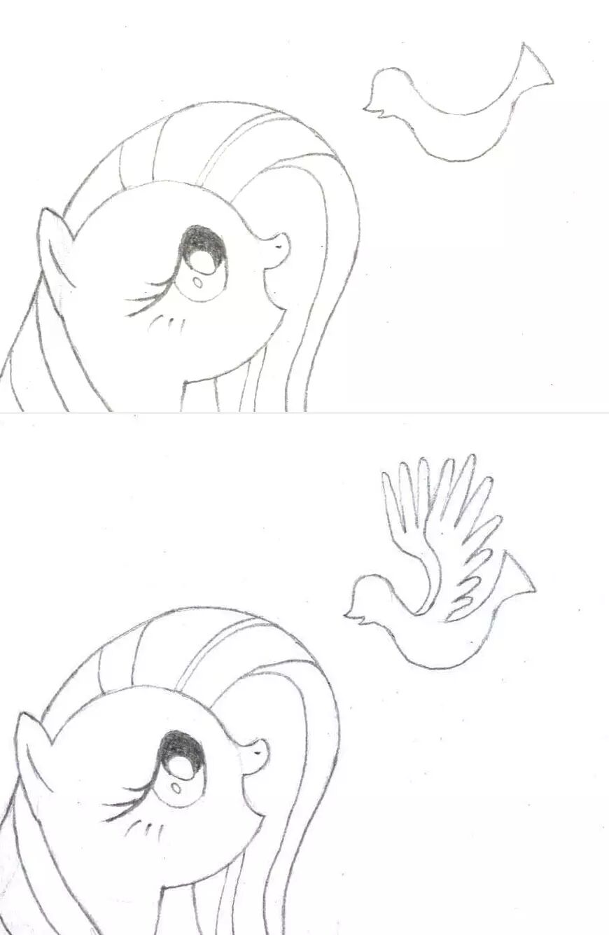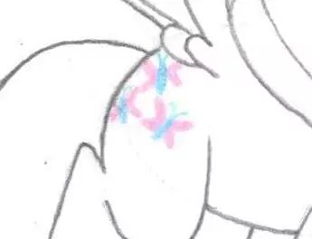14,下面我们可以拿出彩铅,给柔柔和小鸟上颜色咯~我们跟往常一样,先把小马的可爱标志画出来,柔柔的可爱标志是三只蝴蝶。
