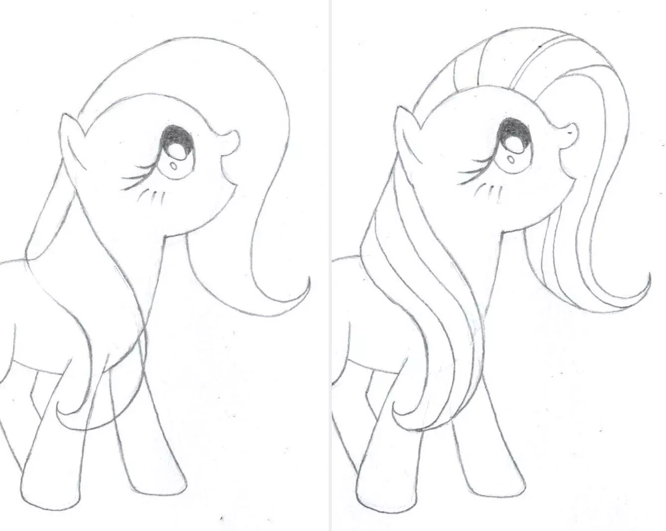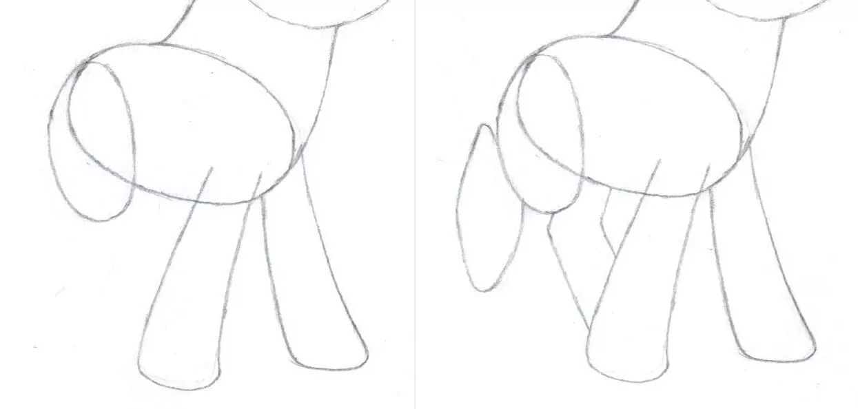 4,将右后腿的椭圆和菱形连接一起,组成真正的小马腿。(虚线表示上一张的痕迹,需要擦掉,而实线表示这张我们要画的)