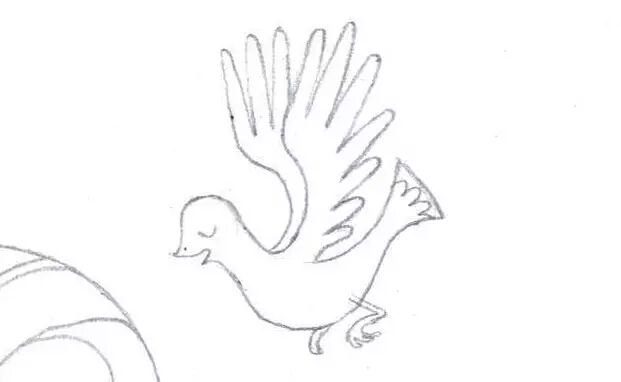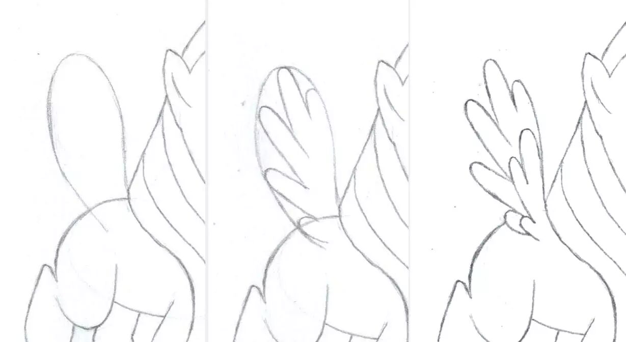 9,接着我们画翅膀。我们先在柔柔的马背上画出一个开口椭圆,在这个椭圆形范围里画出想粗手指一样的翅膀形状。