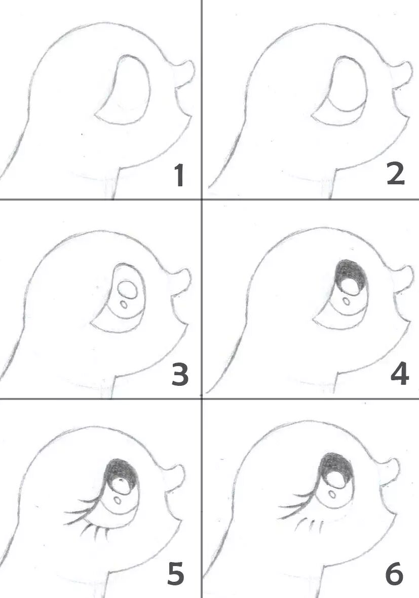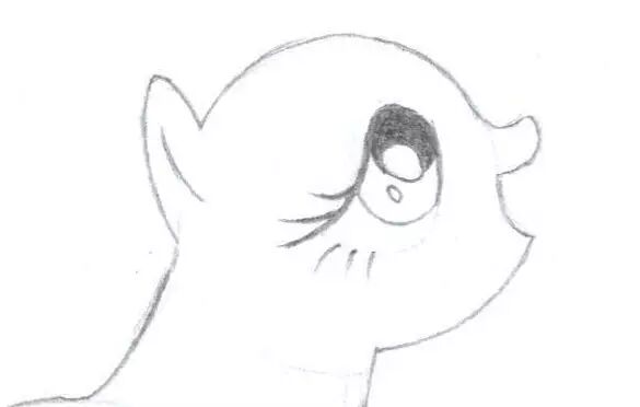 6,现在画柔柔的眼睛。不知道小朋友们观察过没有,柔柔的眼睛别的小马不一样,她的眼皮并没有上扬,而往下的,这表明她真的是一只眼神温柔、善良的小马哦~第一步我们画出柔柔眼睛的大体形状,然后在里面画一个椭圆,在这个椭圆里分别画出一小一大的2个椭圆,在大椭圆的上方画出一个大一点的椭圆并将它涂黑。把柔柔的眼线加粗,也画出6根睫毛,然后将多余的线条擦掉。