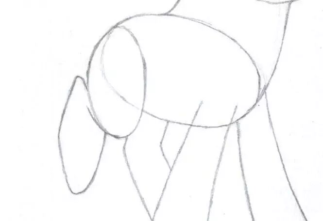 3,接着我们画出柔柔的后腿。首先在屁股的地方画一个几乎垂直的椭圆,在这个椭圆的左边画出一个圆角的菱形。然后画出只露出一点的左后腿。