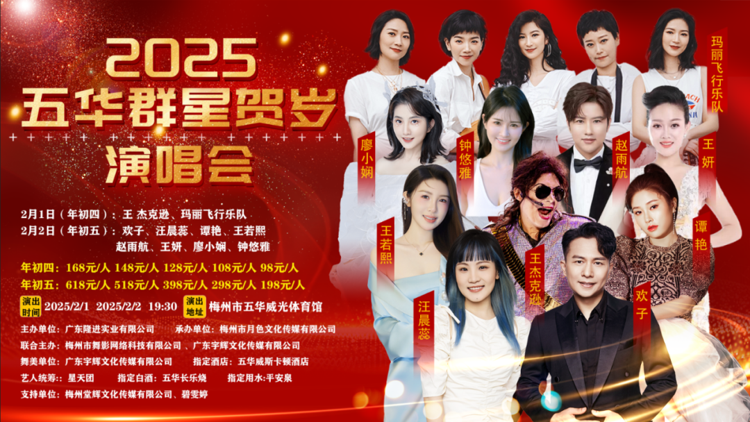 群星演唱会2025五华群星贺岁演唱会The Era concert青春岁月2025年2月1日(年初四)19:30分: 王 杰克逊、玛丽飞行乐队2025年2月2日(年初五)19:30分: 欢子、汪晨蕊、谭艳、王若熙、 赵雨航、王妍、廖小娴地点:梅州市五华县五华威光体育馆年初四:王杰克逊 群星演唱会全球迈克杰逊传承第一人 全球迈克杰逊传承第一人,荣获CCTV《快乐乡约新春盛典》中央电视台年度魅力人物奖,上海世博会“杰出贡献奖”、世界和谐基金会“和谐之星”等荣誉。CCTV-1、CCTV-3、CCTV-4、CCTV-7、CCTV-10、美国CNN 、美联社、凤凰卫视《鲁豫有约》、湖南卫视等国内外多家知名频道专访,活跃于中东、非洲、美国等10个国家,个人演唱会关注度最高的模仿艺人。联和国UNESCO和平勋章获得者!好莱坞签约特型演员、奥斯卡、夏纳电影节特邀嘉宾,受MJ家族认可的中非旅游大使,全球巡演30个国家! 王·杰克逊在迈克尔杰克逊逝世十周年之际,在纽约、华盛顿等美国主要城市举行《 LOVE MJ 经典致敬》世界巡回演唱会,取得空前成功。玛丽飞行乐队中国国内唯一一支由亲姐妹组合而成的女子乐队代表作:《冒险超人》《灰色的梦》 《面上妆》《活着》《彩虹之光》风格:流行、朋克、摇滚曾参加安徽卫视“中国民歌会”栏目2015年参加:浙江卫视“中国梦想秀”栏目,现场圆梦成功,12月参加:CCTV3中央电视台综艺频道“群英汇”栏目最佳乐队2010年11月参加:中国,龙南第三届客家围屋文化旅游节大型明星演唱会2014年9月应邀参加:贵州凯里”亚洲天王天后”群星演唱会,11月应邀参加:中国华南首届华为四方文化艺术节”华伟四方”群星演唱会2015年5月2016 华语乐坛 韶关站,经典金曲 群星演唱会嘉宾。2019 中国漯河 首届音乐节 演出嘉宾年初五:欢子华语乐坛情歌王子 欢子是华语乐坛极具代表性的情歌王子,他的音乐风格以深情、伤感为主,总能用歌声将爱情中的酸甜苦辣诠释得淋漓尽致。《愚爱》《原谅我一次》《心痛 2009》《得到你的人却得不到你的心》《其实很寂寞》等歌曲承载了一代人的青春回忆,对于很多 80 后、90 后来说,他的歌是青春岁月中不可或缺的一部分。 欢子不仅是一位优秀的歌手,还是一位才华横溢的词曲创作人、音乐制作人。在娱乐圈中,欢子一直保持着低调谦逊的品质。他不追求名利,专注于音乐创作,用音乐来表达自己的情感和态度。他的这种品质赢得了歌迷的尊重和喜爱,也让人们更加欣赏他的音乐,听着他的歌,人们会想起那些曾经美好的时光,那些青涩的爱情、纯真的友谊和奋斗的岁月。去看他的演唱会,不仅是欣赏音乐,更是一次与青春的重逢,一场回忆的盛宴年初五:汪晨蕊中 国 内 地 女 歌 手 汪晨蕊是一位极具实力的中国内地流行乐女歌手,出生于梅州市兴宁市。毕业于星海音乐学院。被誉为“能唤起华语乐坛黄金一代记忆的声音”代表作:《当年情》《友情岁月》《爱情转移》《你还要我怎样》2016年,参加浙江卫视《中国新歌声》的比赛,最终获得那英组冠军、全国总决赛季军。2017年,推出与汪苏泷合唱的歌曲《携手同行》年初五:谭艳中 国 内 地 女 歌 手 代表作:《光明》《碎心石》《南山南》 《突然的幸福》 2005年谭艳参加湖南卫视综艺节目“超级女声”;2013年参加江西卫视综艺节目《妈妈来了》,获得江西卫视《妈妈来了》第一季冠军。音乐人吴宗宪评价谭艳为“天生的歌者”,香港TVB全球华人新秀歌唱大赛内地赛区冠军2013年,发行个人专辑《舍爱》 。 2015年,发行第一首原唱歌曲《突然的幸福》;2014年-2016年,陆续发行个人HIFI专辑《听爱》,《等爱》,《最走心好声音》《一吻之间》,《爱别离》 。年初五:王若熙中国女歌手和演员代表作:《你或许深爱过》、《二两仙》《不羡鸳鸯不羡仙》毕业于天津音乐学院,并在2012年参加央视《星光大道》后开始走红。王若熙以其独特的音乐风格和才华横溢的表演在娱乐圈中获得了广泛的认可。她的音乐作品包括多首单曲,如《没有你活不下去》、《一百万个可能》、《你是猪吗》、《像个孩子》、《怎随天下》、《凡烟》、《上林赋》和《江湖难》等。此外,王若熙还活跃在影视领域,参演了电影《年轻人的漂泊生活》年初五:赵雨航内地新生代十佳男歌手代表作《温柔向南》《北航》《陪你去闯荡》毕业于河北传媒学院,快乐男声上海区十强,青川形象推广大使,2009年8月联合索卡尼推出自己首张单曲《全是为你》《是我的错》《死也在一起》。2015年12月推出单曲《醉在爱情里》。年初五:廖小娴中国内地歌手代表作《祈祷》《红雪莲》2013年参加央视《星光大道》,以精彩的表现征服现场嘉宾评委和观众荣获周赛冠军和月赛冠军,与"细哥"陈晨光在2010年的山歌新秀比赛中崭露头角,获得金奖;年度总决赛中“细哥细妹”组合进入年度六强。参加过很多国家级的比赛,如《红婚纱》、《桃花雨》等。在第四届中国(梅州)国际客家文化节上,获得山歌新秀表演金奖的她随团多次到香港、台湾、印尼演出,并受到印尼总统的接见。年初五:王妍中国内地民歌手代表作《幸福中国一起》《灯火里的中国》演员、民歌手,毕业于河南师范大学音乐系中央电视台 CCTV(幸福账单)节目演出嘉宾深圳海外联谊会艺术团一法国站演出香港回归二十六周年文艺汇演嘉宾时间:2025年2月1日-2日 (大年初四、初五晚上19:30)地点:五华威光体育馆