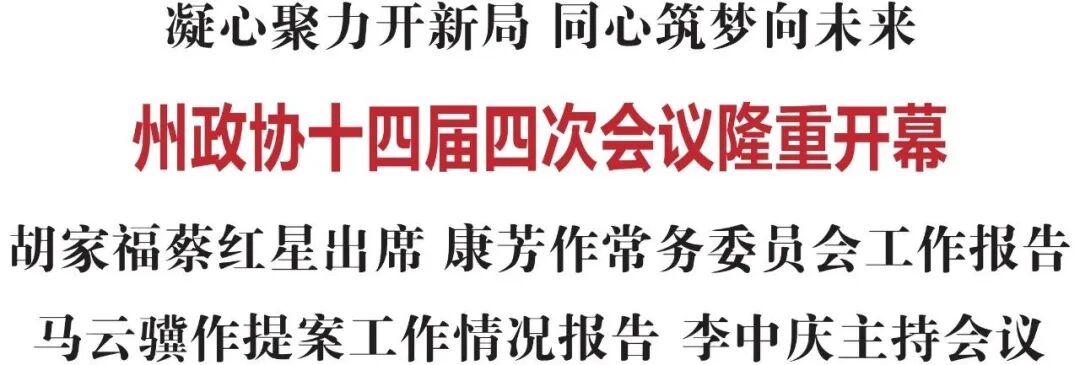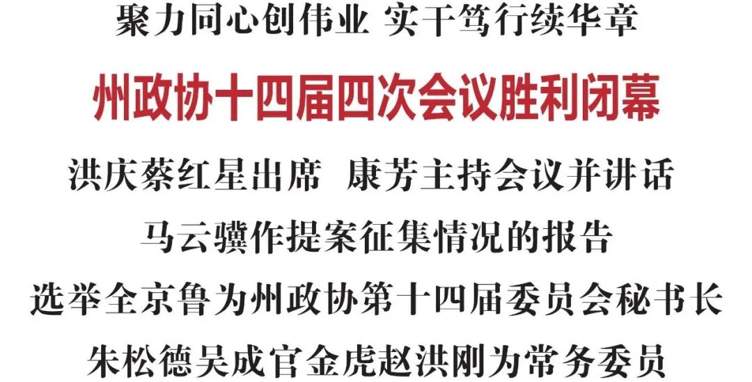 博物馆事业以及提升种业企业发展质量与活力等方面,通过较为翔实的数据分析和深入的实证研究,提出有针对性的对策建议。马云骥作关于州政协十四届四次会议提案征集情况的报告。会议根据《选举办法》,就有关人事事项举行了投票选举。选举全京鲁为州政协第十四届委员会秘书长,朱松德、吴成官、金虎、赵洪刚等四人为常务委员。康芳在闭幕会讲话中指出,这次大会是在全州上下深入学习贯彻党的二十大和二十届二中、三中全会精神,全面贯彻落实省、州委全会战略部署的重要时刻召开的一次重要会议。会议期间,广大政协委员以胸怀全局的政治站位、助力发展的责任担当、心系民生的履职情怀,献良策、谋共识、促发展,充分彰显了专门协商机构的独特优势和全过程人民民主的生机活力。会议发扬民主、务实高效,是一次风清气正、凝心聚力、团结奋进的大会。康芳强调,2025年是全面贯彻落实党的二十届三中全会精神的关键之年,也是“十五五”规划谋篇布局之年。州委十二届七次、八次全会为我州未来发展描绘了宏伟蓝图,也对政协工作提出了更高要求。全州各级政协组织和广大政协委员要围绕州委全会的安排部署,加强思想政治引领,始终把党的领导贯穿政协工作全过程各方面,确保政协事业始终沿着正确政治方向笃定前行。要坚持围绕中心服务发展大局,积极参与改革、服务改革,助推改革“蓝图”变成“实景”。要以铸牢中华民族共同体意识为主线,充分发挥统一战线组织作用和大团结大联合的政治优势,在创新履职实践中增进共识,在加强团结联谊中凝聚共识,在扩大朋友圈、画好同心圆、增强向心力上凝聚人心、汇聚力量。要践行人民政协为人民理念,完善常态化联系界别群众机制,推动委员“微建议”办理,满足群众“微心愿”,促进政协反映社情民意、联系群众、服务人民机制落地落实、见行见效。要健全深度协商互动、意见充分表达、广泛凝聚共识的机制,按照“懂政协、会协商、善议政,守纪律、讲规矩、重品行”的要求加强“两支队伍”建设,提升委员履职的执行力和创新力,为进一步全面深化改革、着力打造沿边开放新高地,建设中国式现代化新延边而团结奋斗!(延边日报全媒体记者 葛威/文 延边晨报全媒体记者 孙旸/图)
