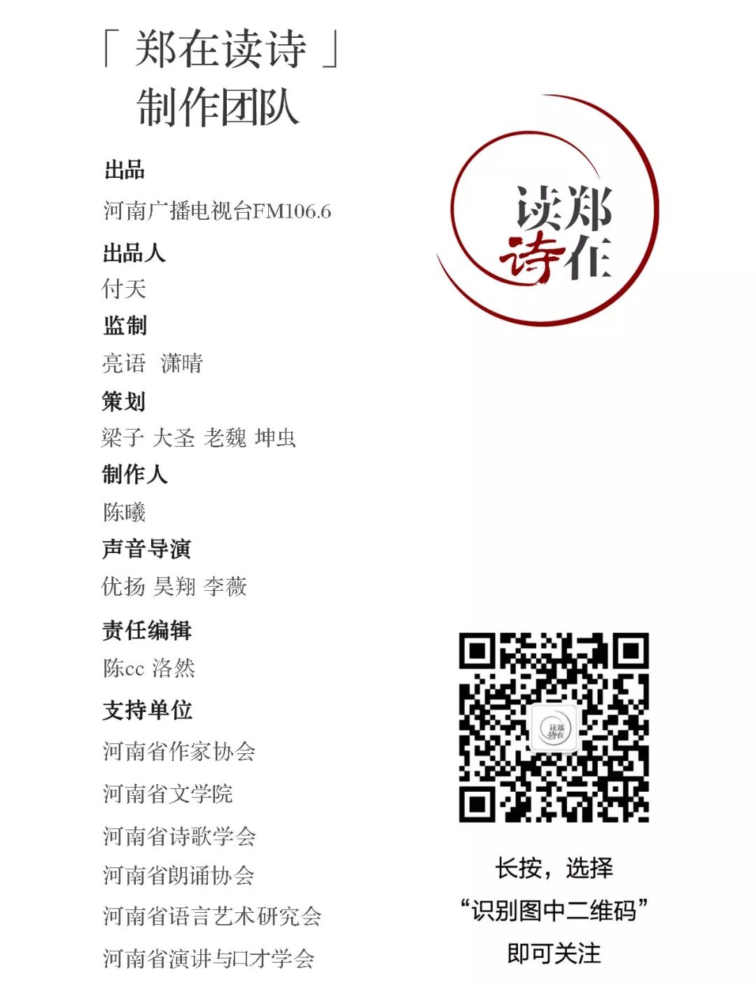 本微信公众平台读诗音频、视频、文字及视觉设计系“郑在读诗”团队制作。个人或媒体转载时请务必注明出处为“郑在读诗”,微信公众号转载必须获得授权。