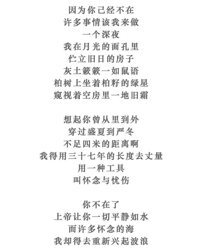 这首冯杰怀念母亲的诗,将多少人带进了回忆里那所旧日的房子,伫立其中,眼眶浸润,贪恋每个匆忙掠过的身影和那温慈宠溺的眼神,就是还想像个孩子一样任性,不肯往后退去半步。